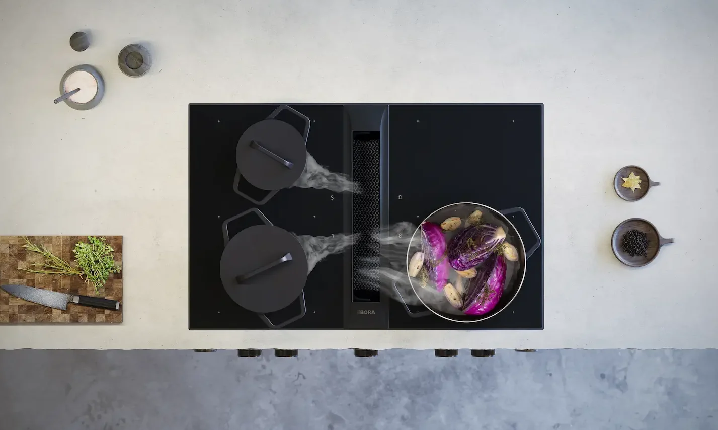 Los más eficaces son las campanas de techo, las placas con extractor integrado y los sistemas downdraft. En el mercado, Pando, BORA y Miele ofrecen soluciones avanzadas en estas categorías.