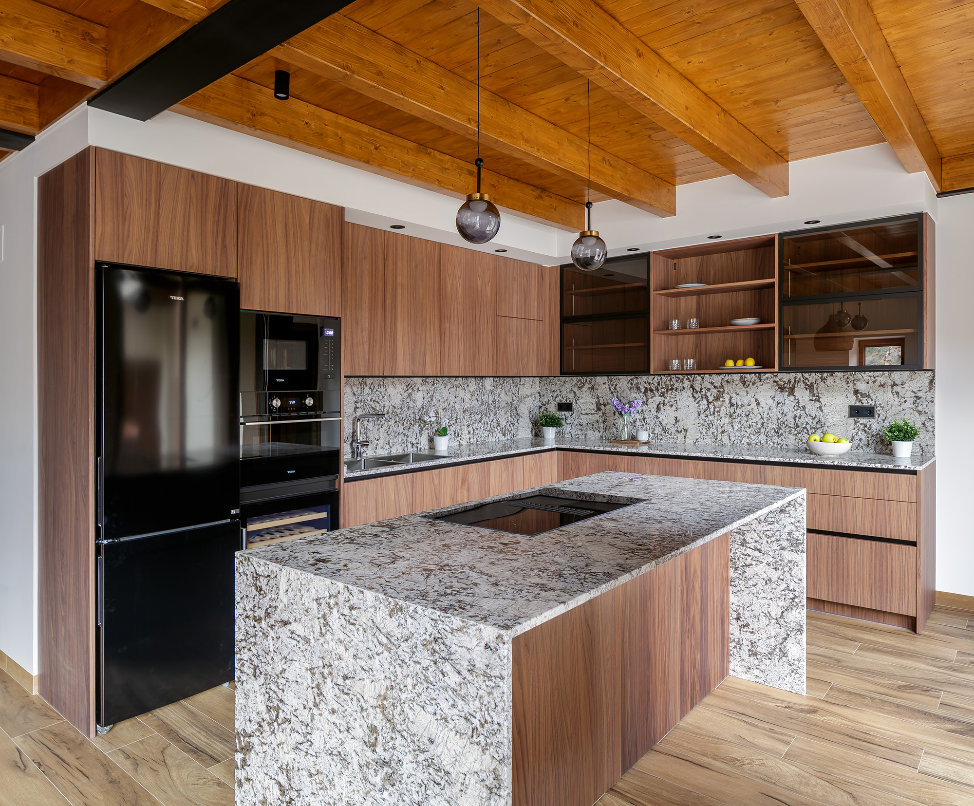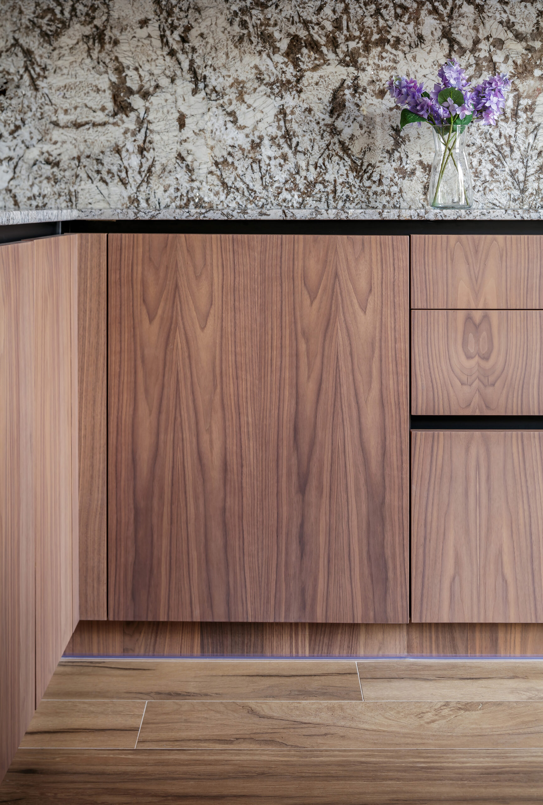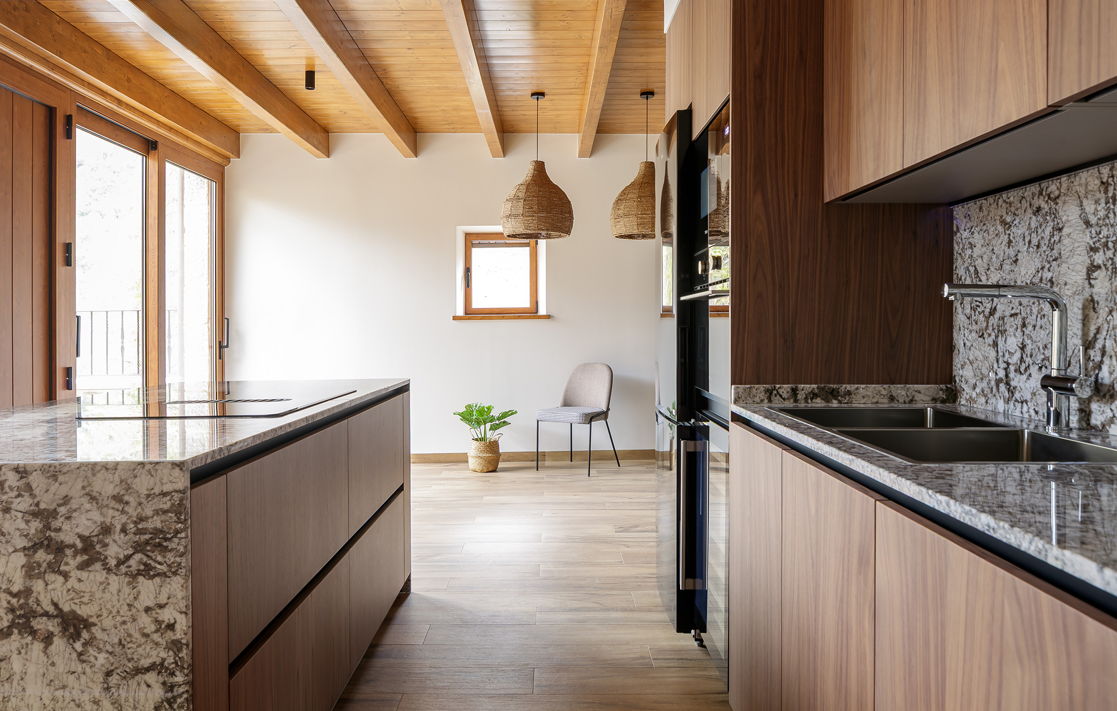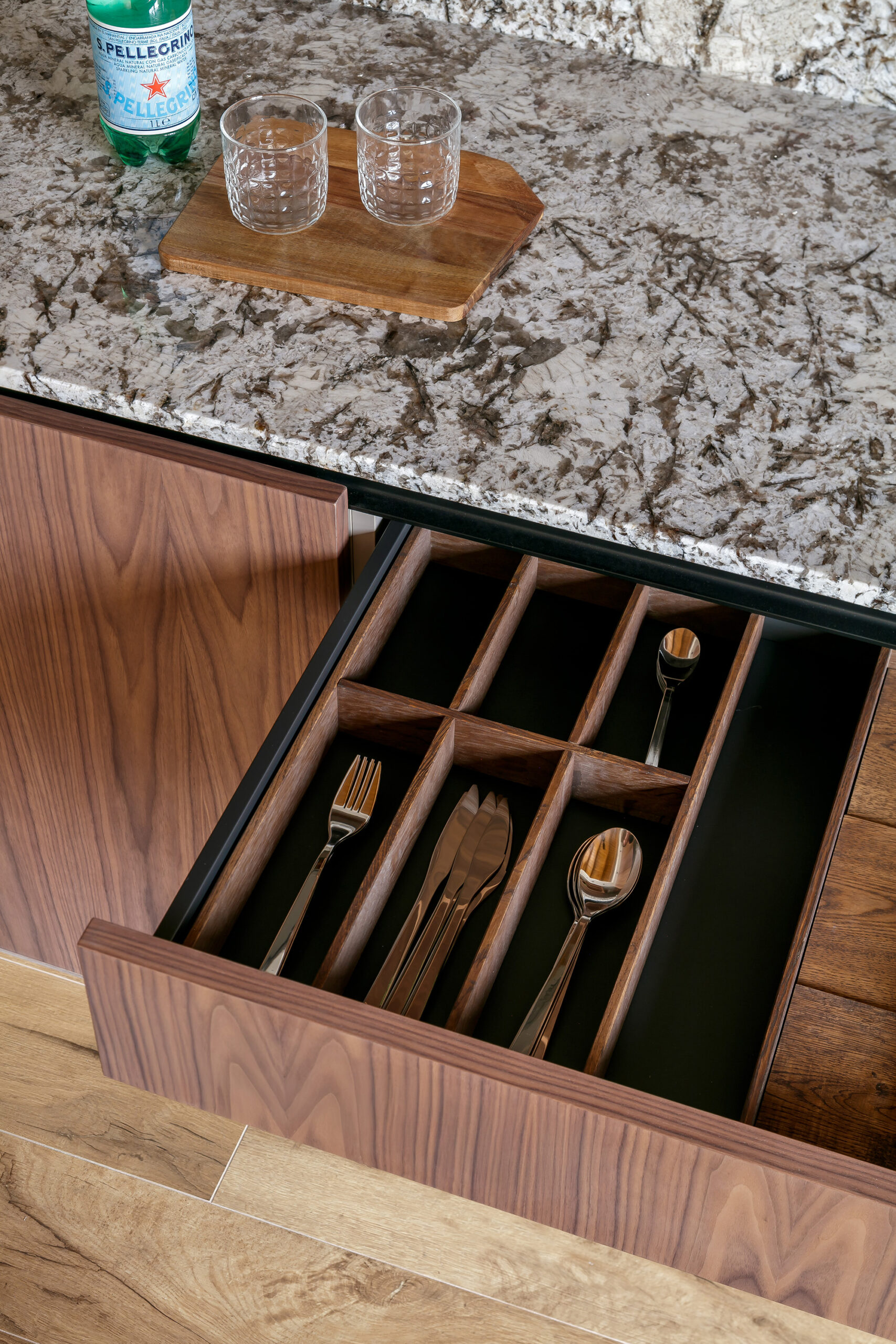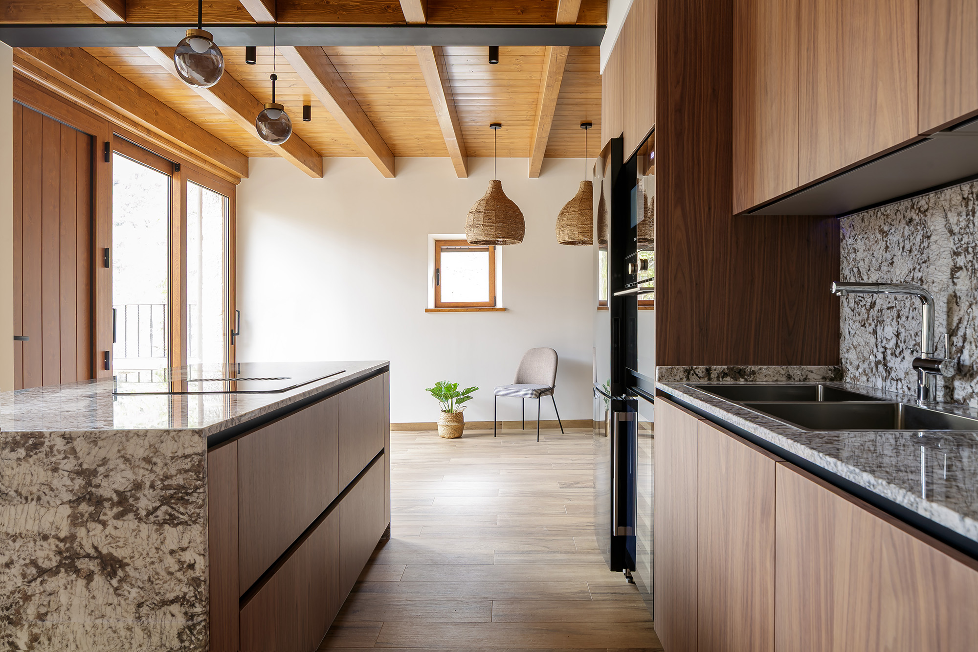 Los frentes del mobiliario de cocina, pertenecientes al modelo BAIKAL de INKO y acabados en chapa natural de nogal, aportan calidez, textura y una lectura visual uniforme. La apertura mediante gola negra permite mantener un conjunto limpio, sin elementos añadidos. En la parte superior predominan los muebles cerrados, mientras que el cierre del ángulo incorpora dos vitrinas con marco negro y cristal parsol bronce junto a un módulo abierto en la misma madera, creando un punto focal discreto pero elegante. En la parte baja, el encuentro entre los dos tramos se aprovecha mediante un sistema de rincón FlyBox con botellero lateral, optimizando un área que suele perderse. Bajo los muebles altos, la iluminación técnica de D’Aqua LUX aporta luz directa a la encimera y subraya el tono cálido del nogal.