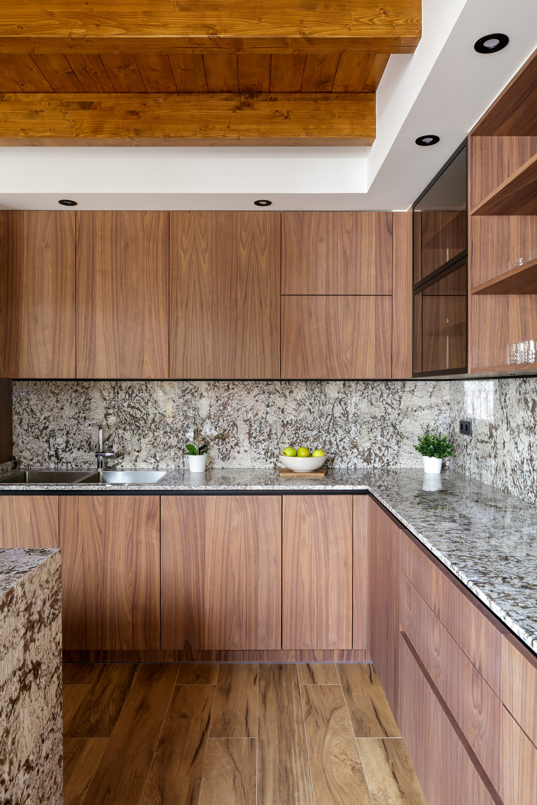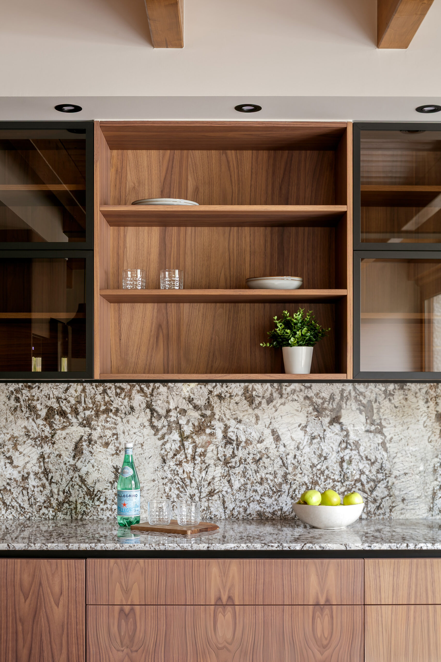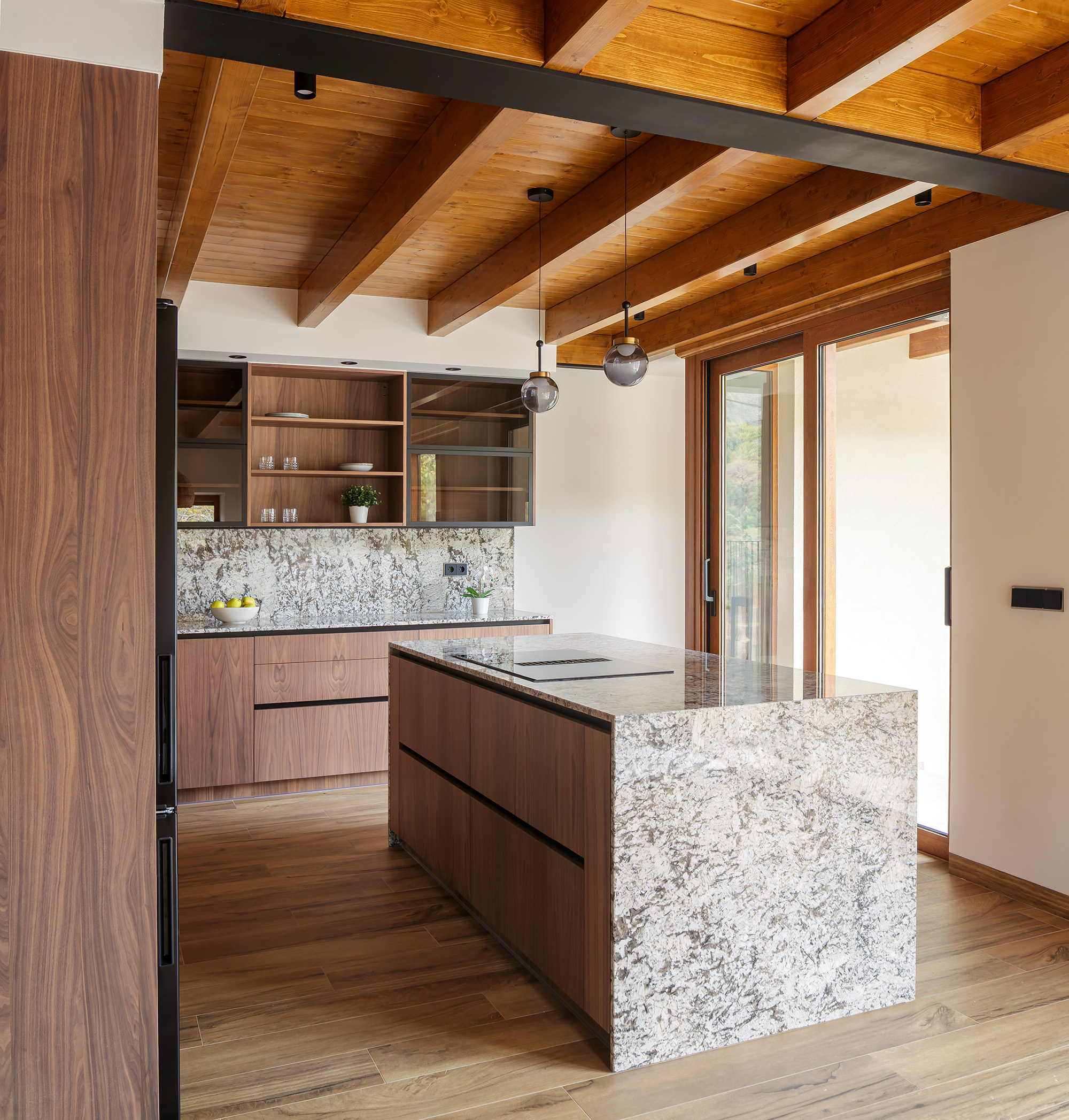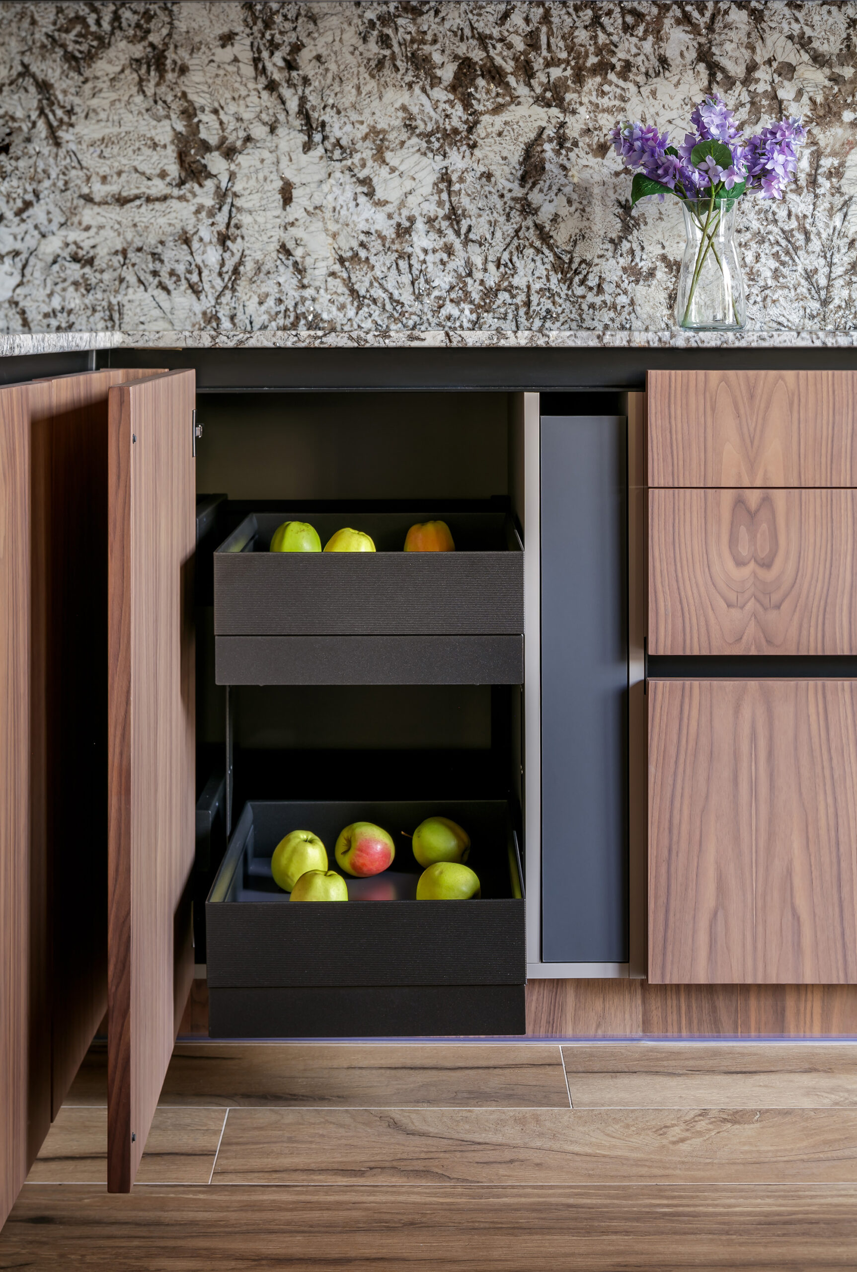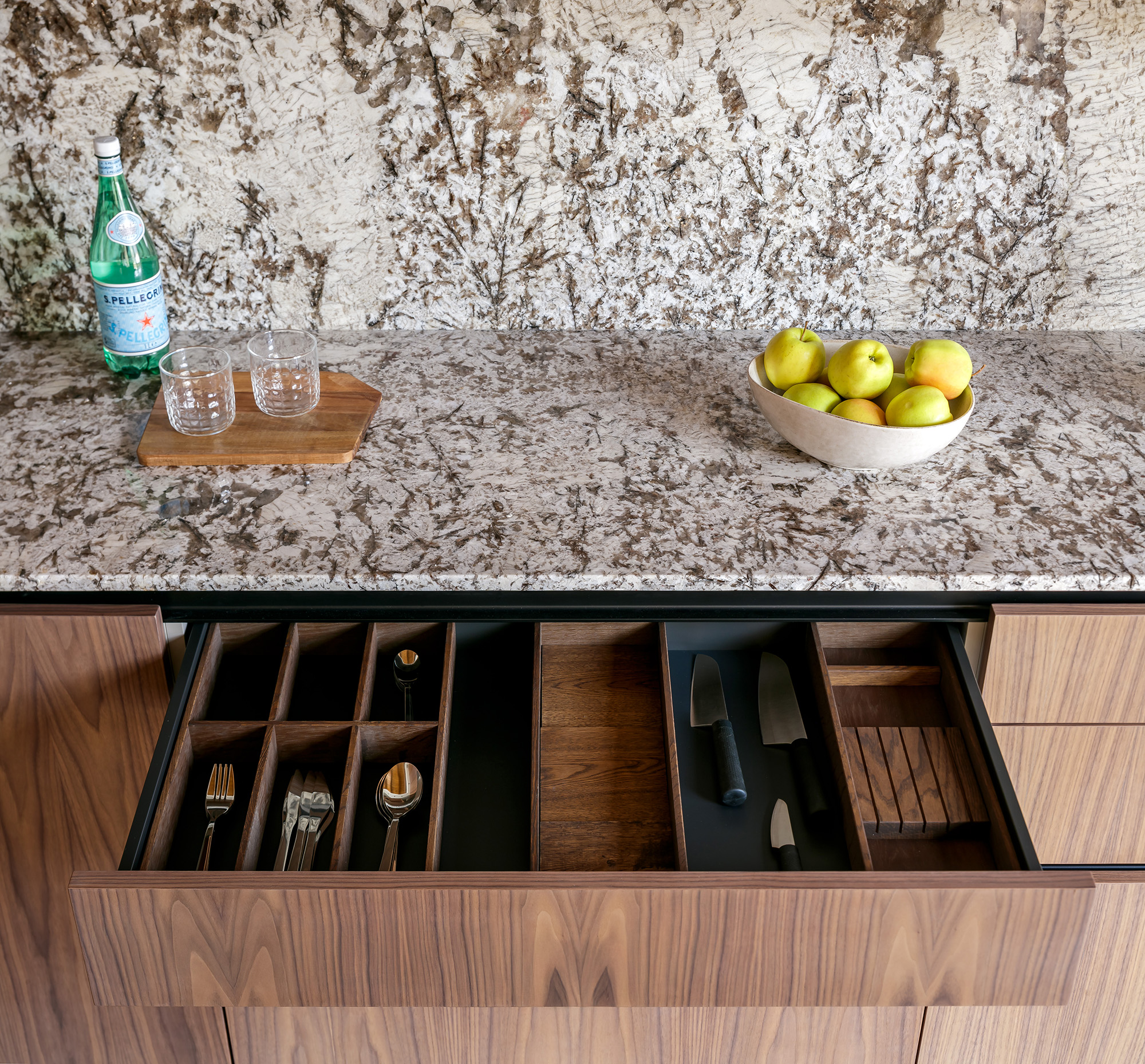 Los frentes del mobiliario de cocina, pertenecientes al modelo BAIKAL de INKO y acabados en chapa natural de nogal, aportan calidez, textura y una lectura visual uniforme. La apertura mediante gola negra permite mantener un conjunto limpio, sin elementos añadidos. En la parte superior predominan los muebles cerrados, mientras que el cierre del ángulo incorpora dos vitrinas con marco negro y cristal parsol bronce junto a un módulo abierto en la misma madera, creando un punto focal discreto pero elegante. En la parte baja, el encuentro entre los dos tramos se aprovecha mediante un sistema de rincón FlyBox con botellero lateral, optimizando un área que suele perderse. Bajo los muebles altos, la iluminación técnica de D’Aqua LUX aporta luz directa a la encimera y subraya el tono cálido del nogal.