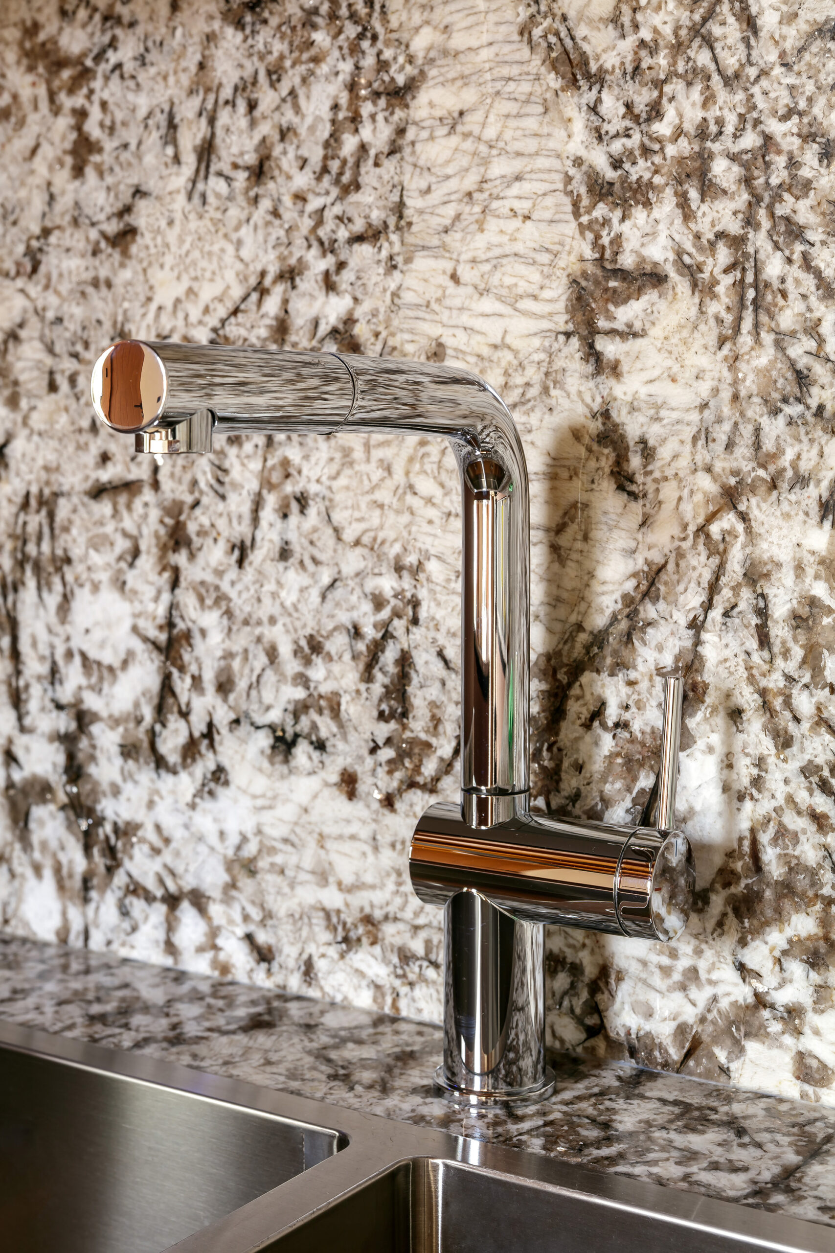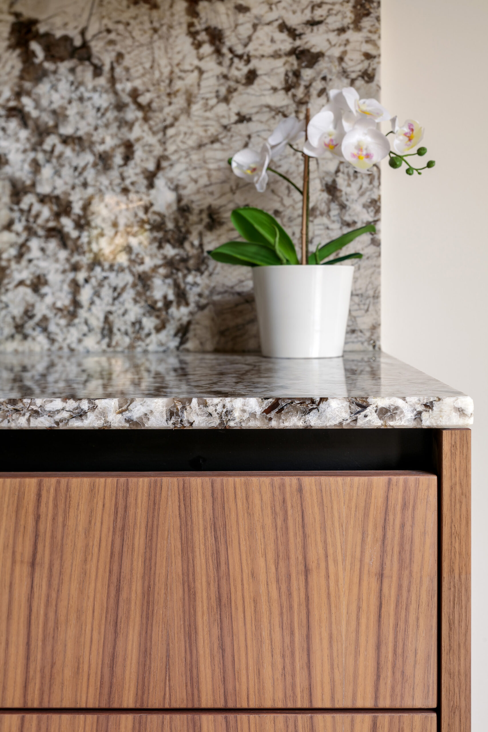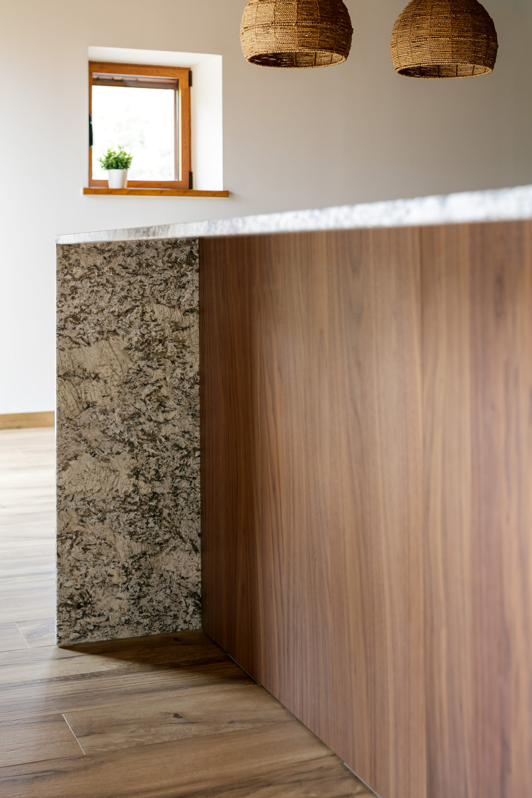 La encimera y el aplacado, realizados en Sensa Glacial Blue, introducen un granito brasileño pulido de matiz plateado con zonas cristalinas que aportan profundidad y un carácter distintivo. Este mismo material reviste la isla, ejecutada con costados ingletados que refuerzan su presencia arquitectónica. En ella se integra la placa con extractor de Teka y, en la parte posterior, un espacio para taburetes que convierte esta pieza en un punto de encuentro. El resultado es una cocina equilibrada, natural y atemporal, diseñada con precisión para ofrecer funcionalidad, belleza y una experiencia diaria plenamente confortable.