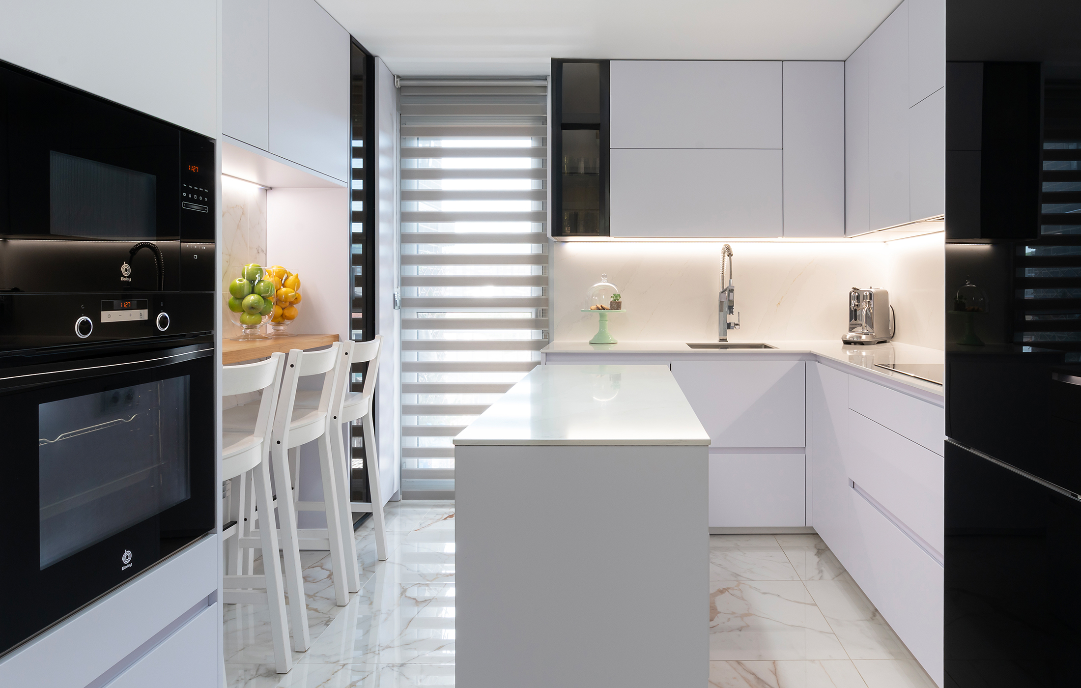 En la zona principal se reúnen las áreas de frío, cocción y aguas. Los muebles altos alcanzan el techo para maximizar la capacidad de almacenaje, mientras una vitrina con perfilería oscura aporta un contrapunto elegante y liviano. La encimera y los aplacados en Silestone Calacatta Gold se prolongan hasta la pared lateral del frigorífico, generando continuidad y un acabado envolvente. Una isla auxiliar centra la estancia sin recargarla, ofreciendo superficie adicional de trabajo y una transición fluida hacia la zona de paso.
