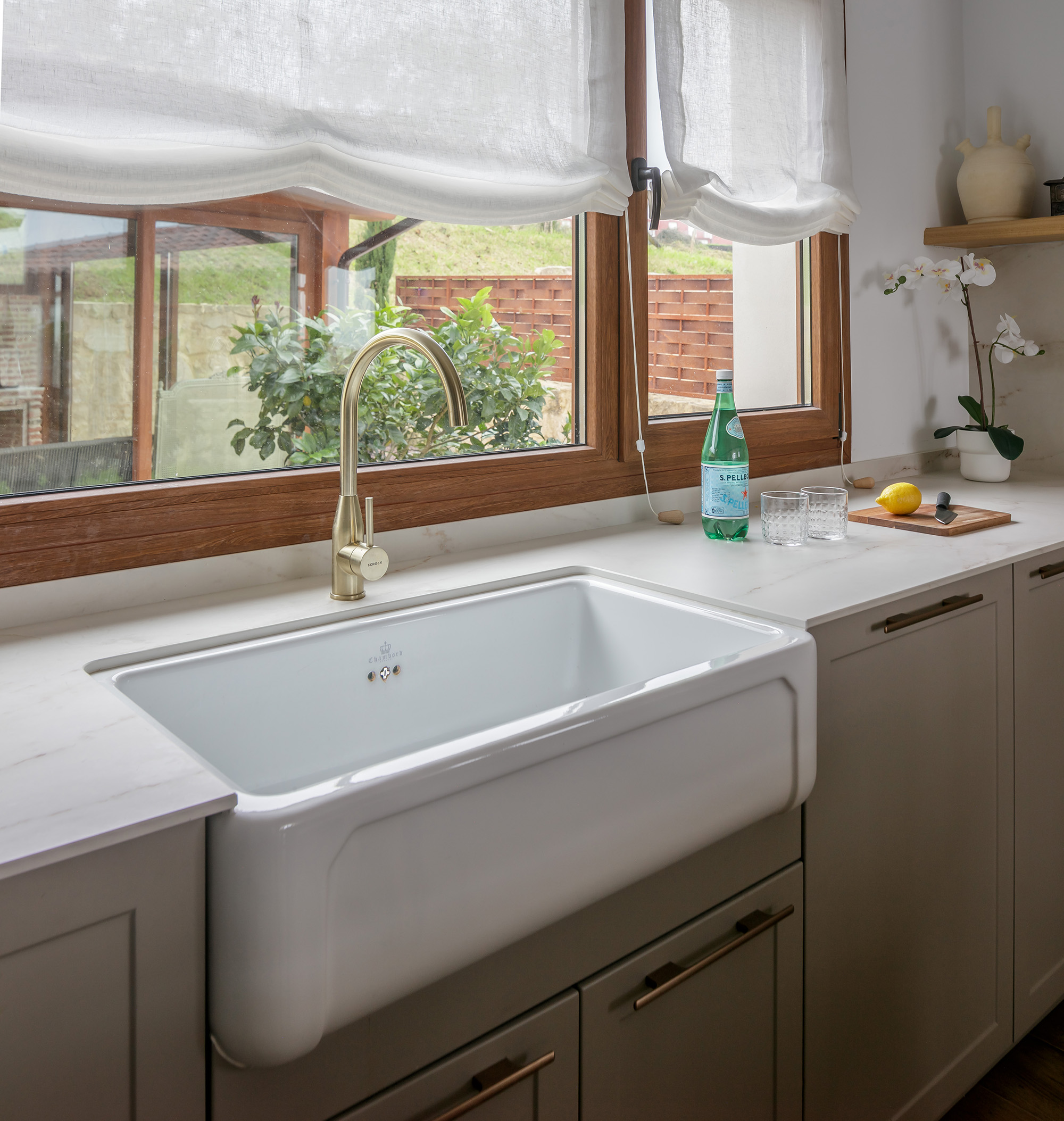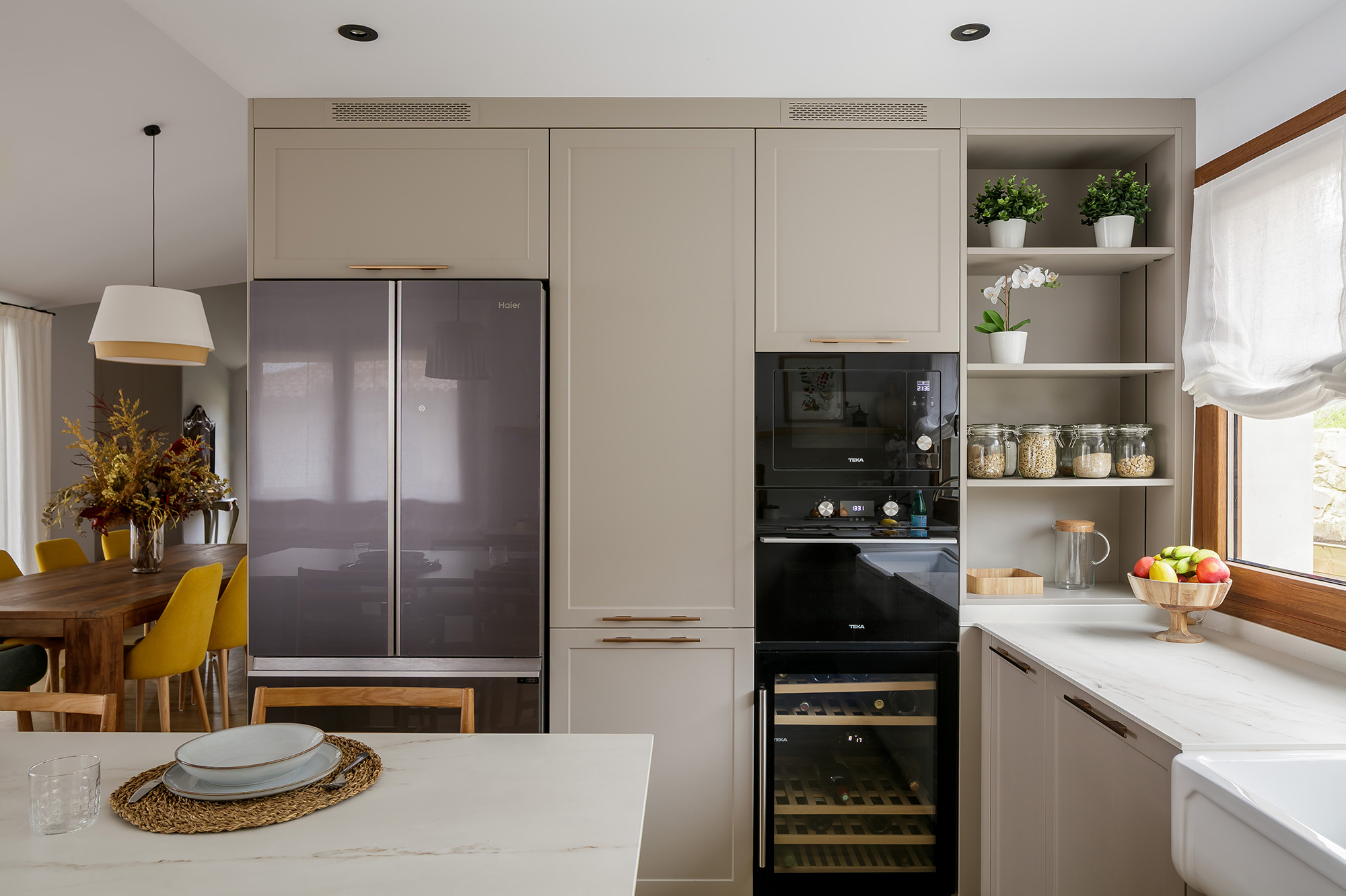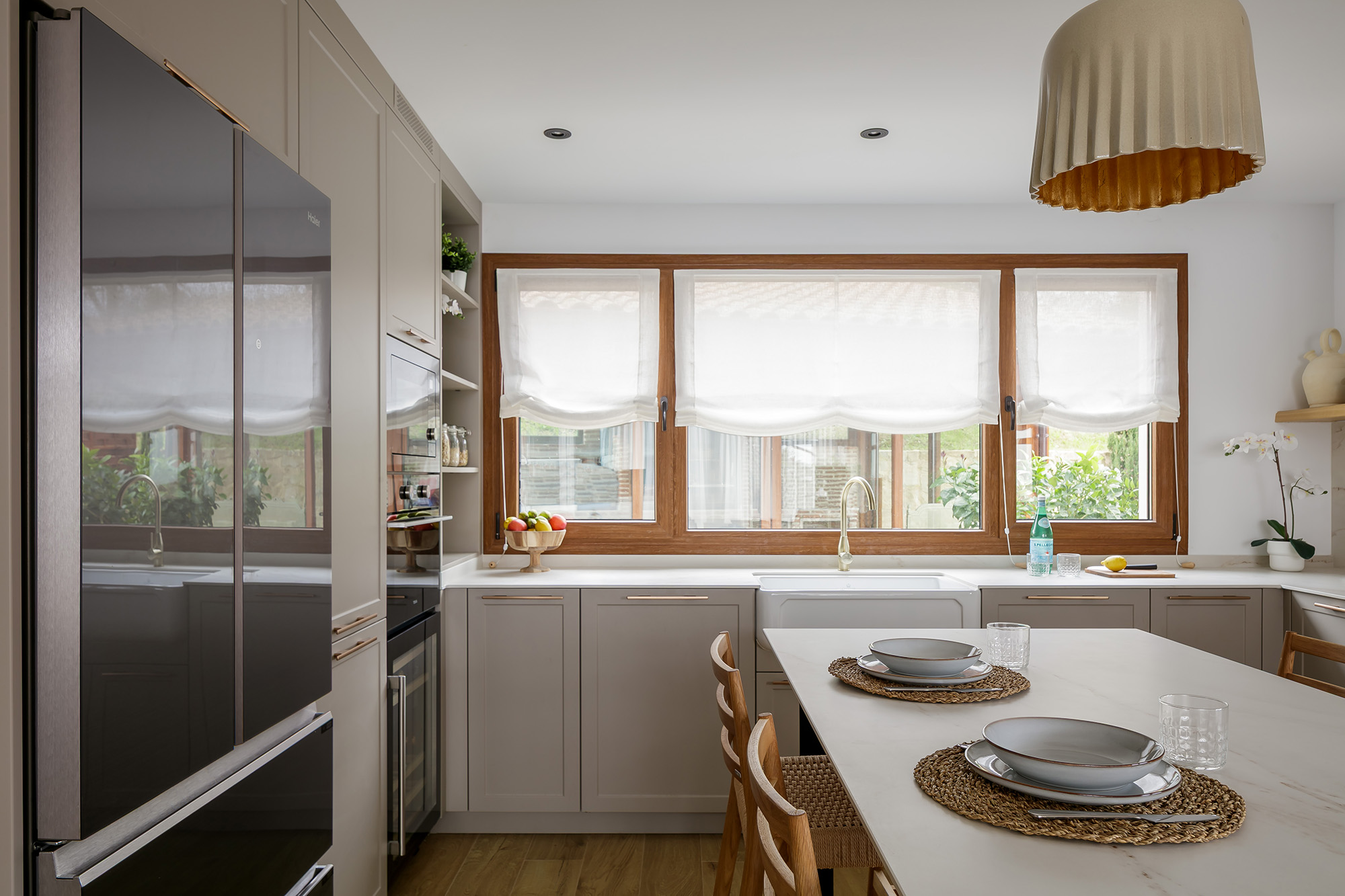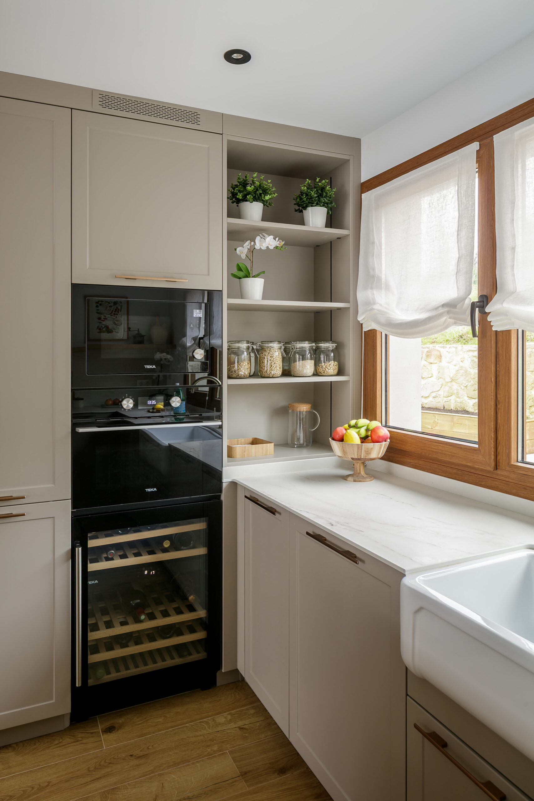 El mobiliario de INKO presenta frentes modelo Trieste en acabado Castor seda lacado, con tiradores tipo asa que aportan un aire clásico y refinado. La composición comienza con el bloque de columnas, donde se integran el frigorífico tipo francés, un módulo despensa, el horno, el microondas y una vinoteca, acompañados por una zona de estantes abiertos lacados a juego que conecta con el área de trabajo. En la zona de aguas, situada frente al ventanal, destaca el fregadero cerámico tipo Belfast y el grifo en acabado dorado, una combinación que aporta carácter y luminosidad. La zona de cocción mantiene la pureza visual gracias a la ausencia de muebles altos, con una campana integrada en un bloque revestido en el mismo acabado y baldas de madera maciza a ambos lados.