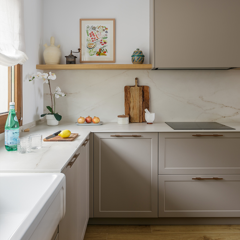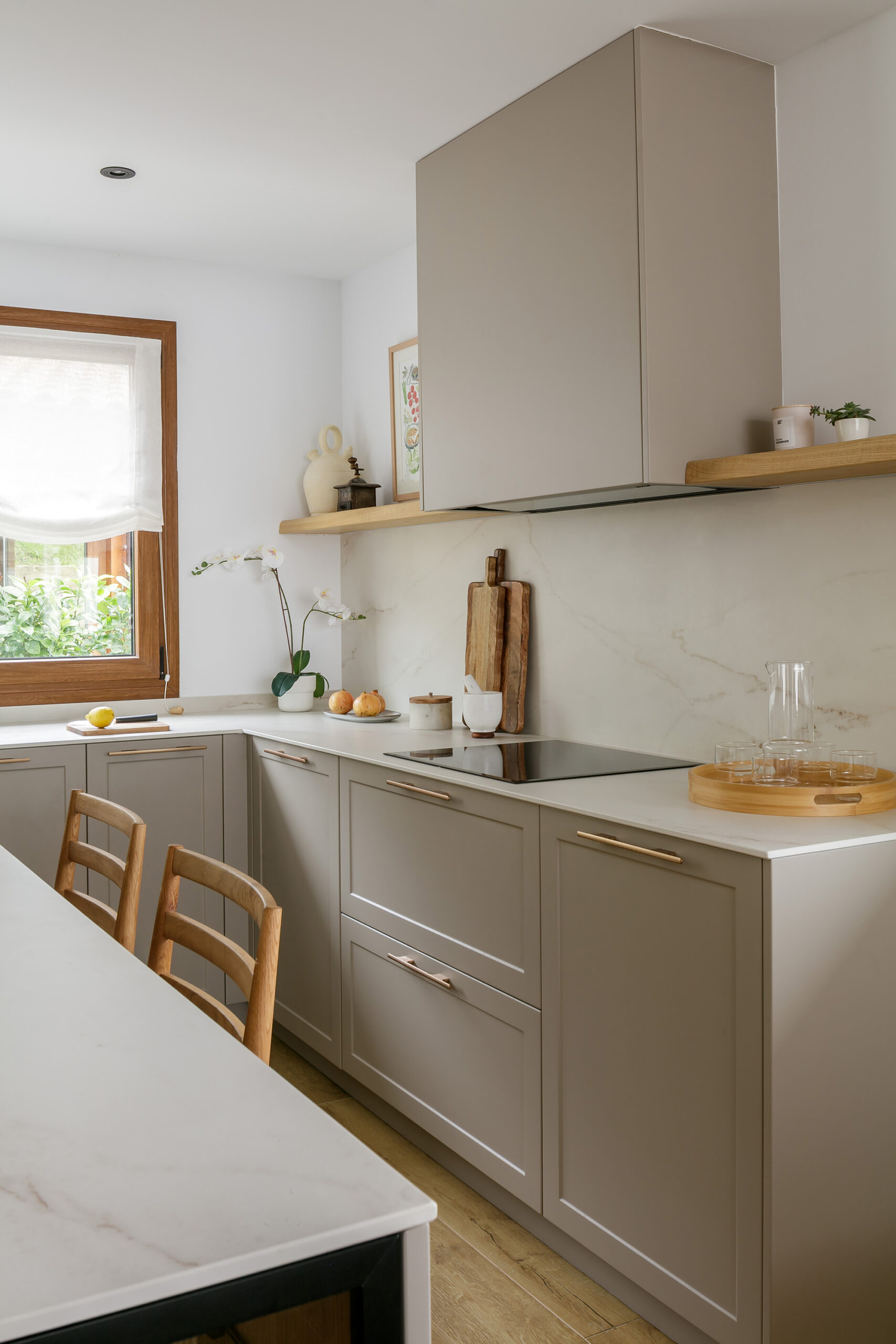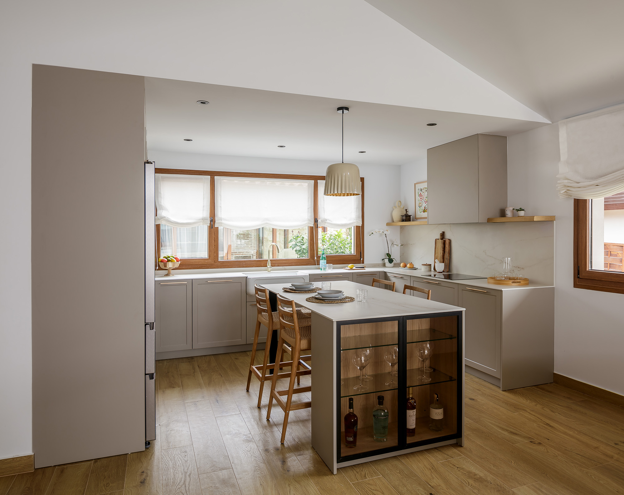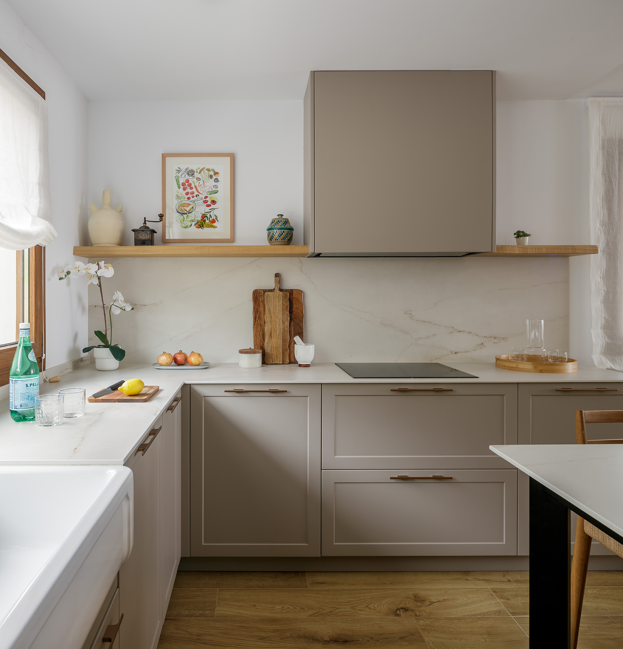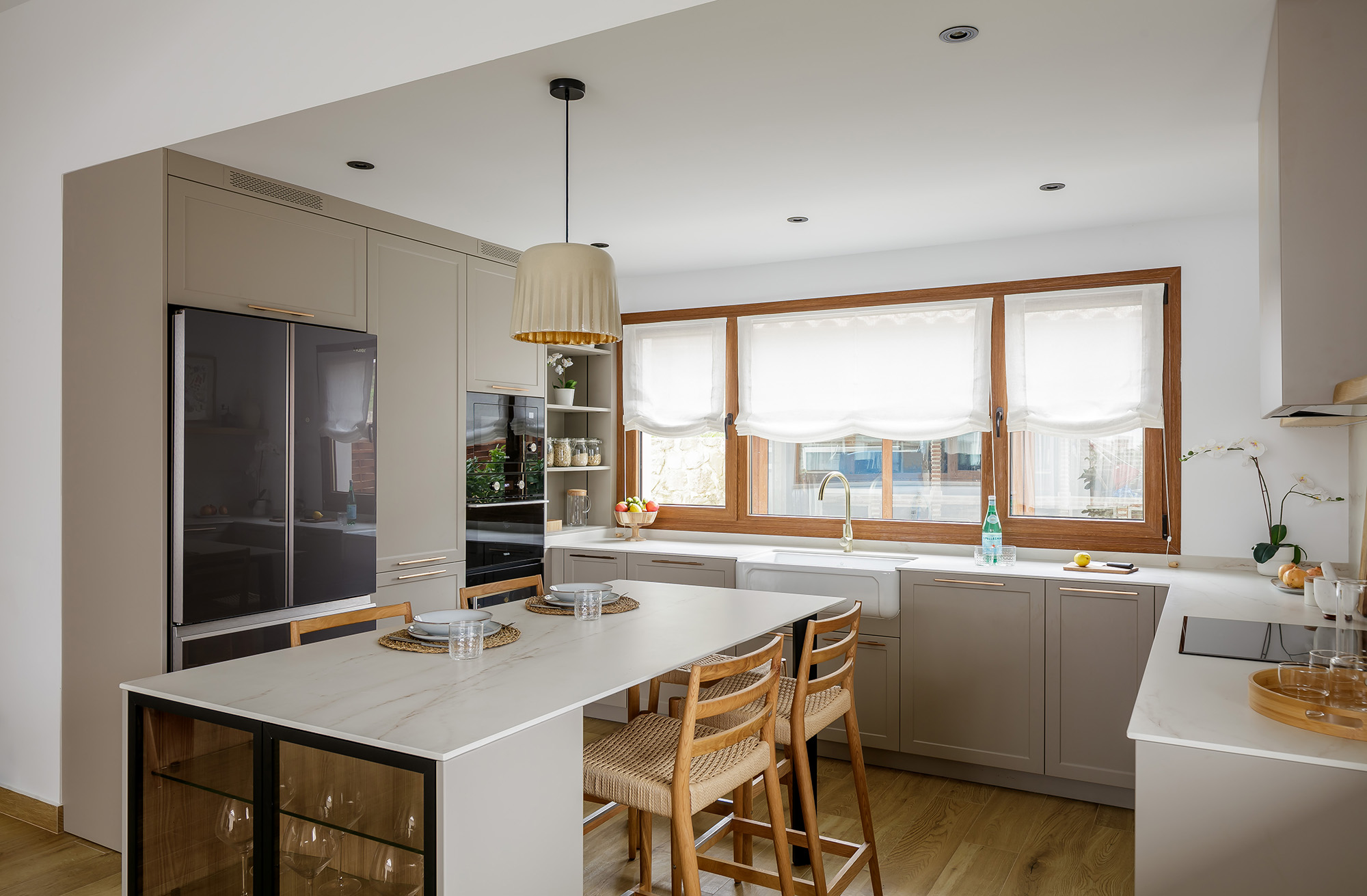 El mobiliario de INKO presenta frentes modelo Trieste en acabado Castor seda lacado, con tiradores tipo asa que aportan un aire clásico y refinado. La composición comienza con el bloque de columnas, donde se integran el frigorífico tipo francés, un módulo despensa, el horno, el microondas y una vinoteca, acompañados por una zona de estantes abiertos lacados a juego que conecta con el área de trabajo. En la zona de aguas, situada frente al ventanal, destaca el fregadero cerámico tipo Belfast y el grifo en acabado dorado, una combinación que aporta carácter y luminosidad. La zona de cocción mantiene la pureza visual gracias a la ausencia de muebles altos, con una campana integrada en un bloque revestido en el mismo acabado y baldas de madera maciza a ambos lados.