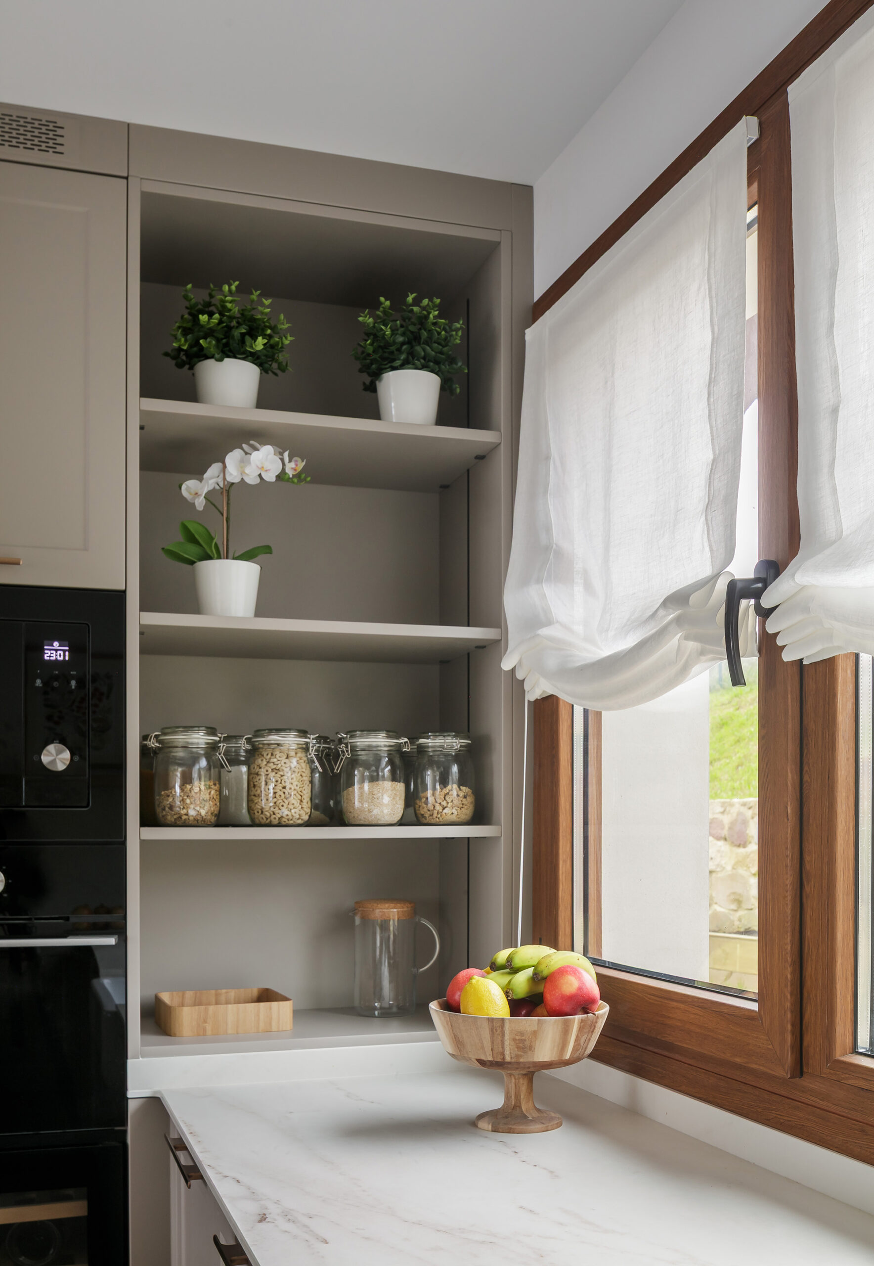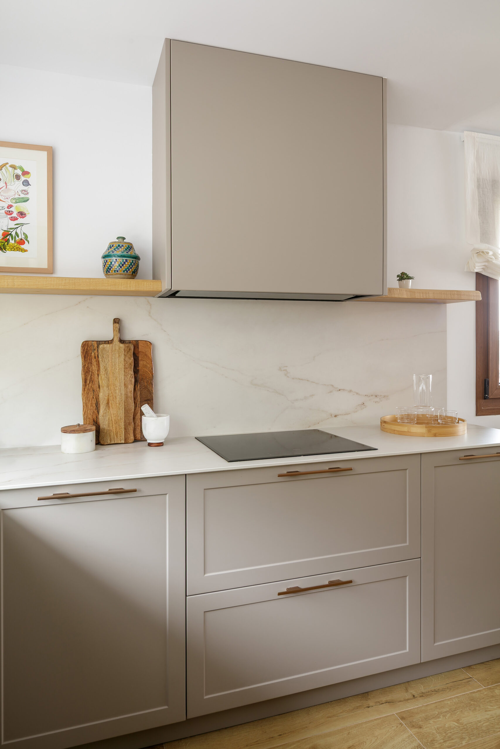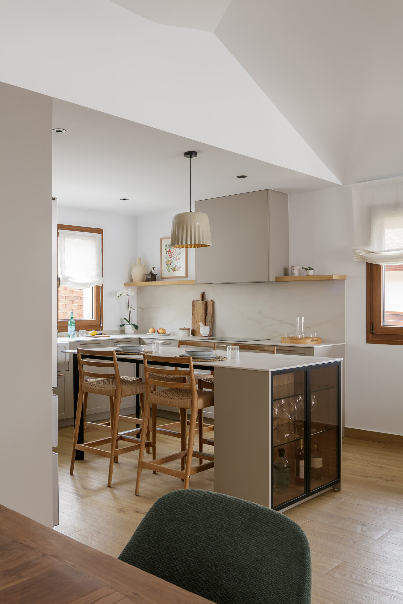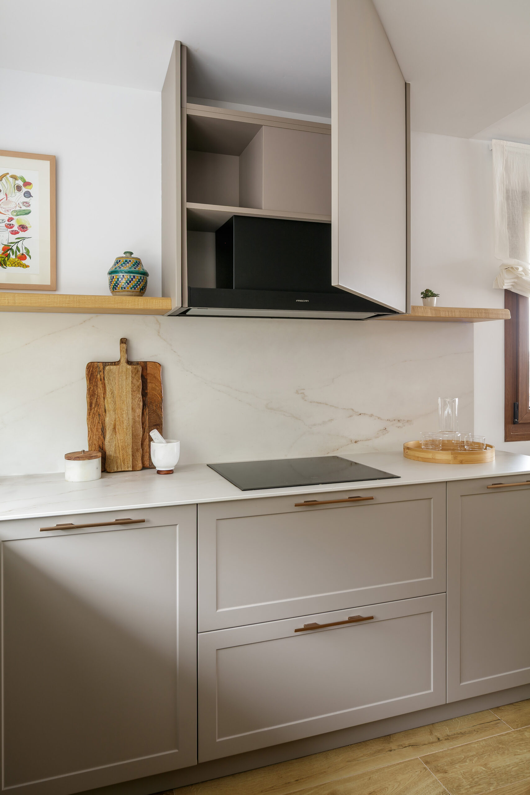 El mobiliario de INKO presenta frentes modelo Trieste en acabado Castor seda lacado, con tiradores tipo asa que aportan un aire clásico y refinado. La composición comienza con el bloque de columnas, donde se integran el frigorífico tipo francés, un módulo despensa, el horno, el microondas y una vinoteca, acompañados por una zona de estantes abiertos lacados a juego que conecta con el área de trabajo. En la zona de aguas, situada frente al ventanal, destaca el fregadero cerámico tipo Belfast y el grifo en acabado dorado, una combinación que aporta carácter y luminosidad. La zona de cocción mantiene la pureza visual gracias a la ausencia de muebles altos, con una campana integrada en un bloque revestido en el mismo acabado y baldas de madera maciza a ambos lados.
