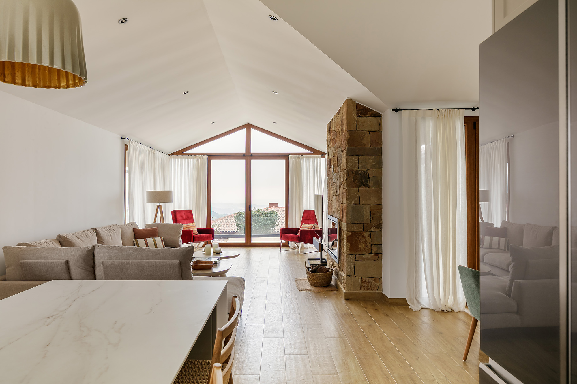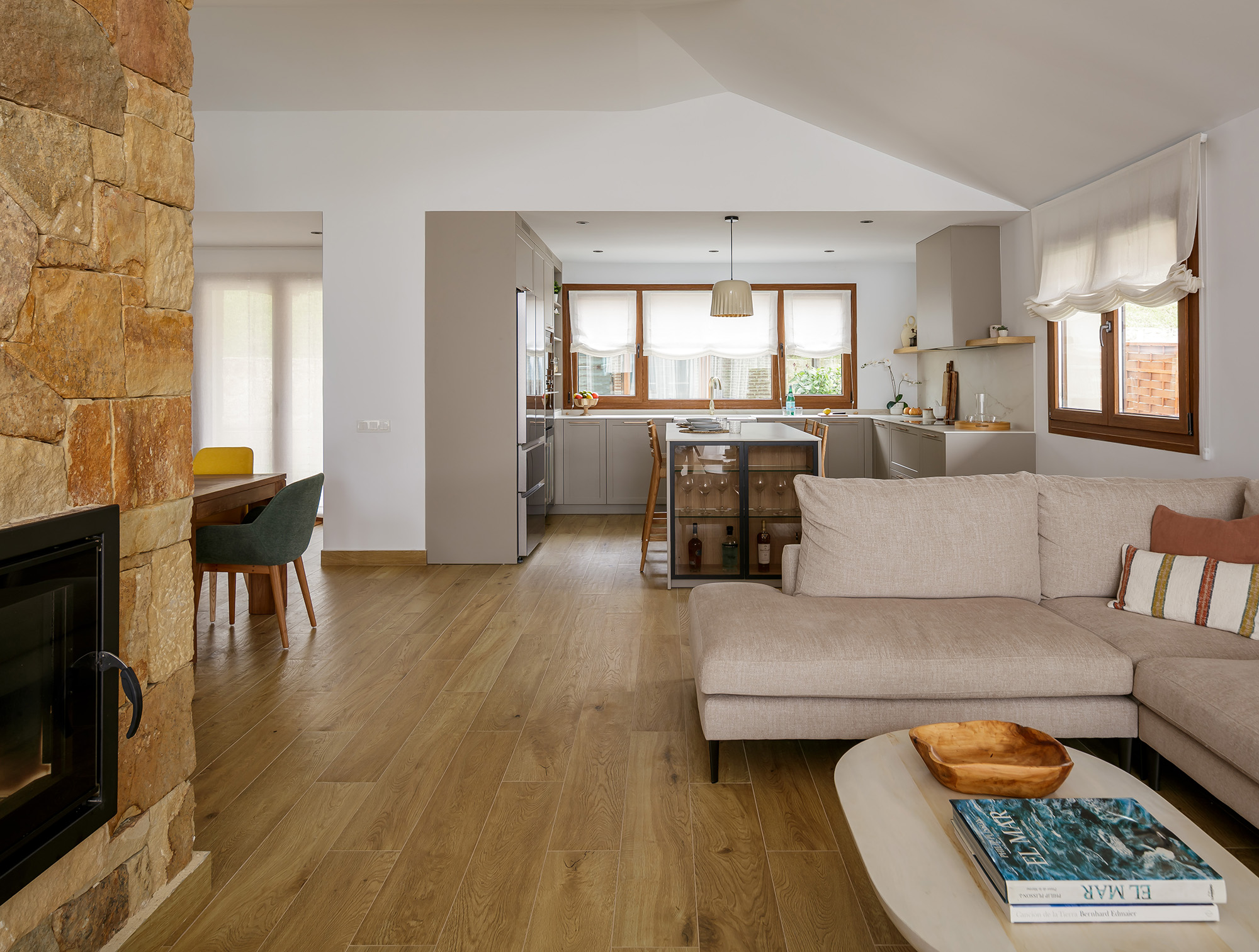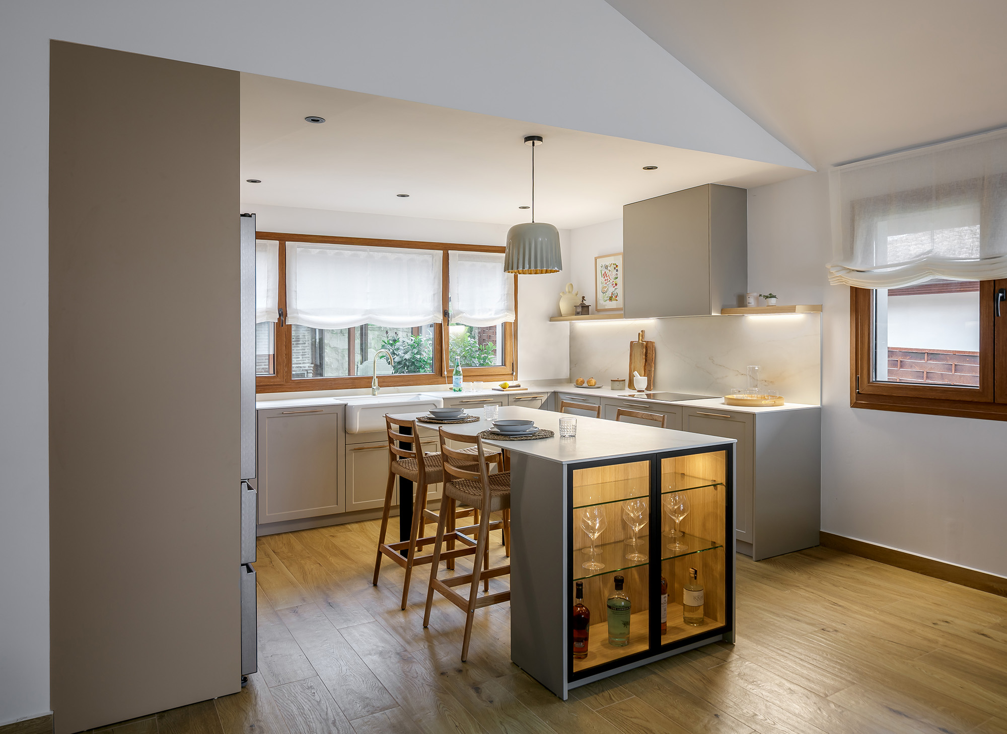 En esta vivienda situada en Udías, la cocina se ha concebido como el corazón de la casa, abierta al salón y bañada por la luz natural que penetra a través de sus amplios ventanales de madera. La distribución en forma de U, complementada con una isla auxiliar de trabajo, favorece la ergonomía y el aprovechamiento del espacio, creando un entorno cálido, funcional y muy familiar. El diseño, de estilo country reinterpretado en clave contemporánea, combina proporciones equilibradas, materiales naturales y una paleta cromática serena que refuerza la conexión visual con el entorno.