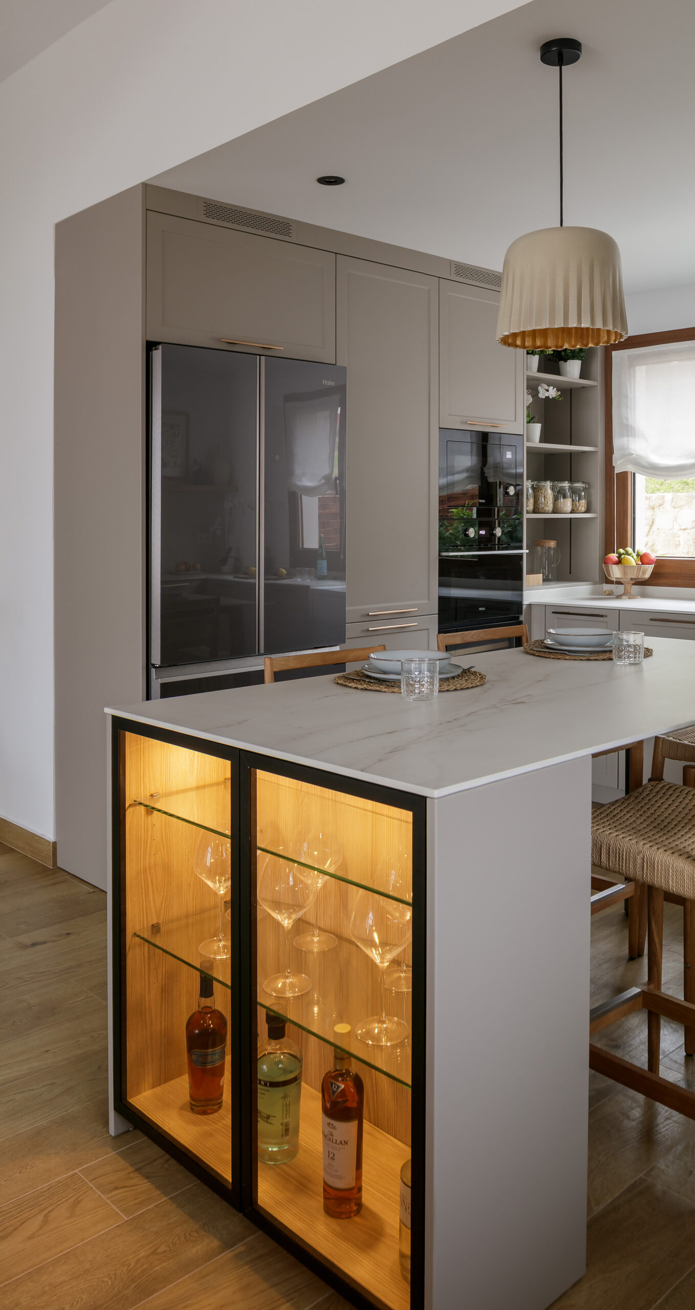 La isla central se convierte en el núcleo cotidiano de la estancia, con espacio para taburetes en ambas caras y una vitrina iluminada con interior en madera en el extremo orientado al salón, detalle que añade profundidad y calidez al conjunto. La encimera y la trasera, ambas en DEKTON acabado Rem, aportan textura marmoleada y una continuidad visual impecable con el resto del ambiente. Una cocina pensada para disfrutar, donde la naturalidad, la luz y la precisión en cada detalle reflejan la esencia de ROBEYAN: diseño atemporal, funcionalidad y confort en perfecta armonía.
