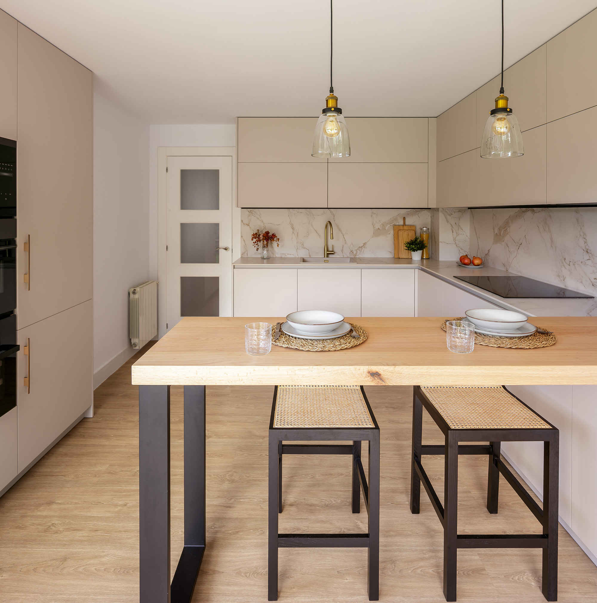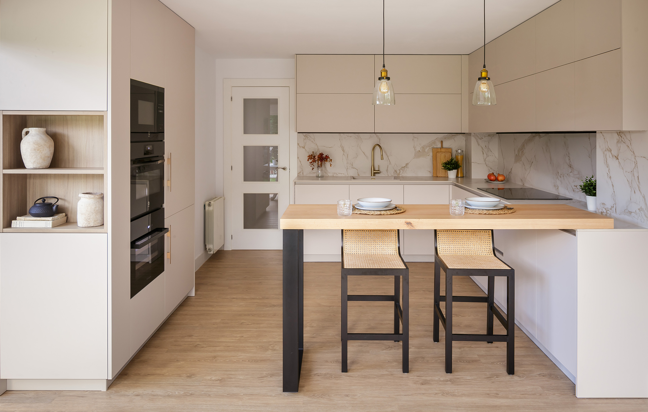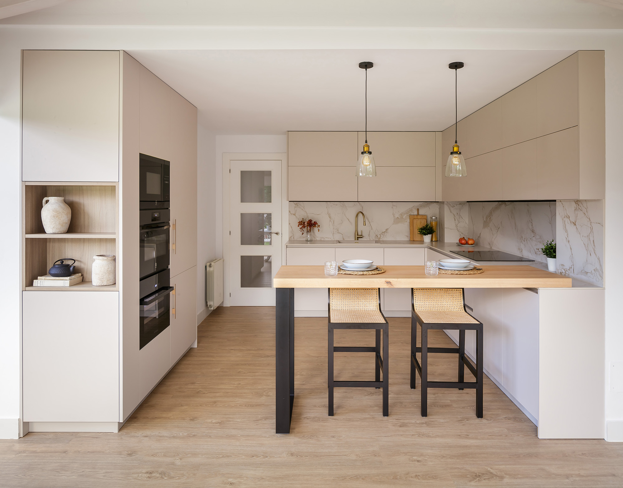 El ambiente culmina con una barra de castaño macizo de 60 mm, apoyada sobre una estructura metálica en negro mate de Cancio, que amplía la funcionalidad y sirve como punto de encuentro cotidiano. Las lámparas colgantes que iluminan esta zona añaden calidez, mientras que el techo de madera blanca del salón aporta continuidad visual entre ambos ambientes. El resultado es una cocina luminosa, serena y contemporánea, pensada para convivir con naturalidad con el resto de la vivienda.