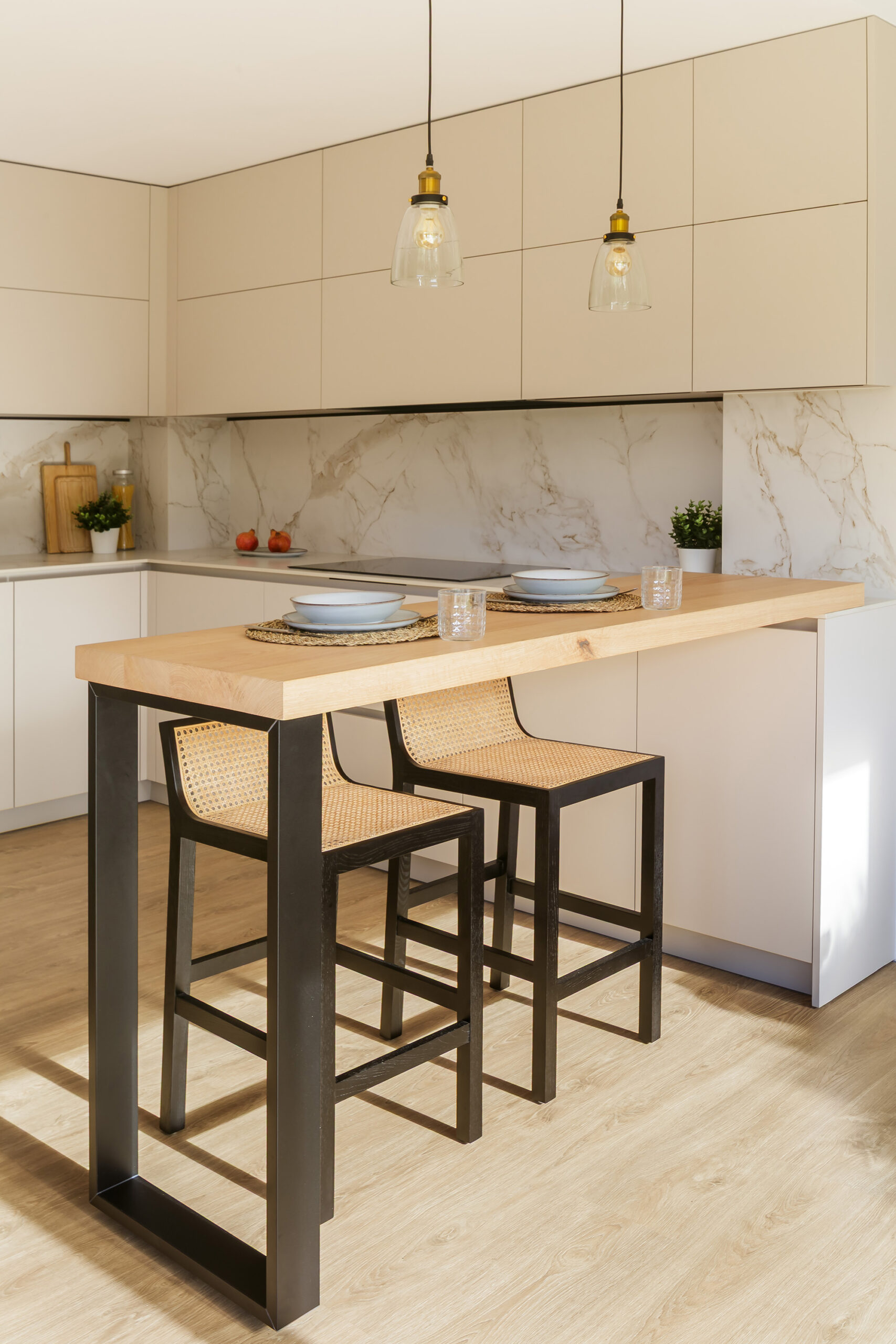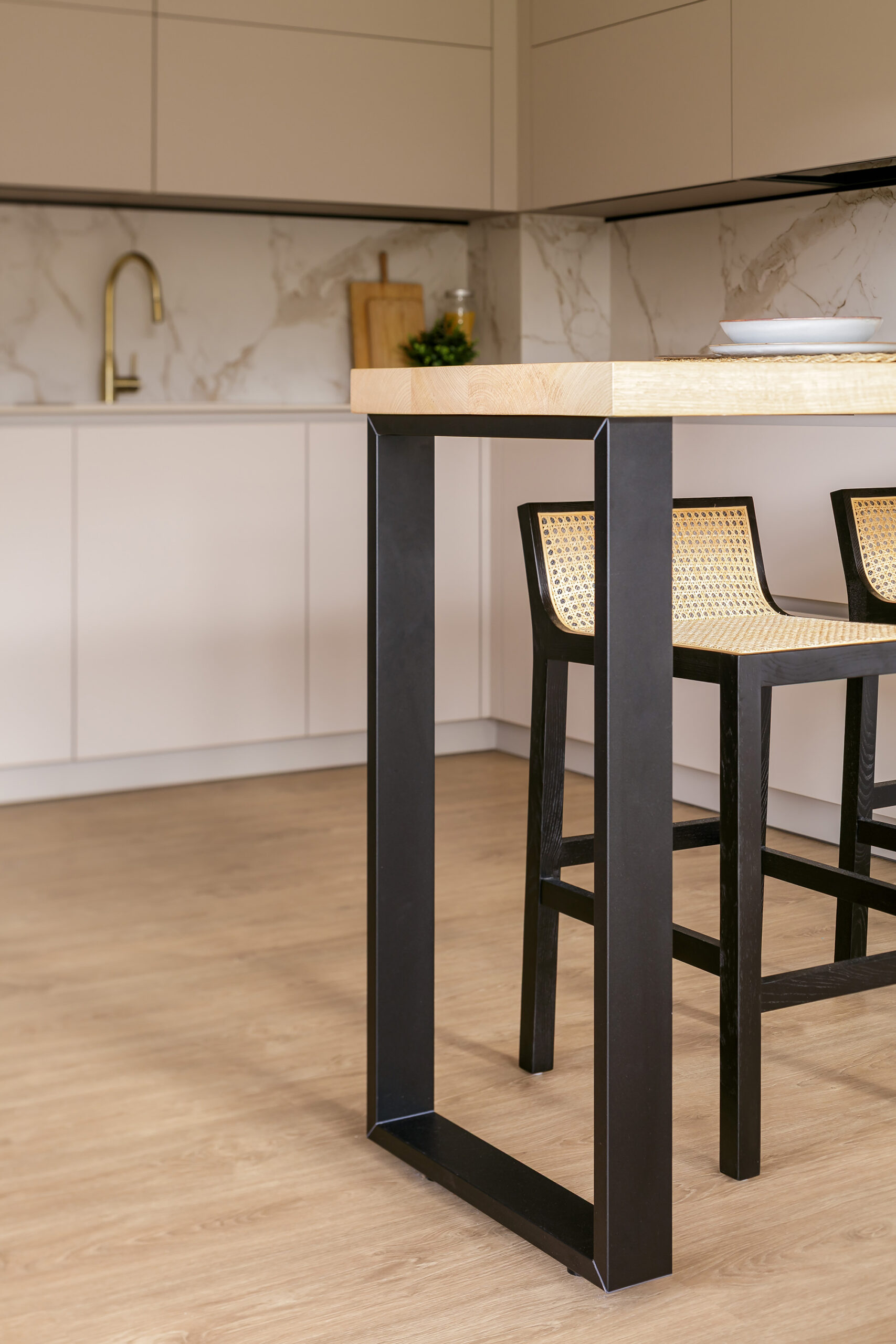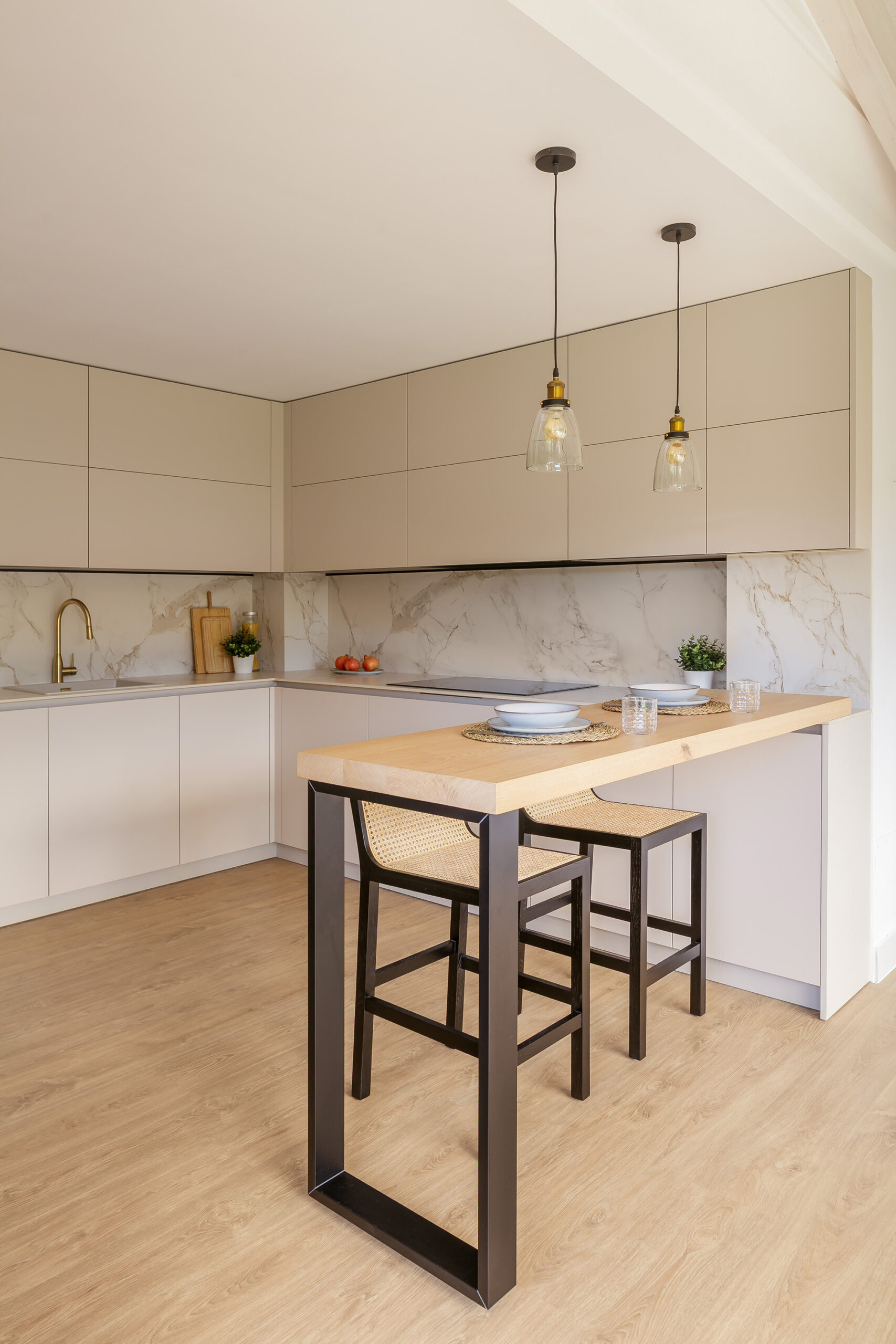 El ambiente culmina con una barra de castaño macizo de 60 mm, apoyada sobre una estructura metálica en negro mate de Cancio, que amplía la funcionalidad y sirve como punto de encuentro cotidiano. Las lámparas colgantes que iluminan esta zona añaden calidez, mientras que el techo de madera blanca del salón aporta continuidad visual entre ambos ambientes. El resultado es una cocina luminosa, serena y contemporánea, pensada para convivir con naturalidad con el resto de la vivienda.