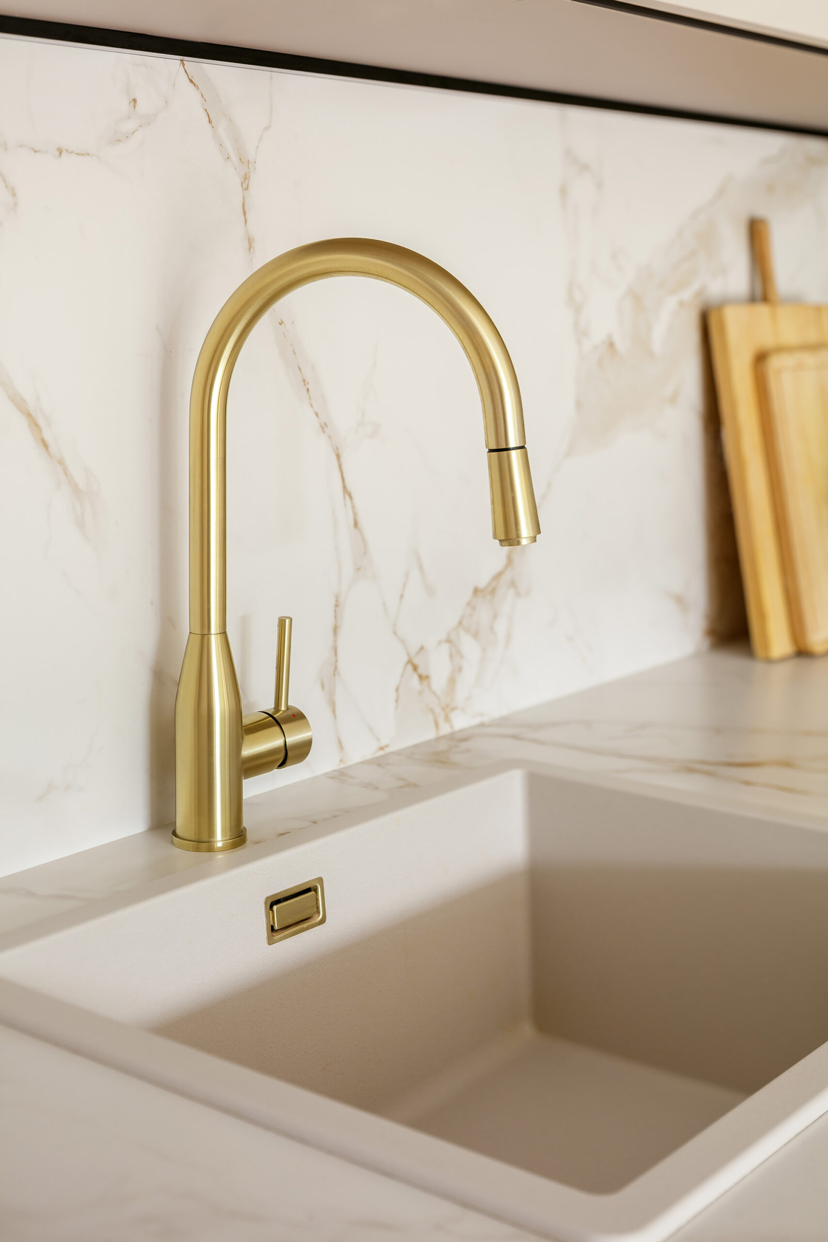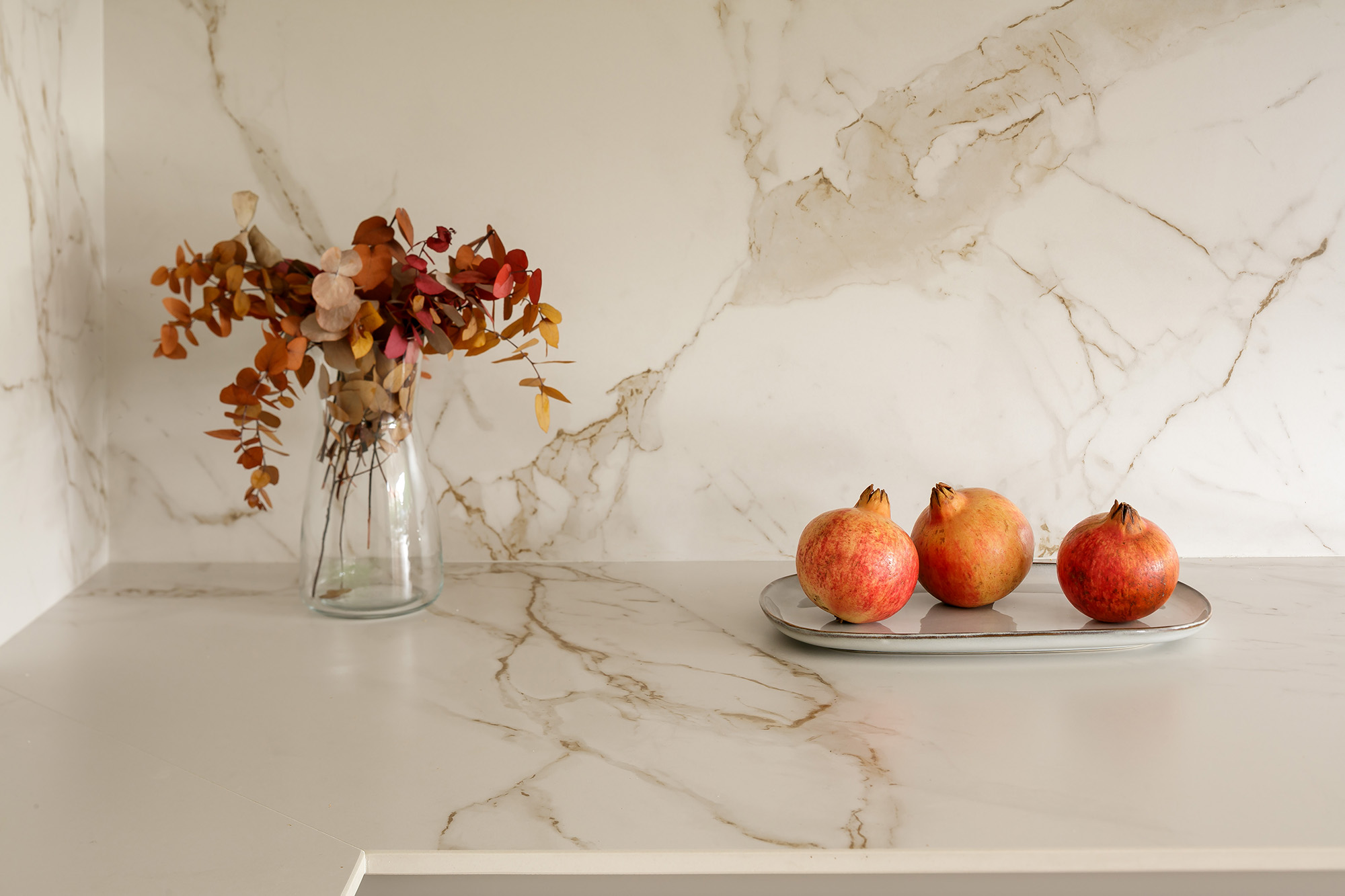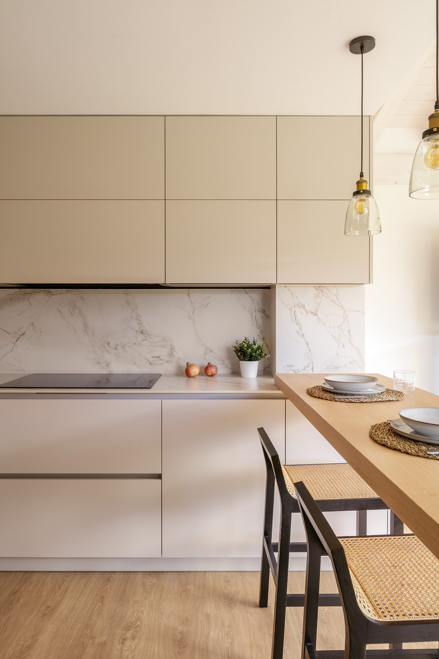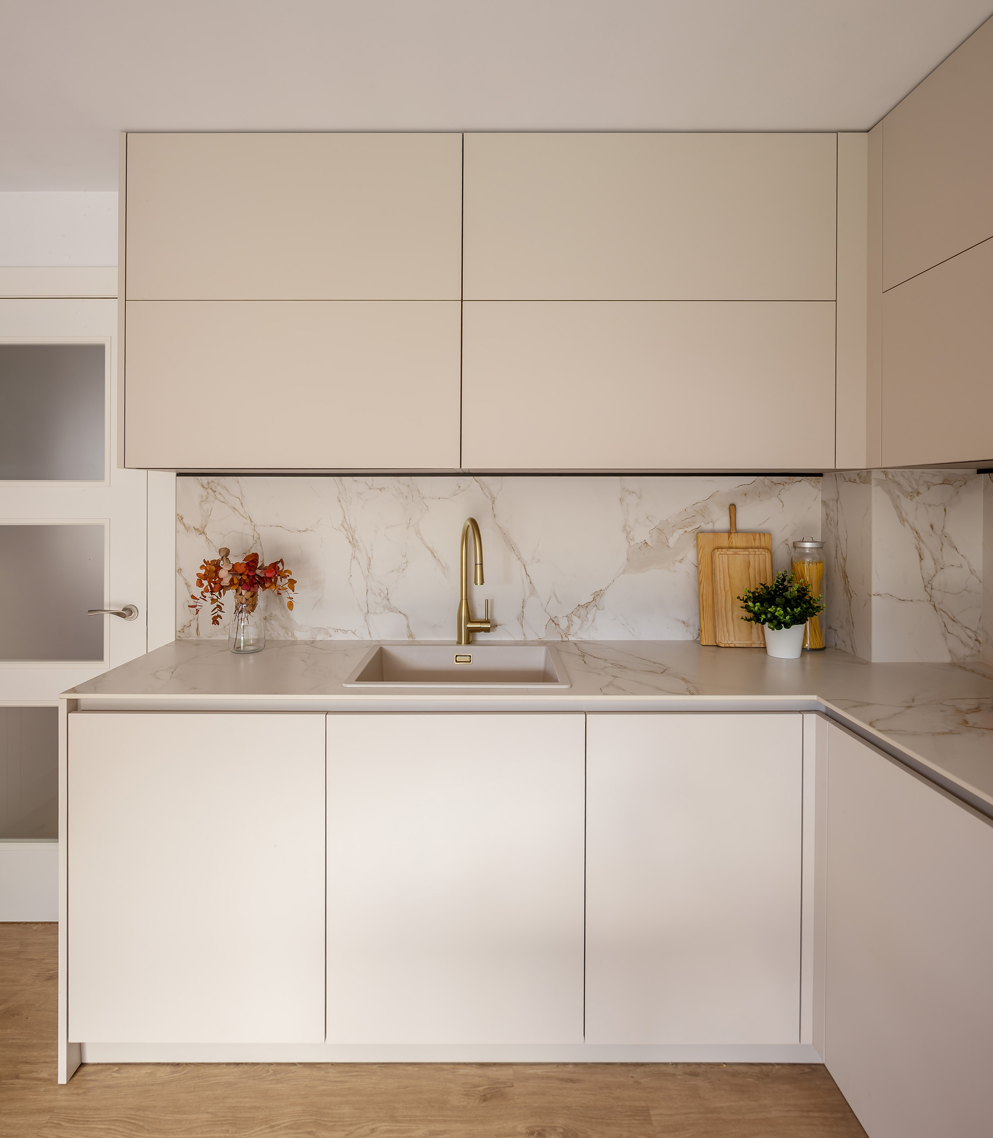En Puente Arce (Cantabria), esta cocina se integra en un espacio lleno de luz natural y abierto al jardín, reforzando la conexión entre interior y exterior. La distribución principal se organiza en forma de L, comenzando por la zona de aguas y continuando con la de cocción, ambas ejecutadas sobre encimera y trasera en Dekton Entzo, un material marmoleado con vetas doradas que aporta claridad y una presencia elegante. El mobiliario se resuelve con frentes modelo GOURMET en acabado Ginger de INKO, un tono cálido y atemporal que dialoga con la luz que entra desde las amplias carpinterías. Los muebles altos, planteados en formato horizontal, ordenan visualmente el espacio y mantienen una estética continua y equilibrada.