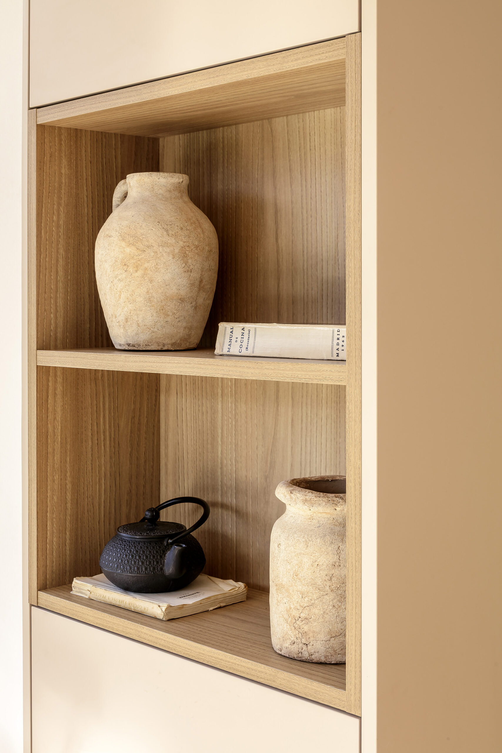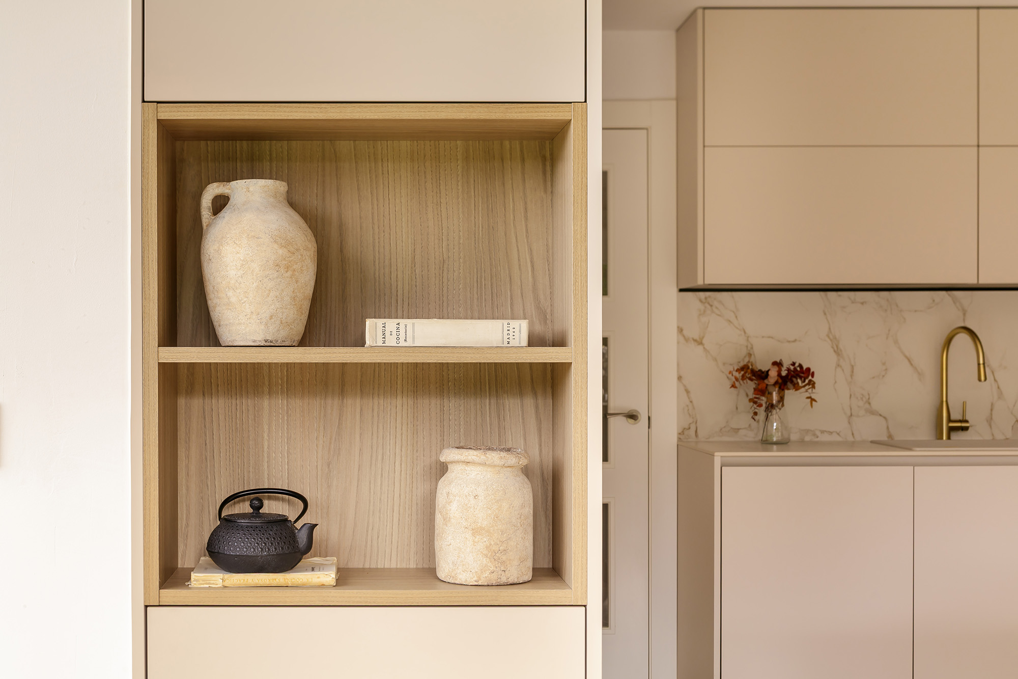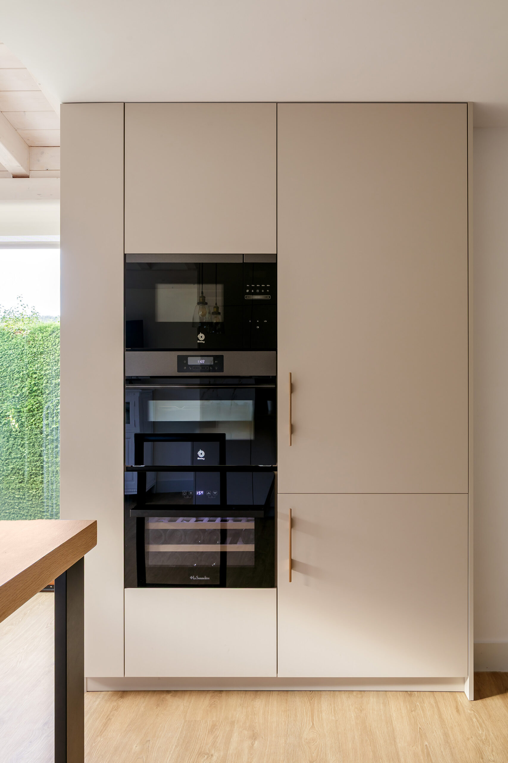 La cocina se completa con un bloque de columnas que integra horno, microondas y vinoteca en uno de los laterales, y frigorífico combi en el otro, manteniendo la limpieza visual gracias a la plena integración del equipamiento. Entre ambos elementos destaca un módulo con hueco decorativo en acabado madera, dispuesto en sentido inverso a los frentes para generar contraste y aportar profundidad sin romper la armonía del conjunto. La ausencia de tiradores, mediante sistema de gola continua, refuerza la pureza del diseño, quedando reservado únicamente para la apertura del frigorífico integrado.