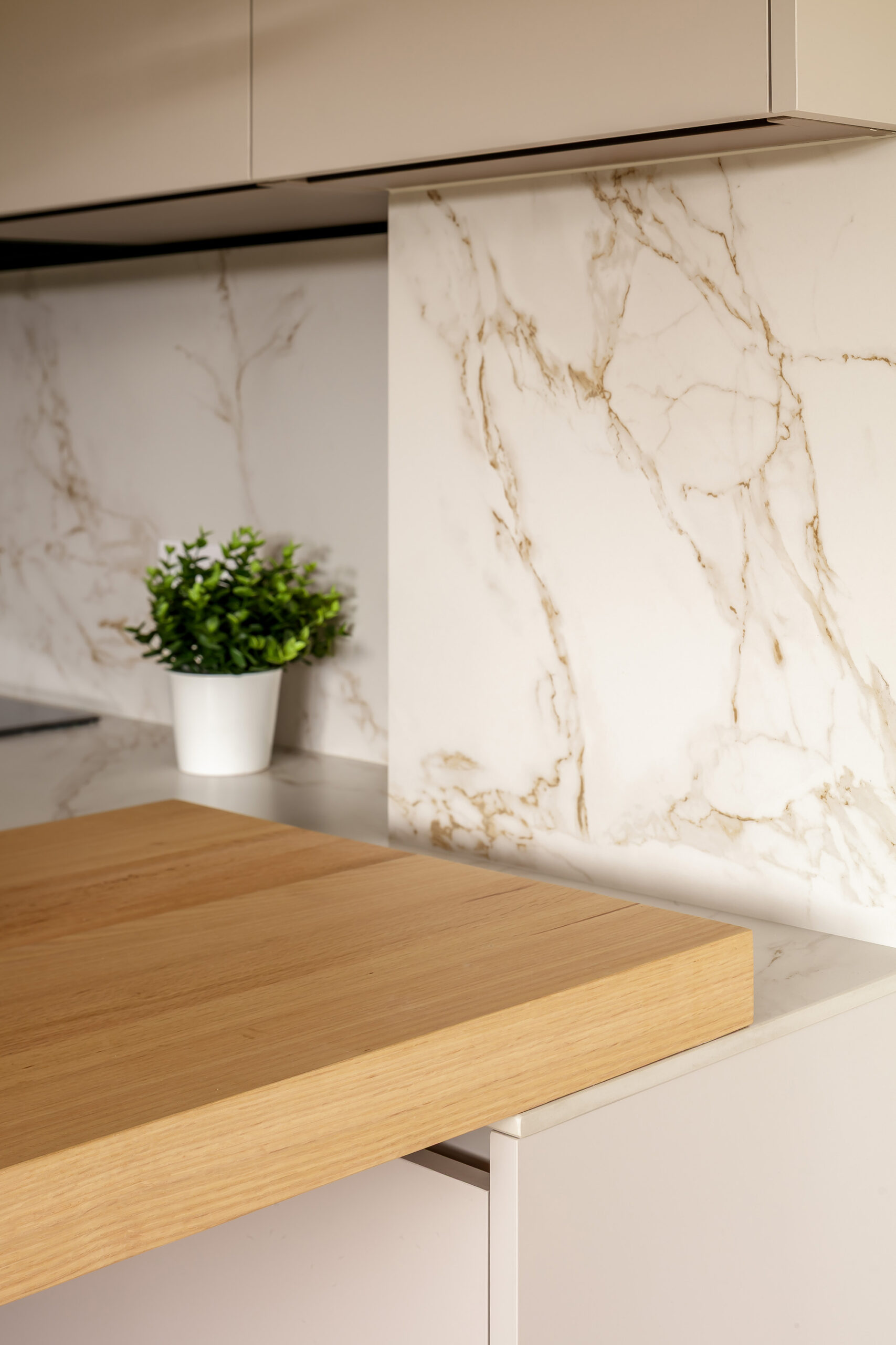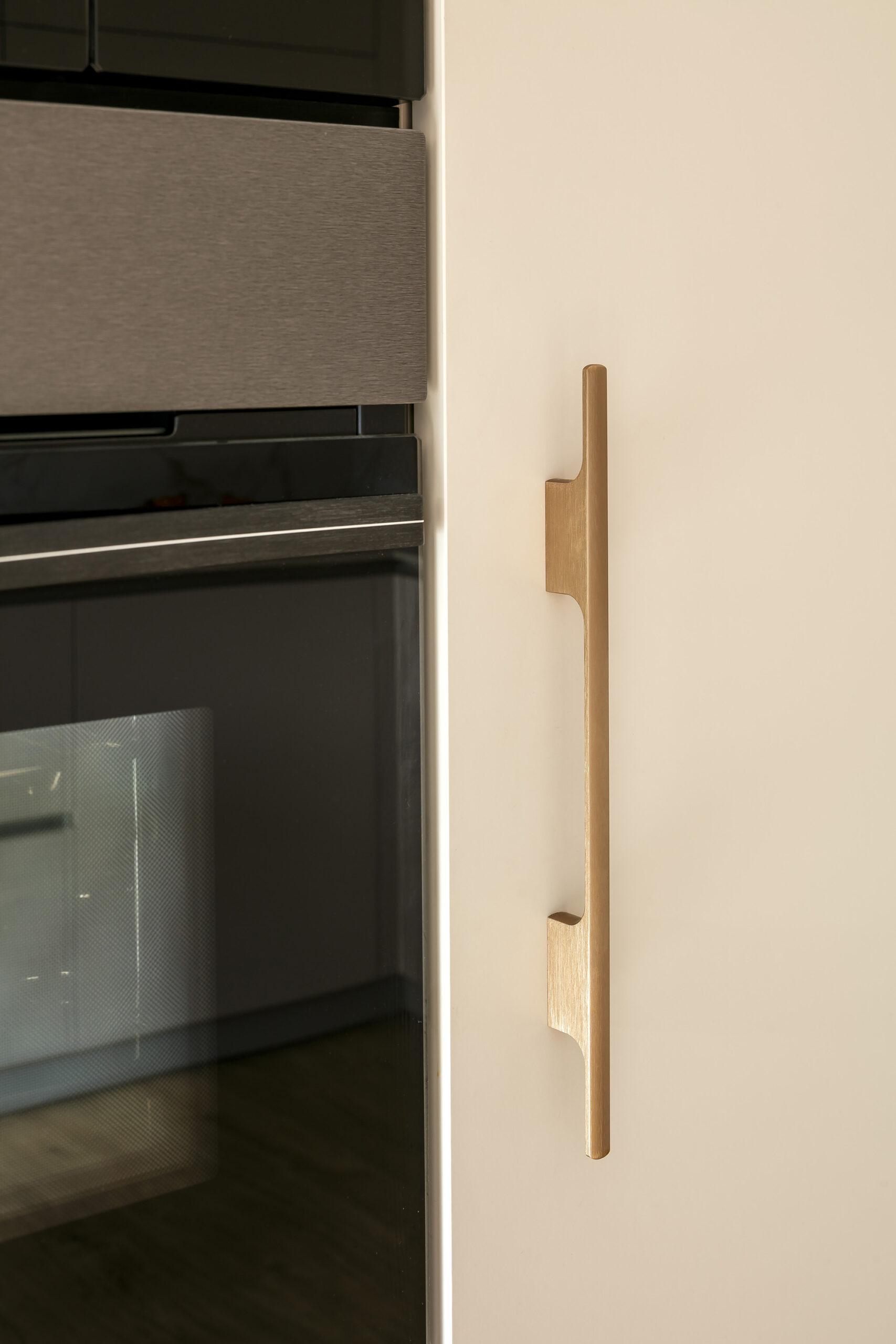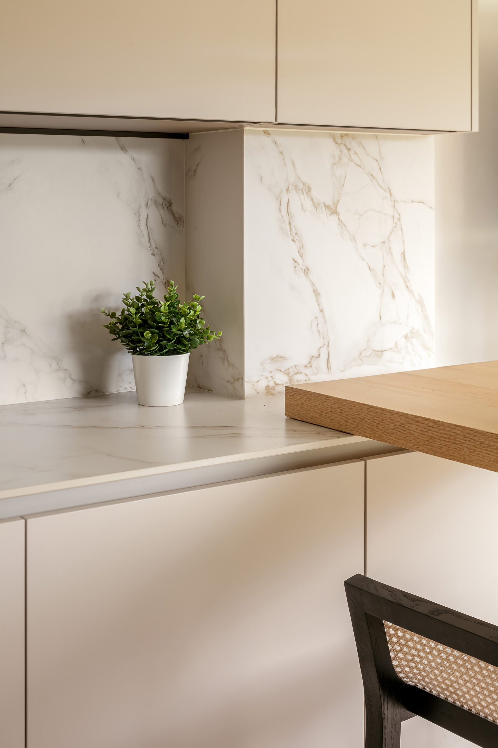 La cocina se completa con un bloque de columnas que integra horno, microondas y vinoteca en uno de los laterales, y frigorífico combi en el otro, manteniendo la limpieza visual gracias a la plena integración del equipamiento. Entre ambos elementos destaca un módulo con hueco decorativo en acabado madera, dispuesto en sentido inverso a los frentes para generar contraste y aportar profundidad sin romper la armonía del conjunto. La ausencia de tiradores, mediante sistema de gola continua, refuerza la pureza del diseño, quedando reservado únicamente para la apertura del frigorífico integrado.