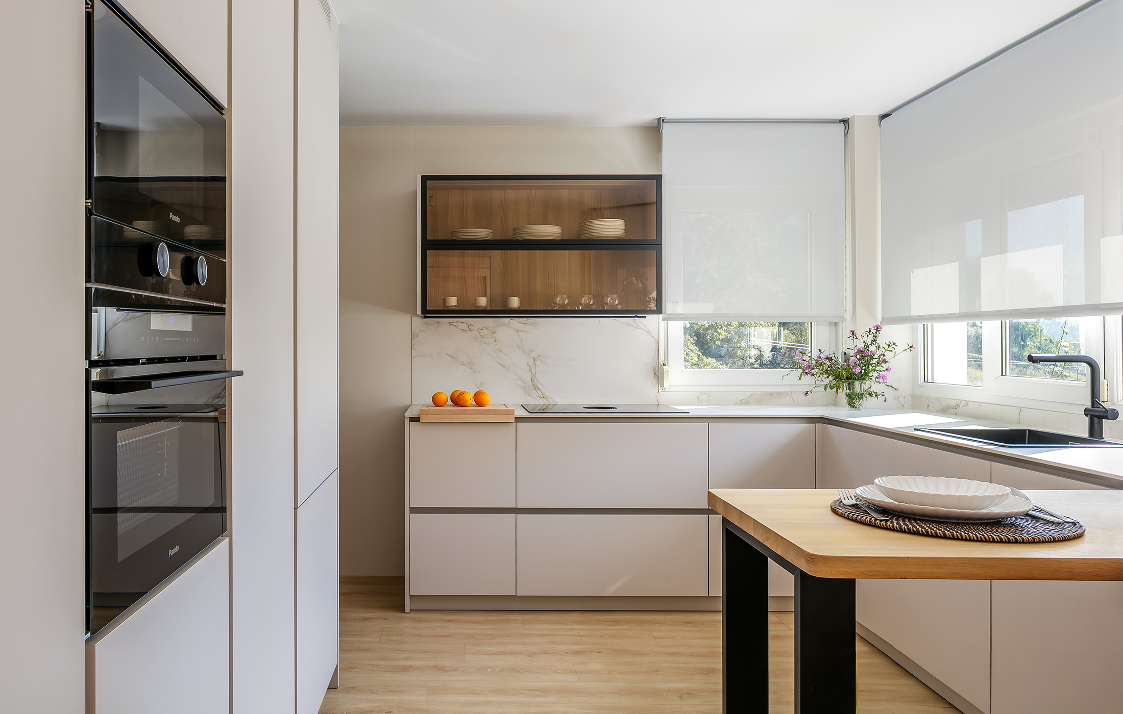 En esta vivienda de Puente Arce, la cocina se ha diseñado para aprovechar al máximo la luz natural que inunda el espacio gracias a sus amplios ventanales. La distribución en L, acompañada de un bloque de columnas, optimiza la superficie y mantiene una estética limpia y contemporánea, reflejando la filosofía de Robeyan: unir diseño, funcionalidad y confort con precisión.