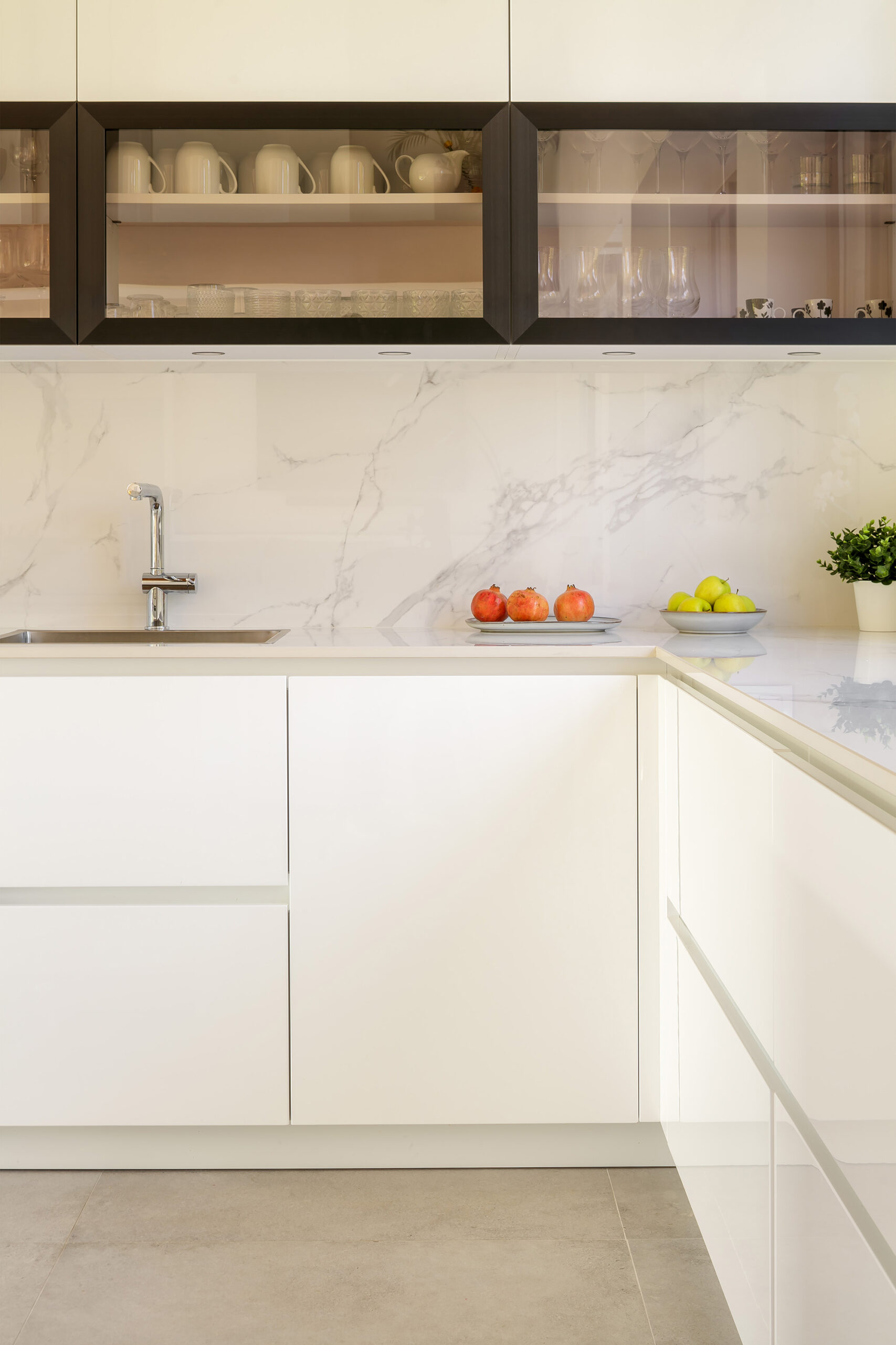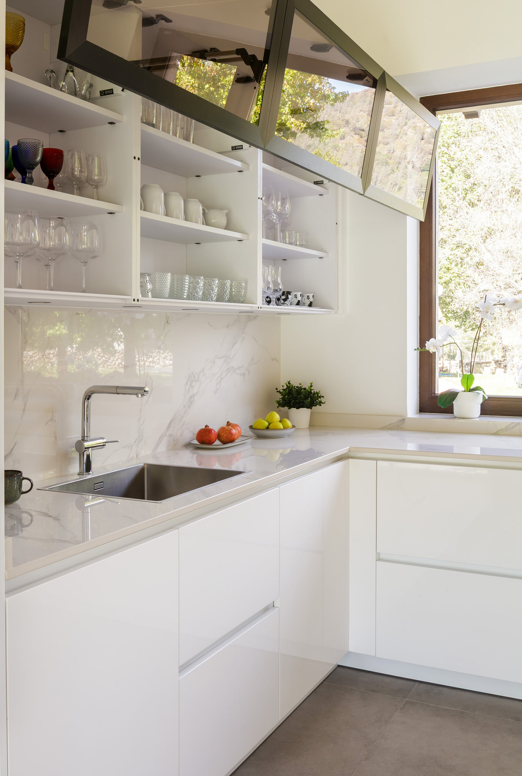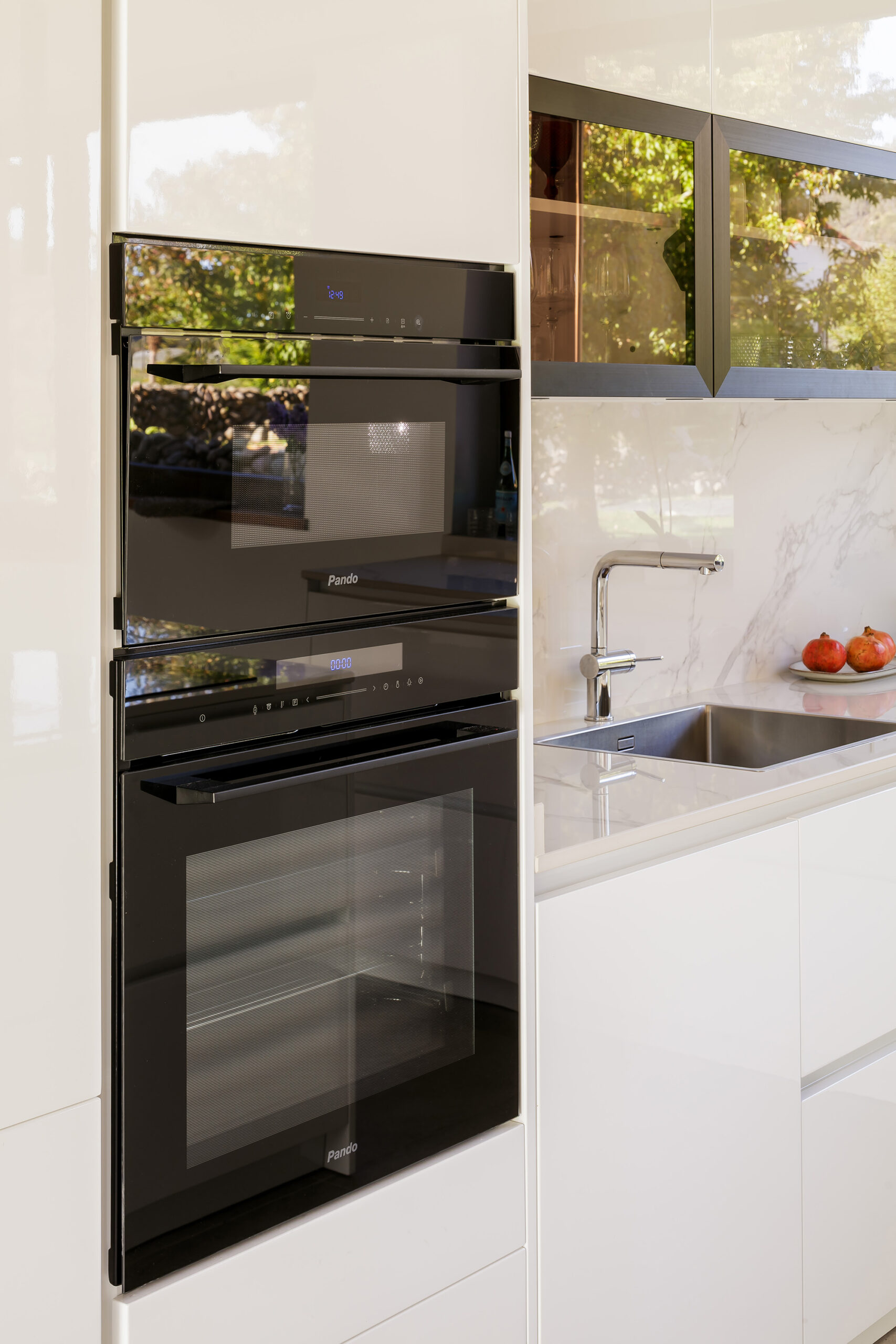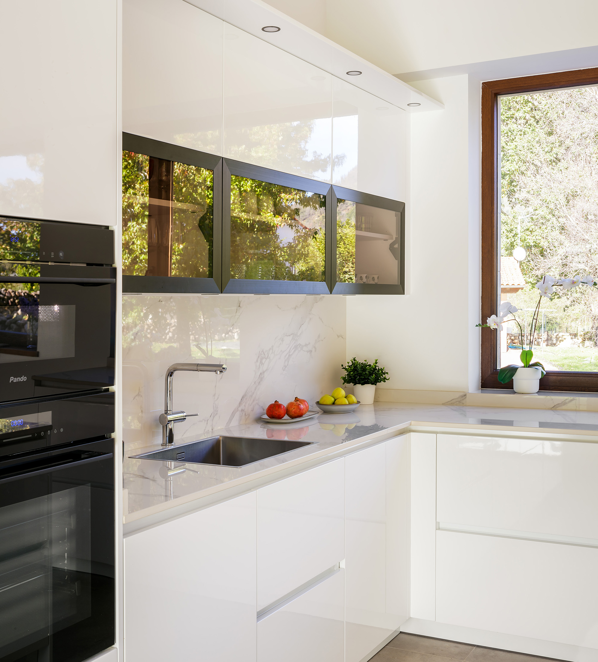 El mobiliario pertenece al modelo SENA de INKO, en lacado alto brillo con apertura gola sin tiradores, un acabado que refuerza la limpieza visual y la elegancia contemporánea del conjunto. La composición se organiza con dos columnas integradas —una destinada al frigorífico combi y otra al conjunto de horno y microondas— seguidas de la zona de aguas, donde se disponen tres módulos superiores equipados con sistema Aventos HF de Blum, cada uno con doble frente abatible que permite la apertura sincronizada del frente liso y de la vitrina con marco negro. Este recurso técnico aporta simetría, funcionalidad y una lectura arquitectónica muy equilibrada.