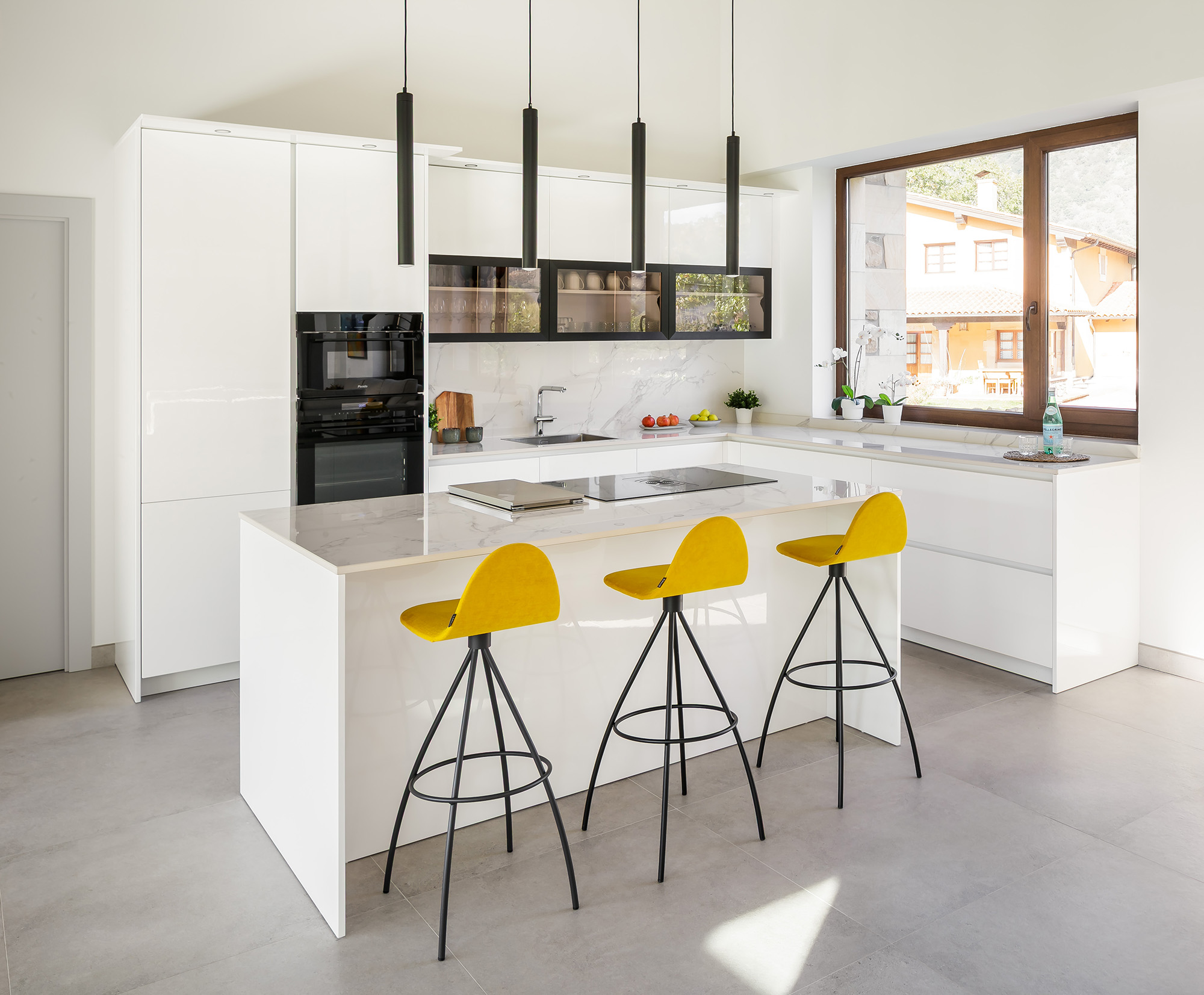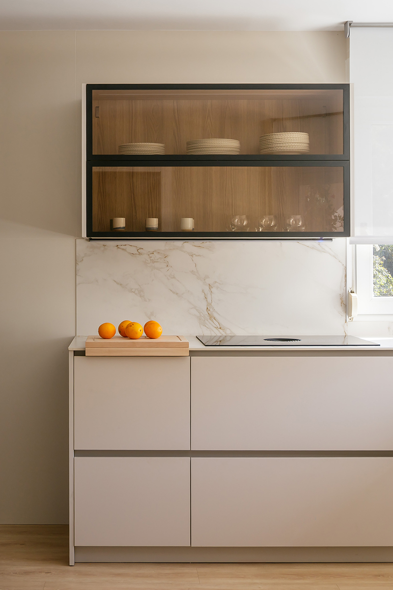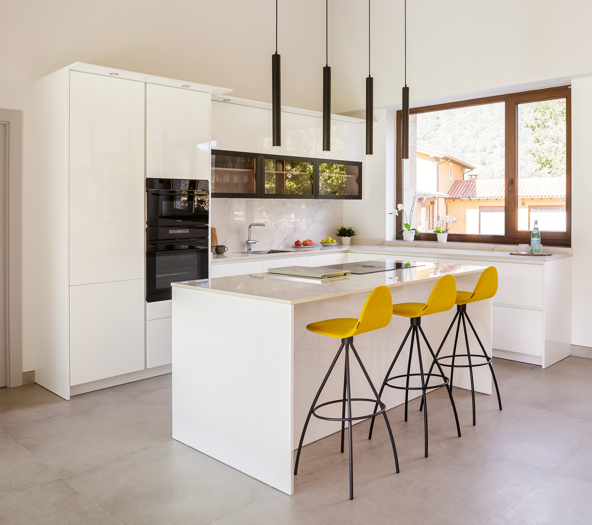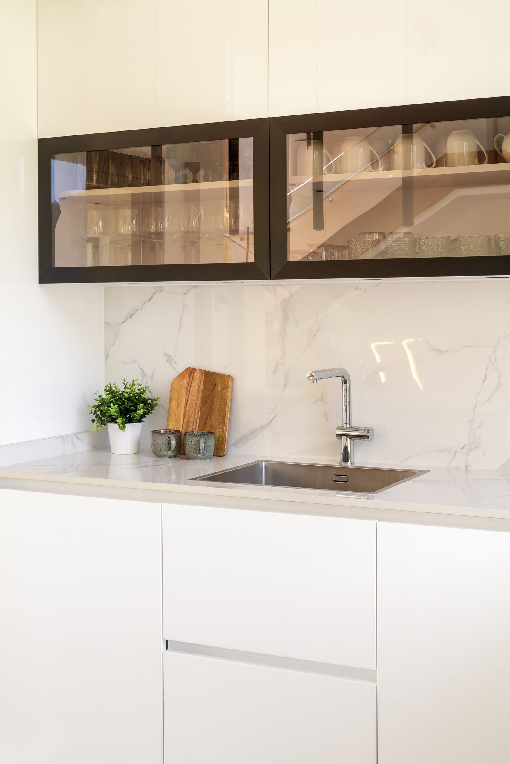 El mobiliario pertenece al modelo SENA de INKO, en lacado alto brillo con apertura gola sin tiradores, un acabado que refuerza la limpieza visual y la elegancia contemporánea del conjunto. La composición se organiza con dos columnas integradas —una destinada al frigorífico combi y otra al conjunto de horno y microondas— seguidas de la zona de aguas, donde se disponen tres módulos superiores equipados con sistema Aventos HF de Blum, cada uno con doble frente abatible que permite la apertura sincronizada del frente liso y de la vitrina con marco negro. Este recurso técnico aporta simetría, funcionalidad y una lectura arquitectónica muy equilibrada.