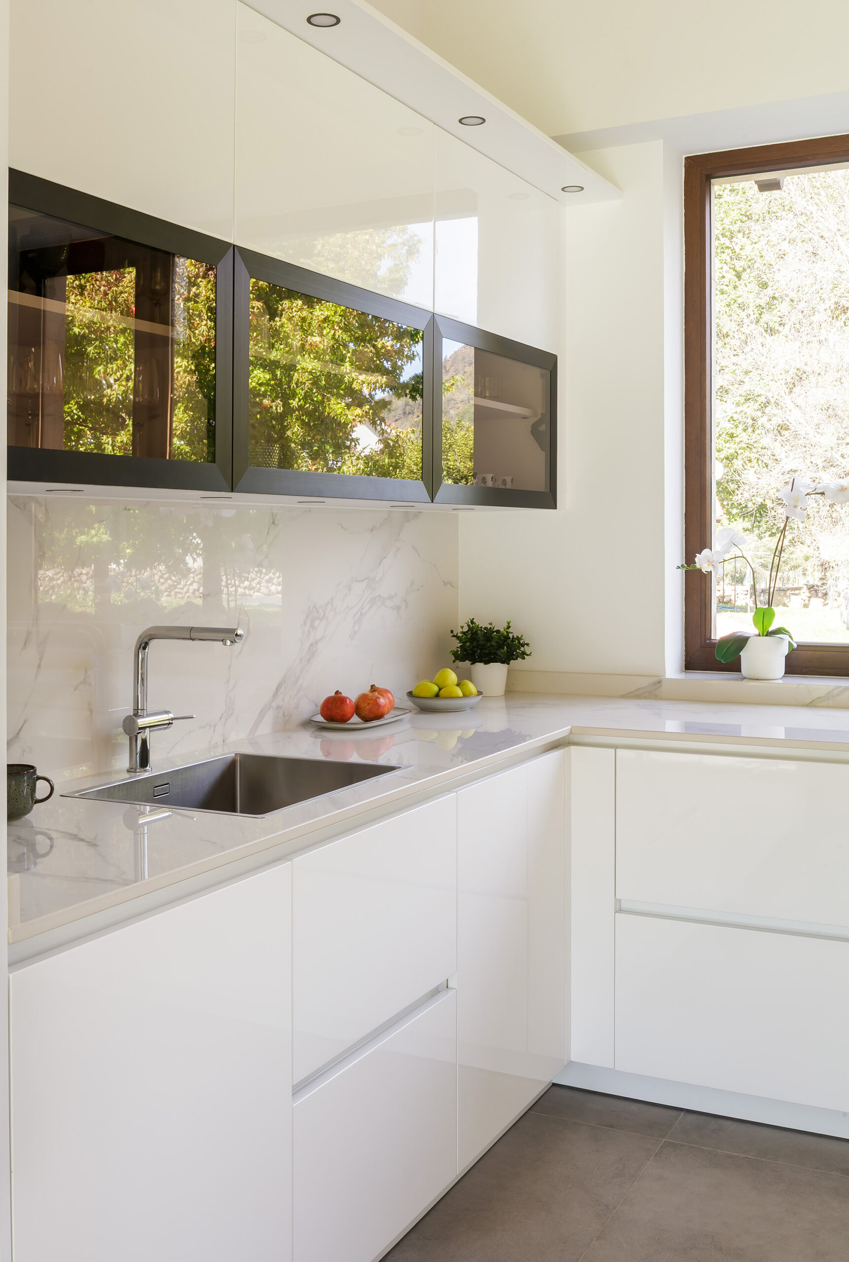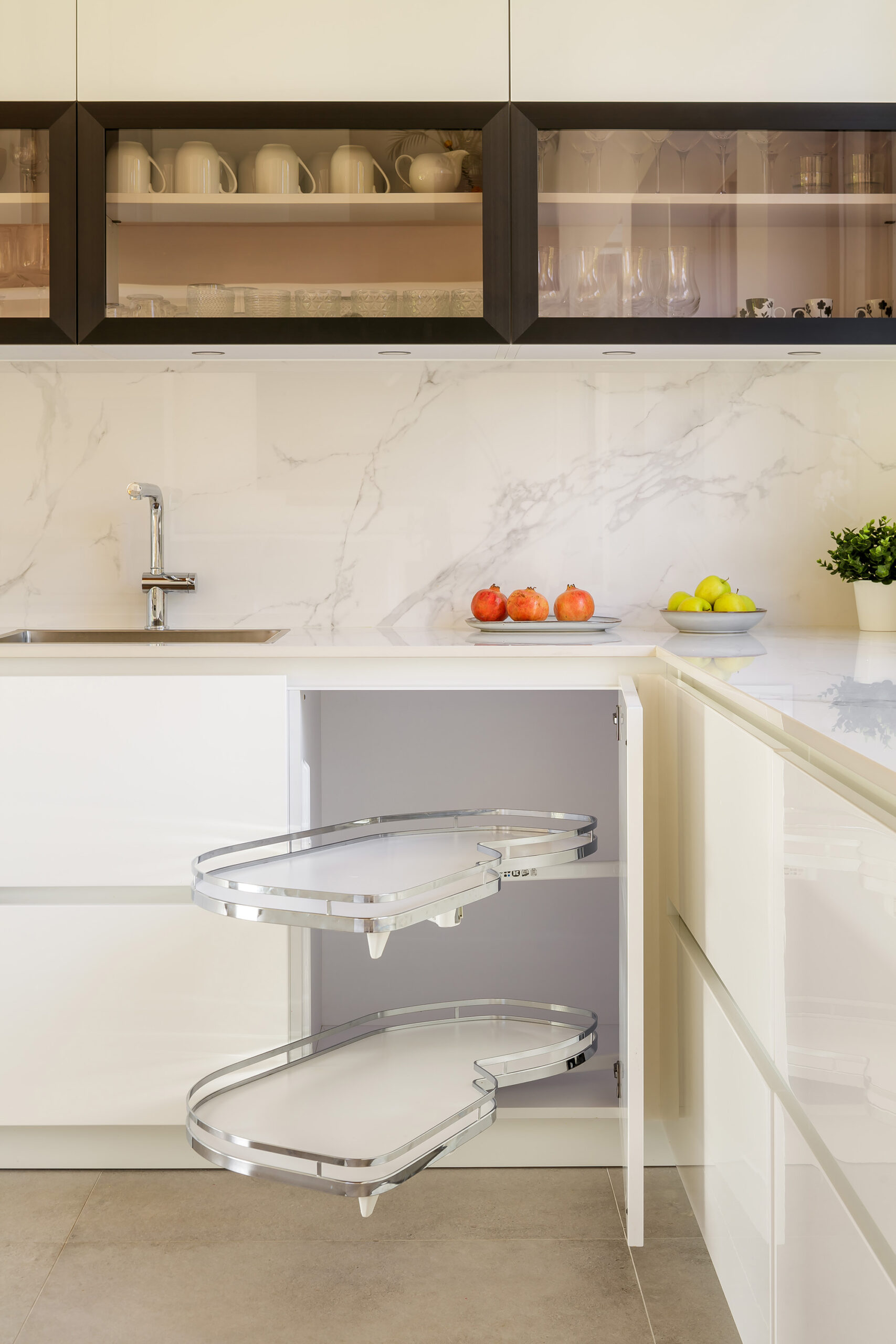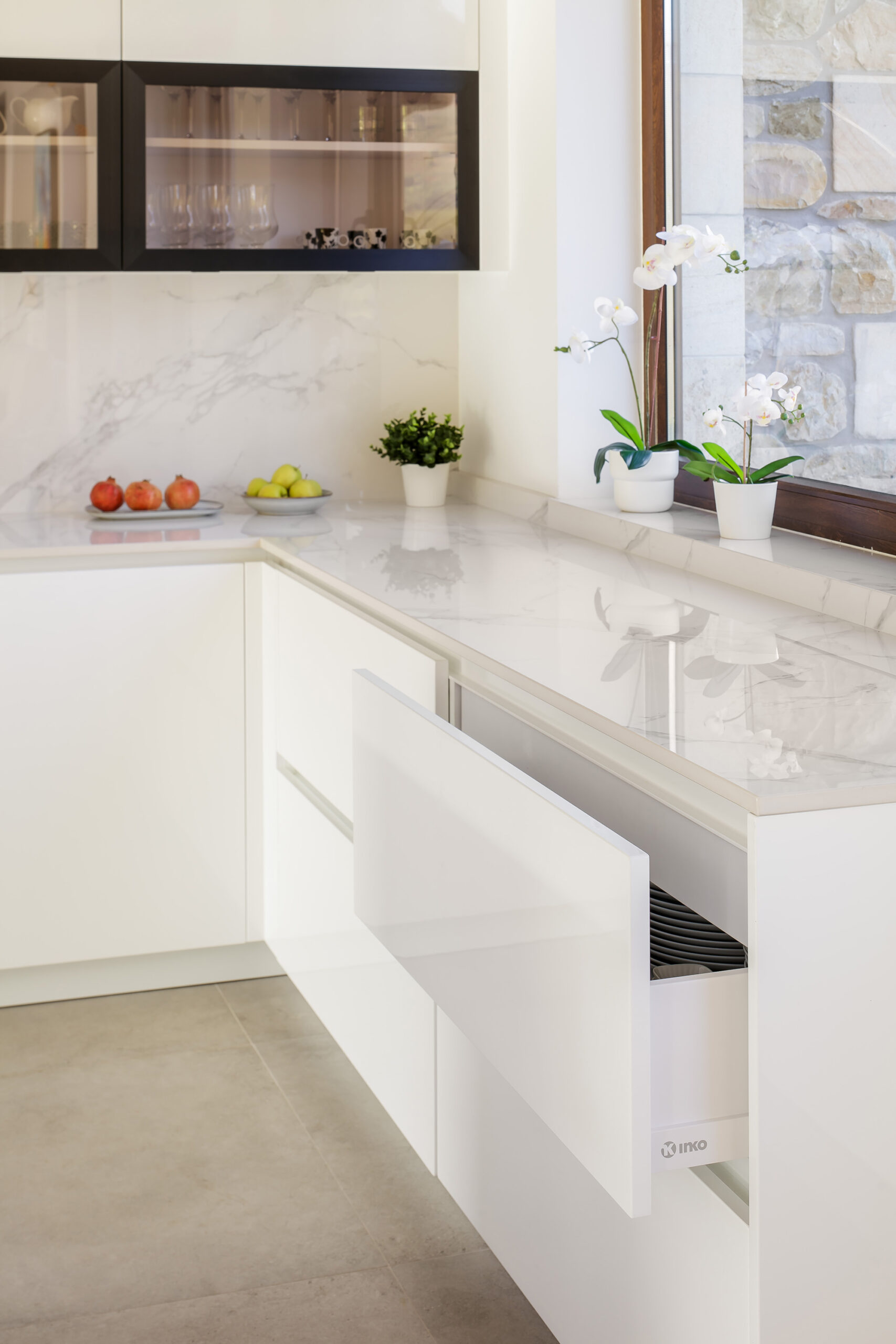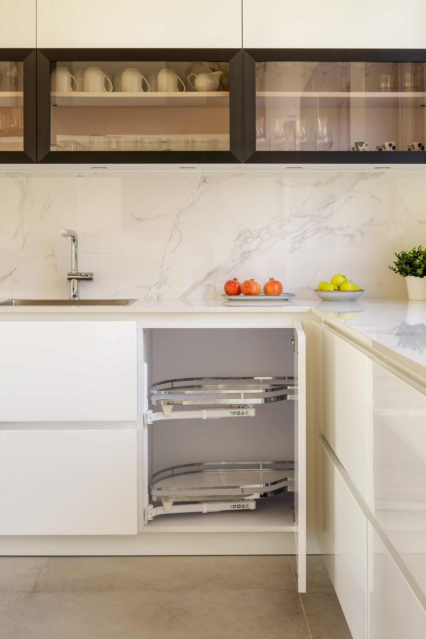 El mobiliario pertenece al modelo SENA de INKO, en lacado alto brillo con apertura gola sin tiradores, un acabado que refuerza la limpieza visual y la elegancia contemporánea del conjunto. La composición se organiza con dos columnas integradas —una destinada al frigorífico combi y otra al conjunto de horno y microondas— seguidas de la zona de aguas, donde se disponen tres módulos superiores equipados con sistema Aventos HF de Blum, cada uno con doble frente abatible que permite la apertura sincronizada del frente liso y de la vitrina con marco negro. Este recurso técnico aporta simetría, funcionalidad y una lectura arquitectónica muy equilibrada.
