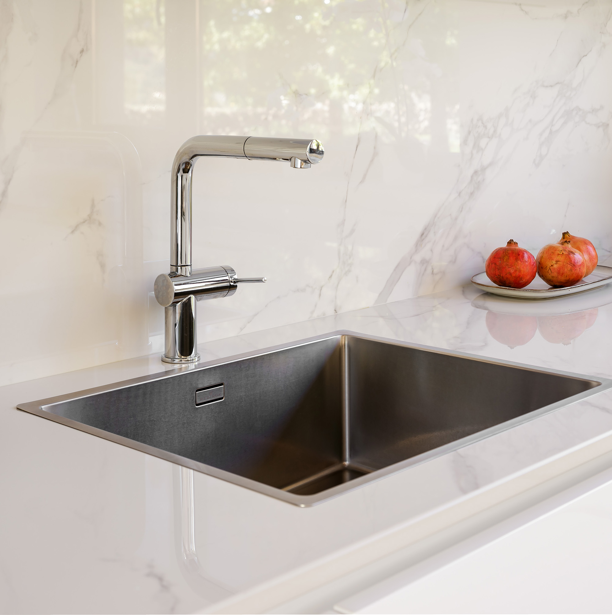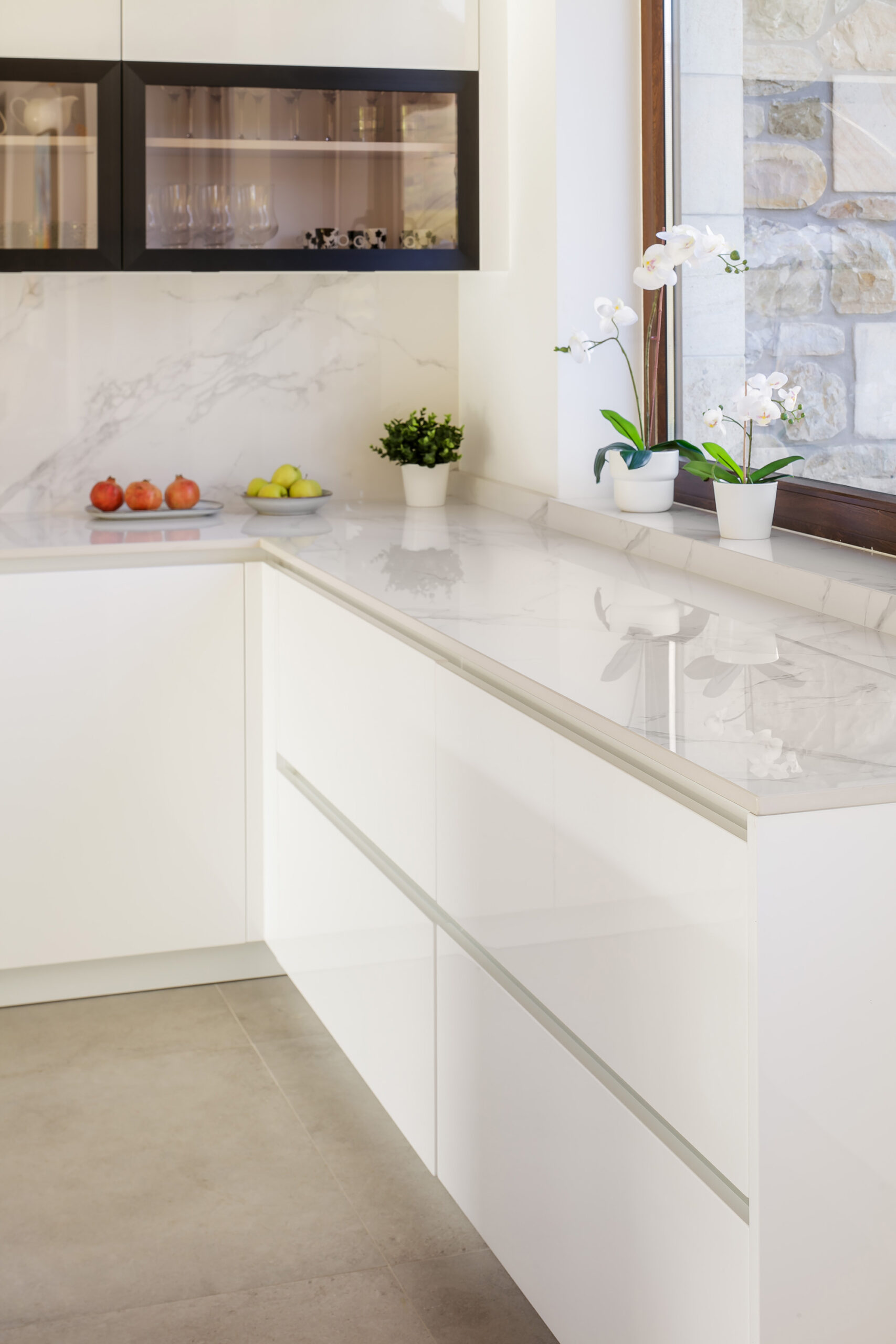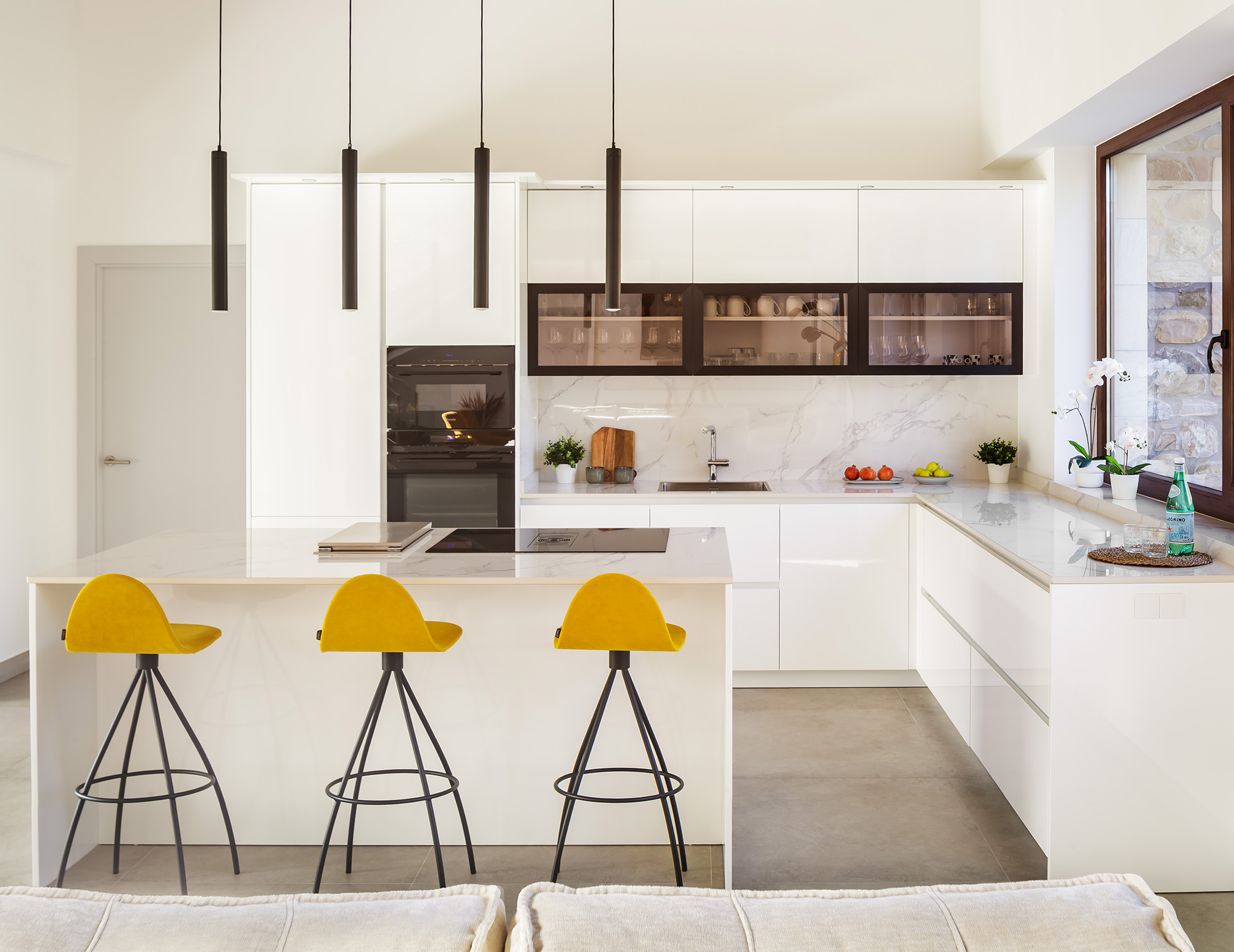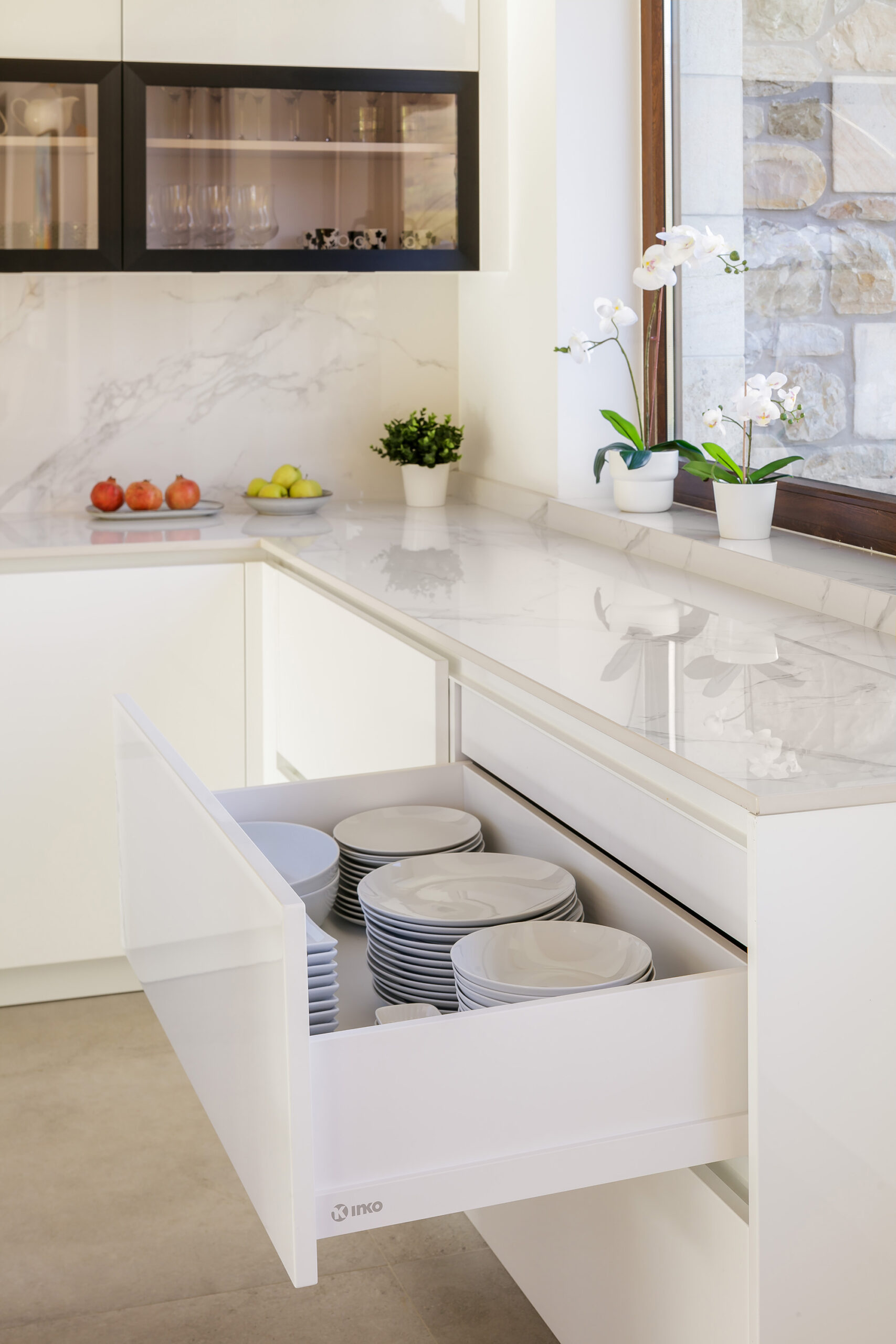 El mobiliario pertenece al modelo SENA de INKO, en lacado alto brillo con apertura gola sin tiradores, un acabado que refuerza la limpieza visual y la elegancia contemporánea del conjunto. La composición se organiza con dos columnas integradas —una destinada al frigorífico combi y otra al conjunto de horno y microondas— seguidas de la zona de aguas, donde se disponen tres módulos superiores equipados con sistema Aventos HF de Blum, cada uno con doble frente abatible que permite la apertura sincronizada del frente liso y de la vitrina con marco negro. Este recurso técnico aporta simetría, funcionalidad y una lectura arquitectónica muy equilibrada.
