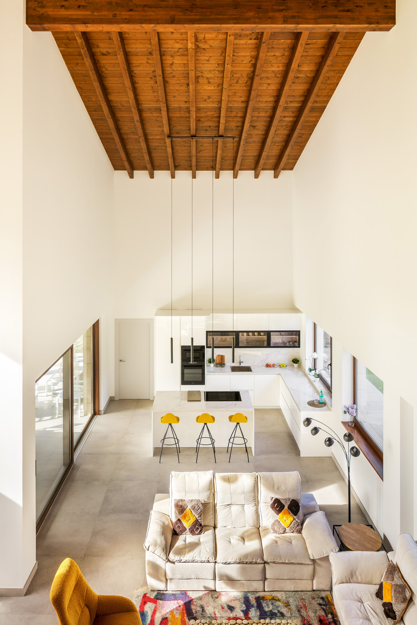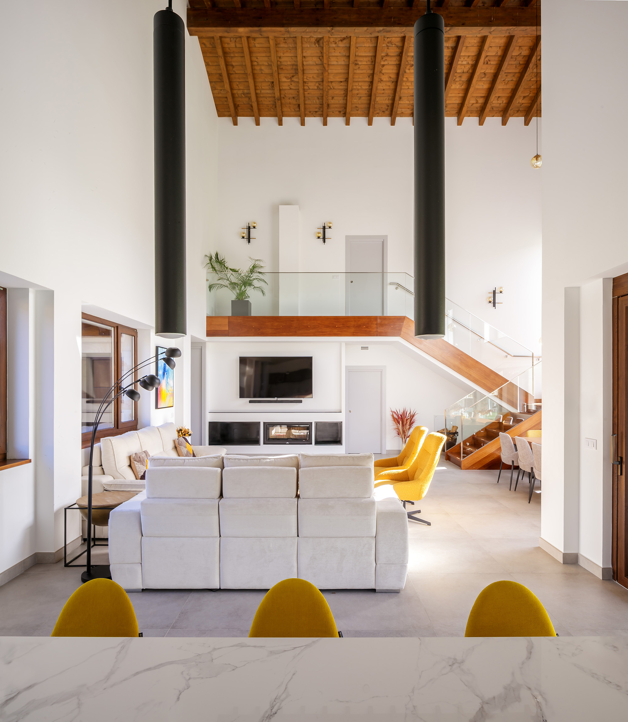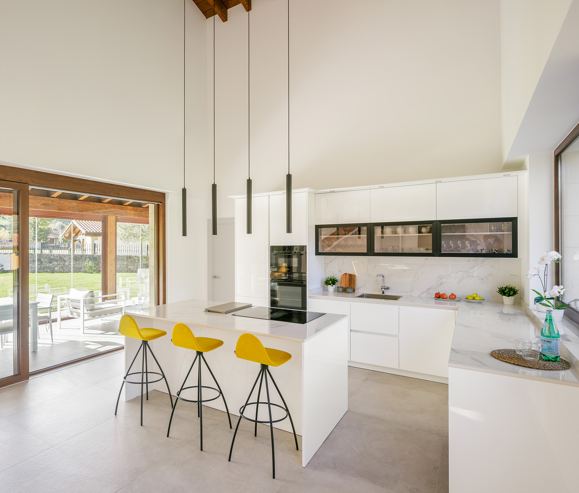 En este proyecto, la cocina se concibe como el eje central de un espacio de doble altura y concepto abierto al salón, donde la luz natural procedente de los amplios ventanales potencia la sensación de amplitud y continuidad. La distribución en L, complementada con una isla central, permite organizar las zonas de frío, aguas y cocción de forma funcional y equilibrada. El contraste entre el techo de madera y el blanco lacado del mobiliario genera un ambiente cálido y luminoso, marcado por la pureza de líneas y la armonía visual.