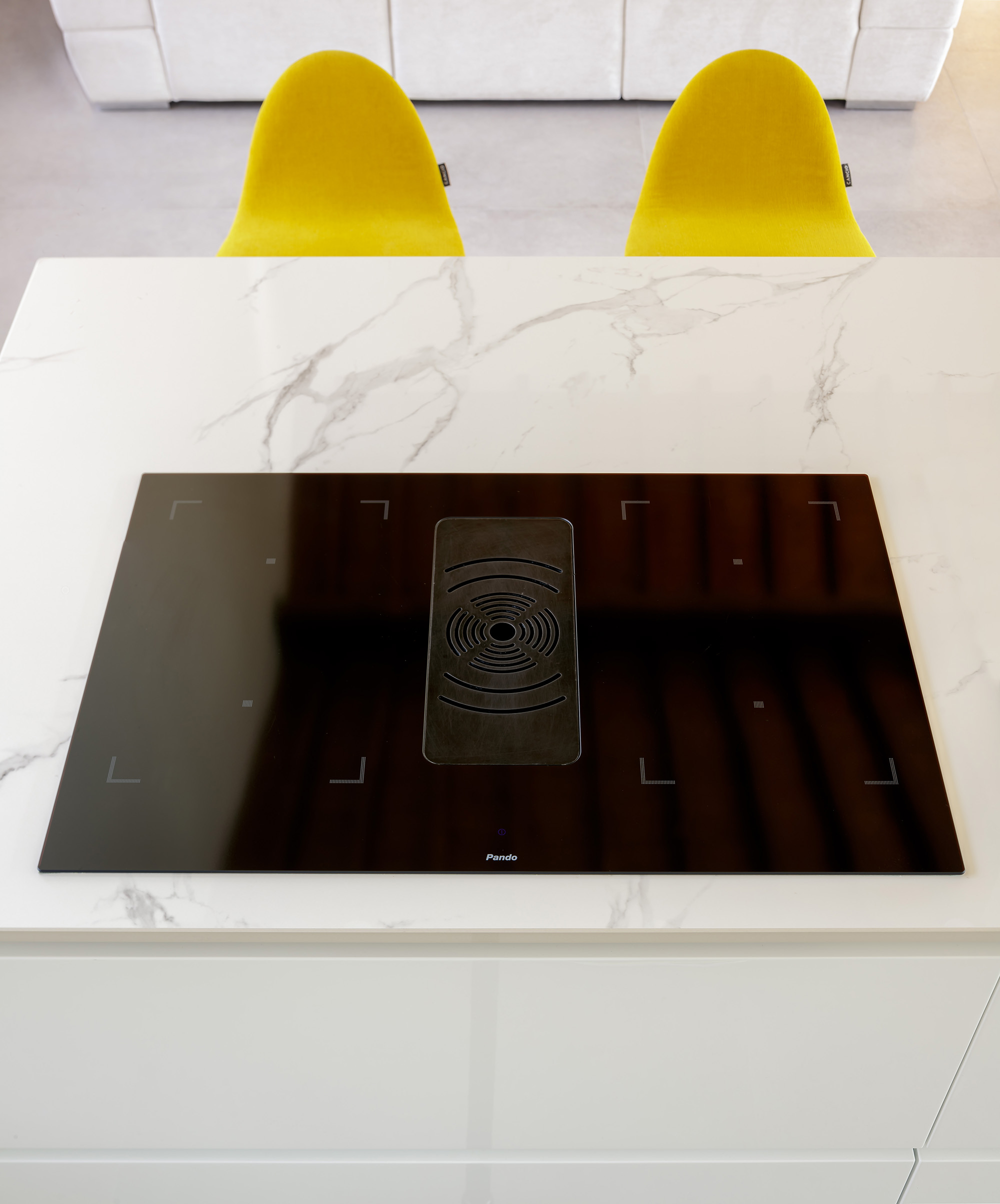 En el mueble bajo de rincón se ha incorporado un sistema LeMans, que optimiza el almacenamiento y facilita el acceso a los utensilios. La encimera y el aplacado en Dekton Natura unifican las superficies con un veteado marmoleado sutil y resistente, aportando un carácter sobrio y atemporal. La isla central integra la zona de cocción, equipada con una placa con extractor integrado Pando E-391 y una freidora de superficie NOVY, ambos perfectamente alineados en el plano de trabajo. En su parte posterior, una zona volada con taburetes Cancio Petris 75 en color mostaza introduce un punto de contraste cromático. Las luminarias cilíndricas suspendidas sobre la isla refuerzan la verticalidad del espacio y aportan equilibrio a un ambiente pensado para convivir, disfrutar y cocinar con comodidad.