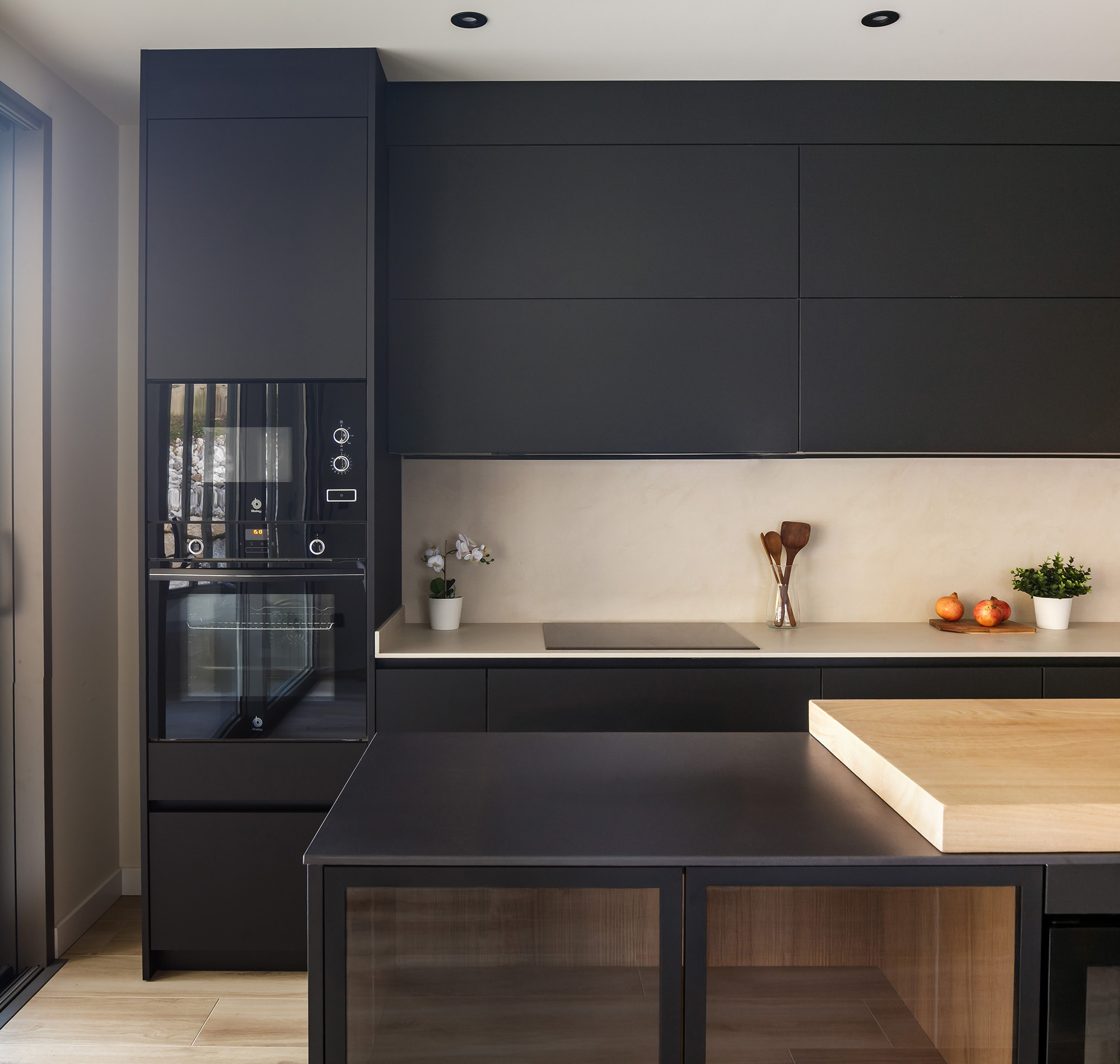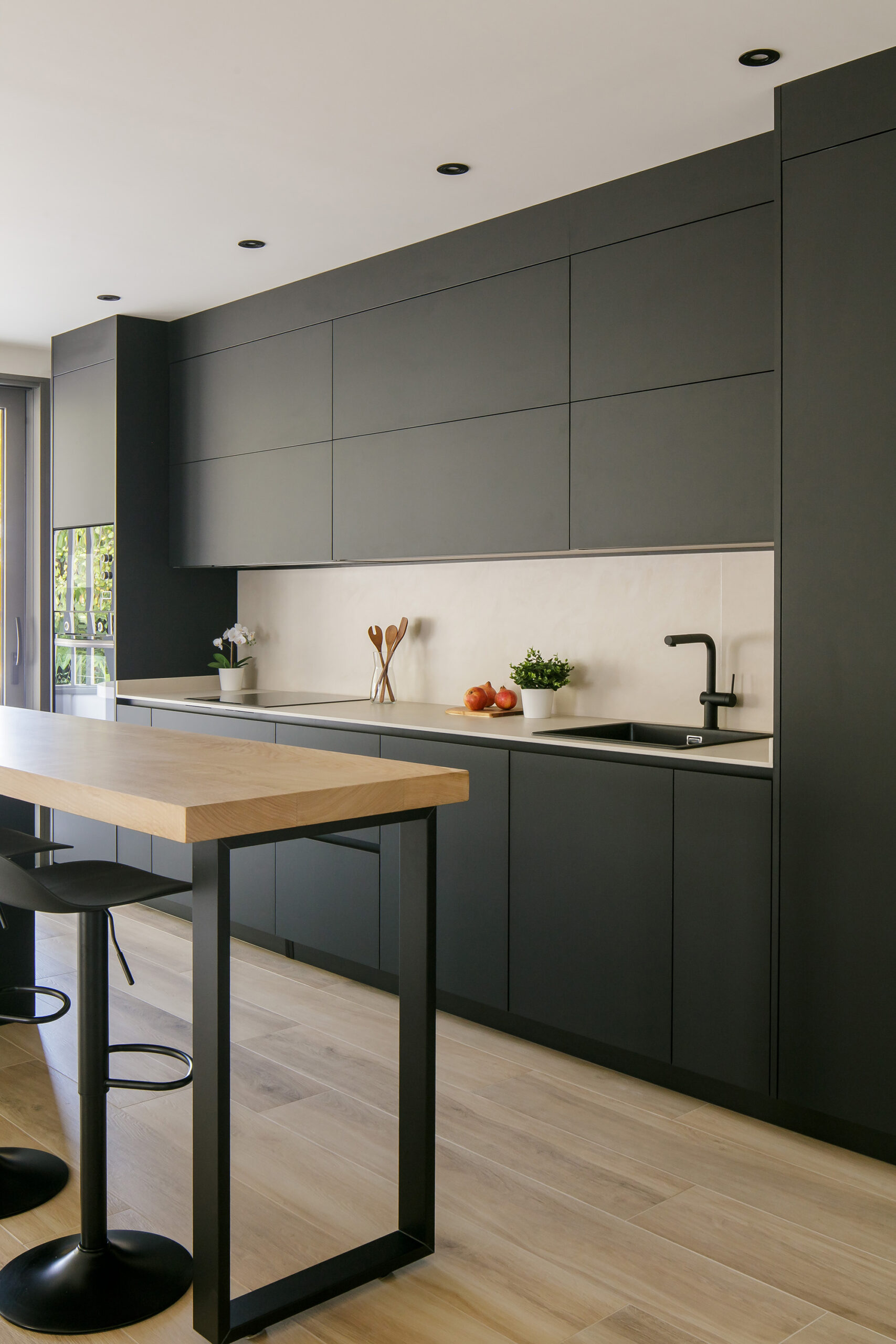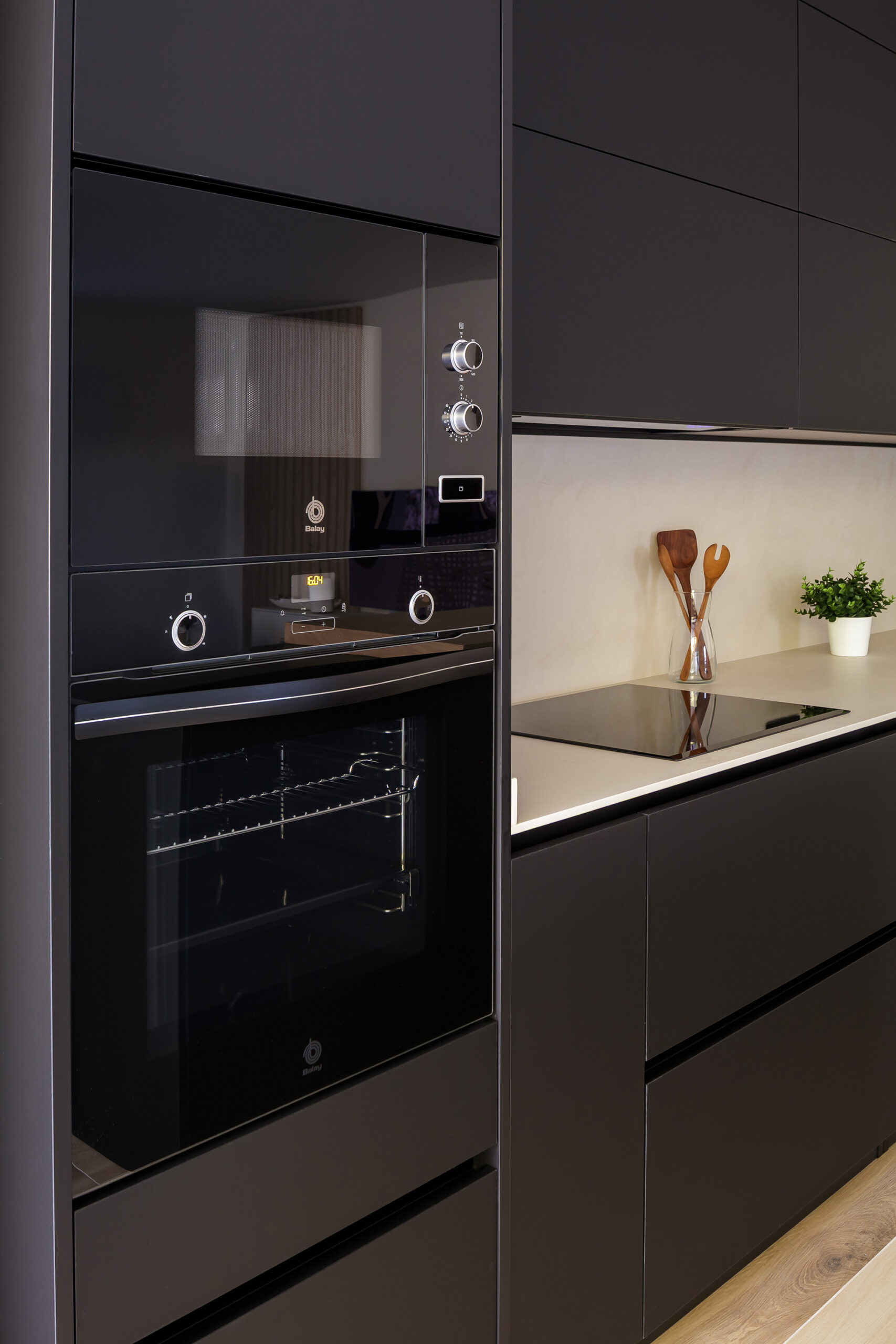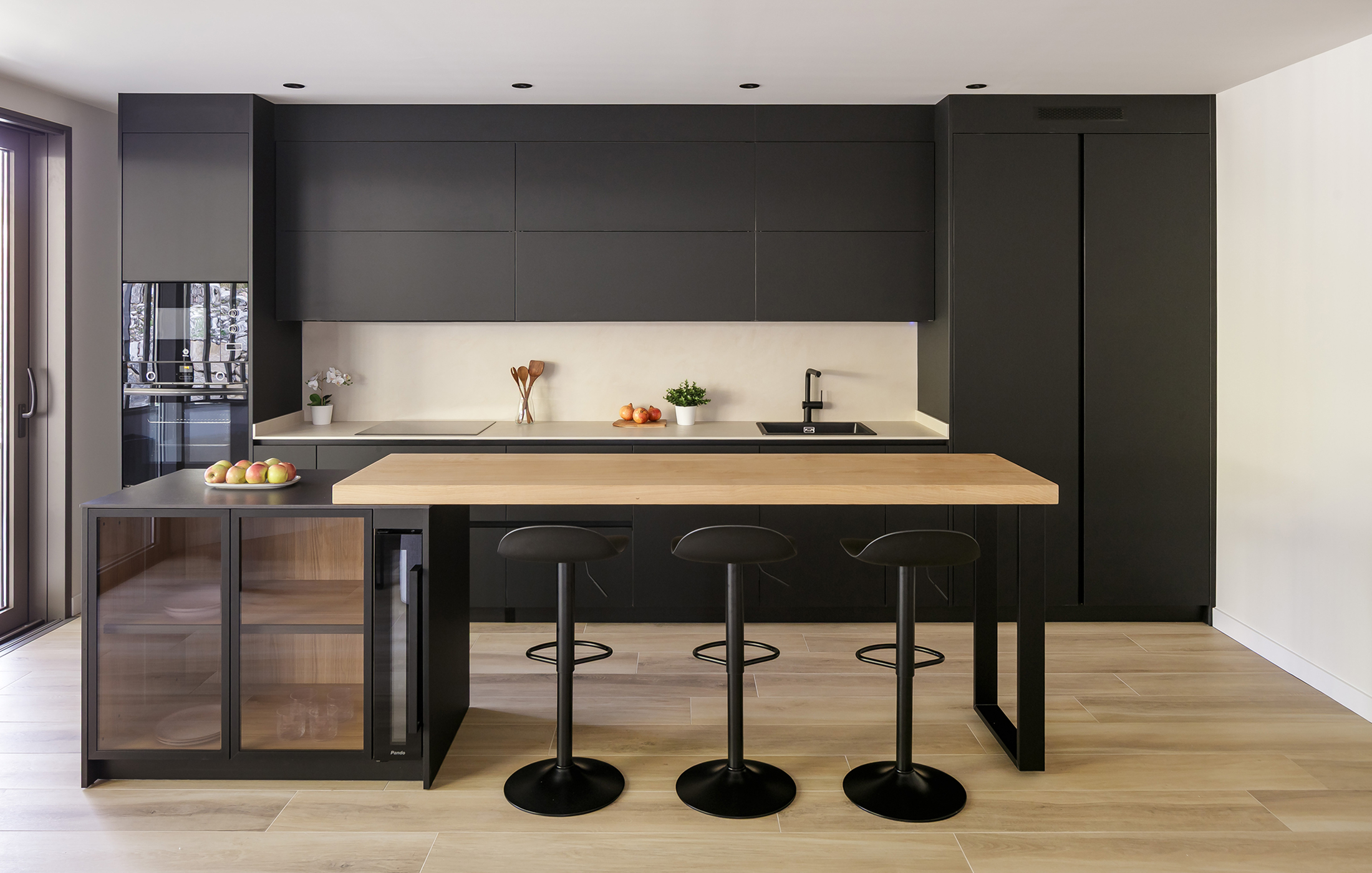 En Cabezón de la Sal (Cantabria), esta cocina abierta al salón se organiza en una distribución en paralelo que potencia la claridad y la funcionalidad del espacio. El mobiliario se resuelve con frentes modelo SMART en acabado negro mate de INKO, aportando sobriedad y una lectura continua desde la zona de día. En la pared principal, la columna con horno y microondas se combina con las de frigorífico y congelador integrados, manteniendo una estética limpia en un ambiente compartido con el salón. Entre estos volúmenes se desarrolla la superficie de trabajo principal, que reúne la zona de cocción con campana integrada en los muebles altos horizontales y la zona de aguas, ambas ejecutadas sobre encimera y trasera en Dekton Nacre.