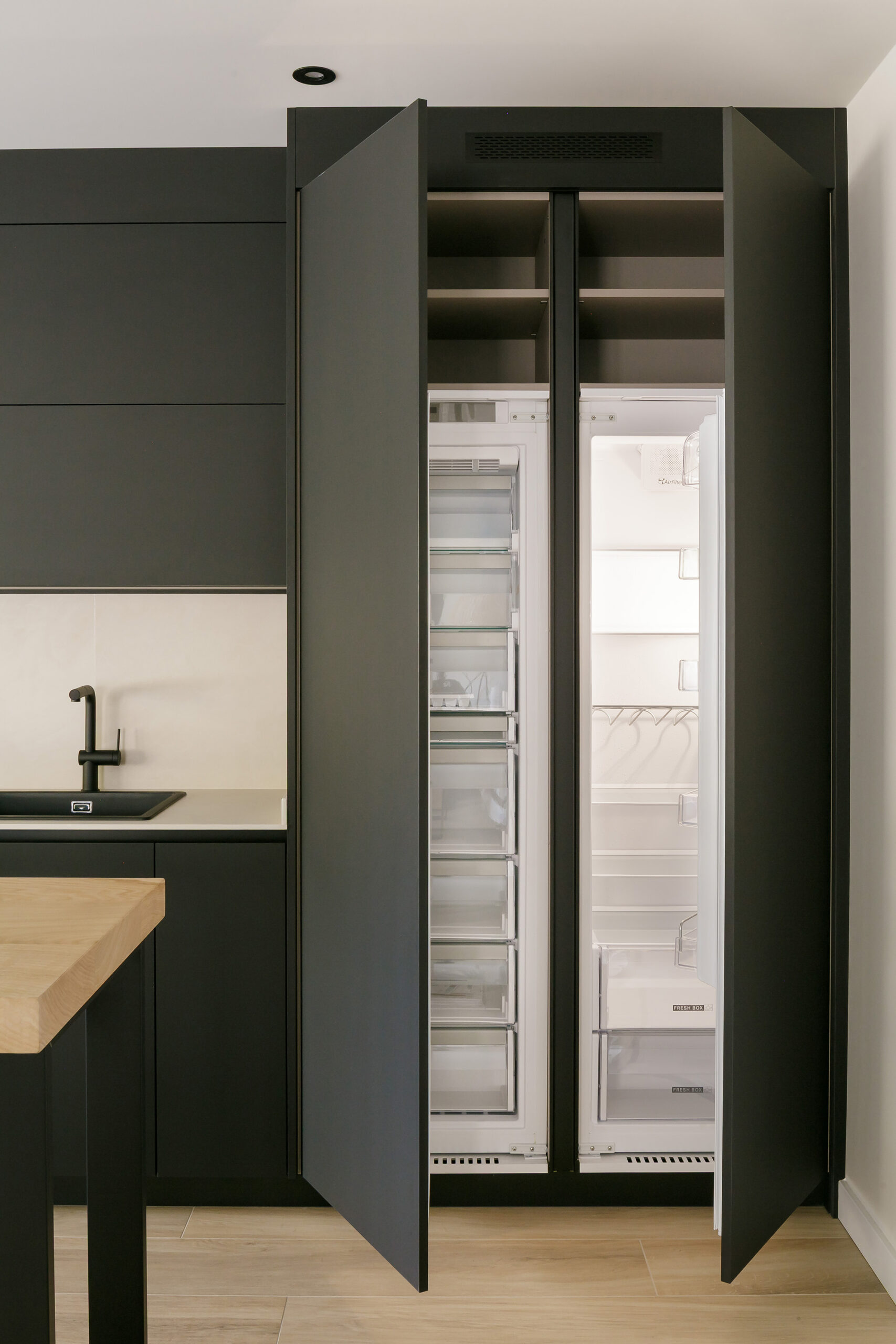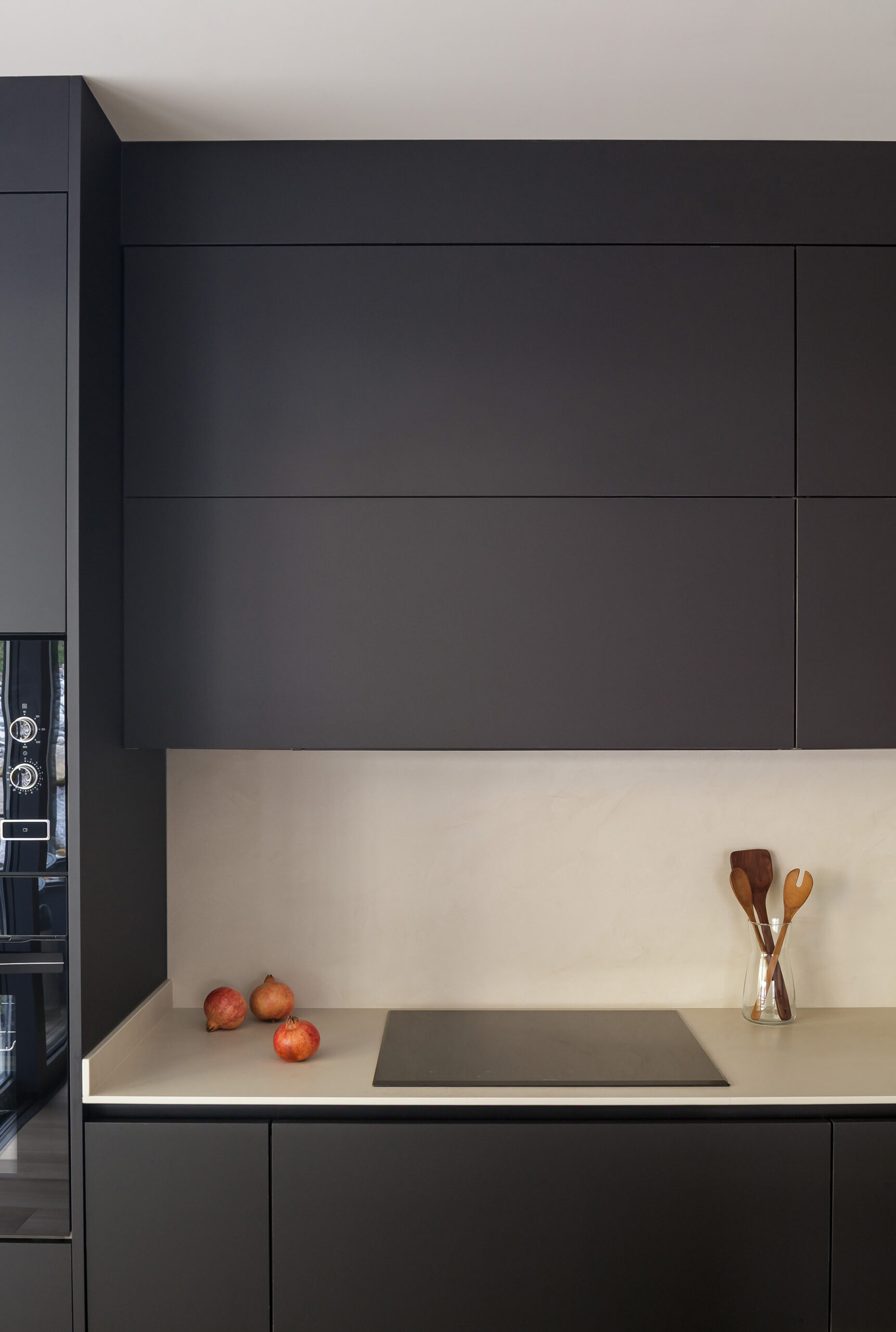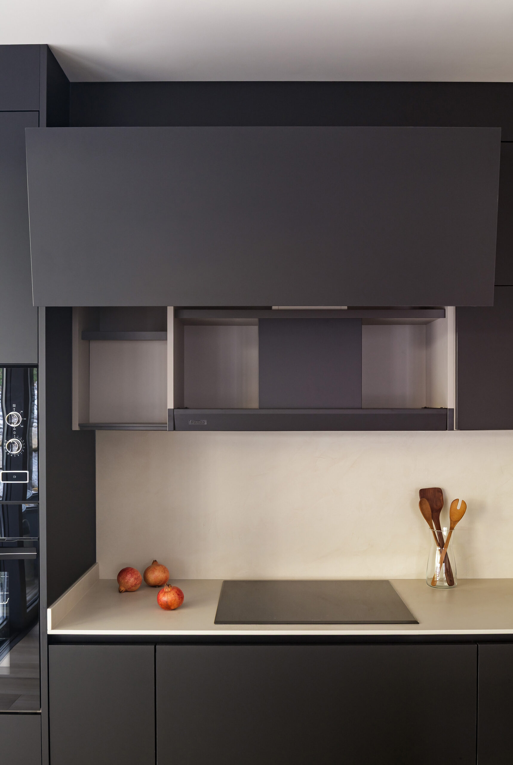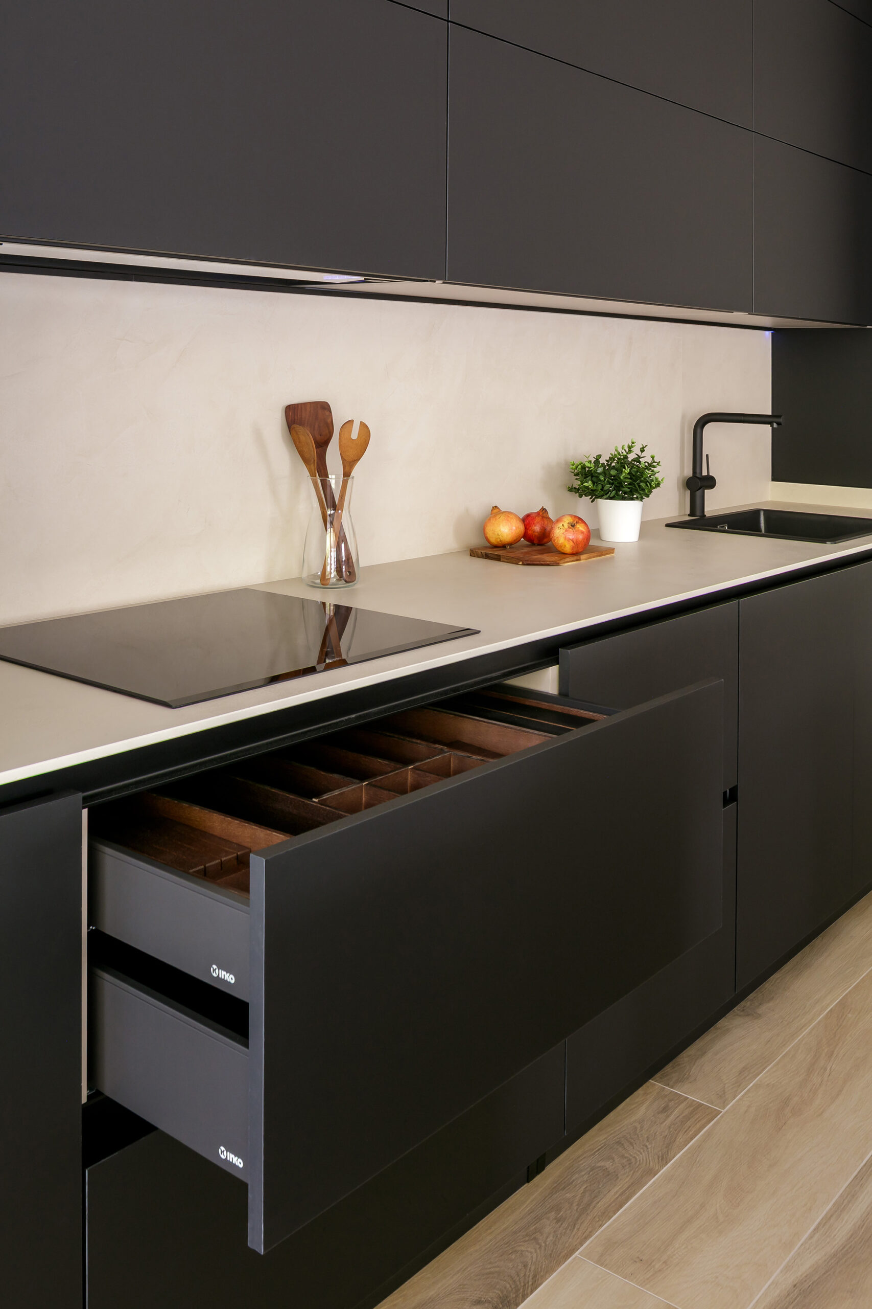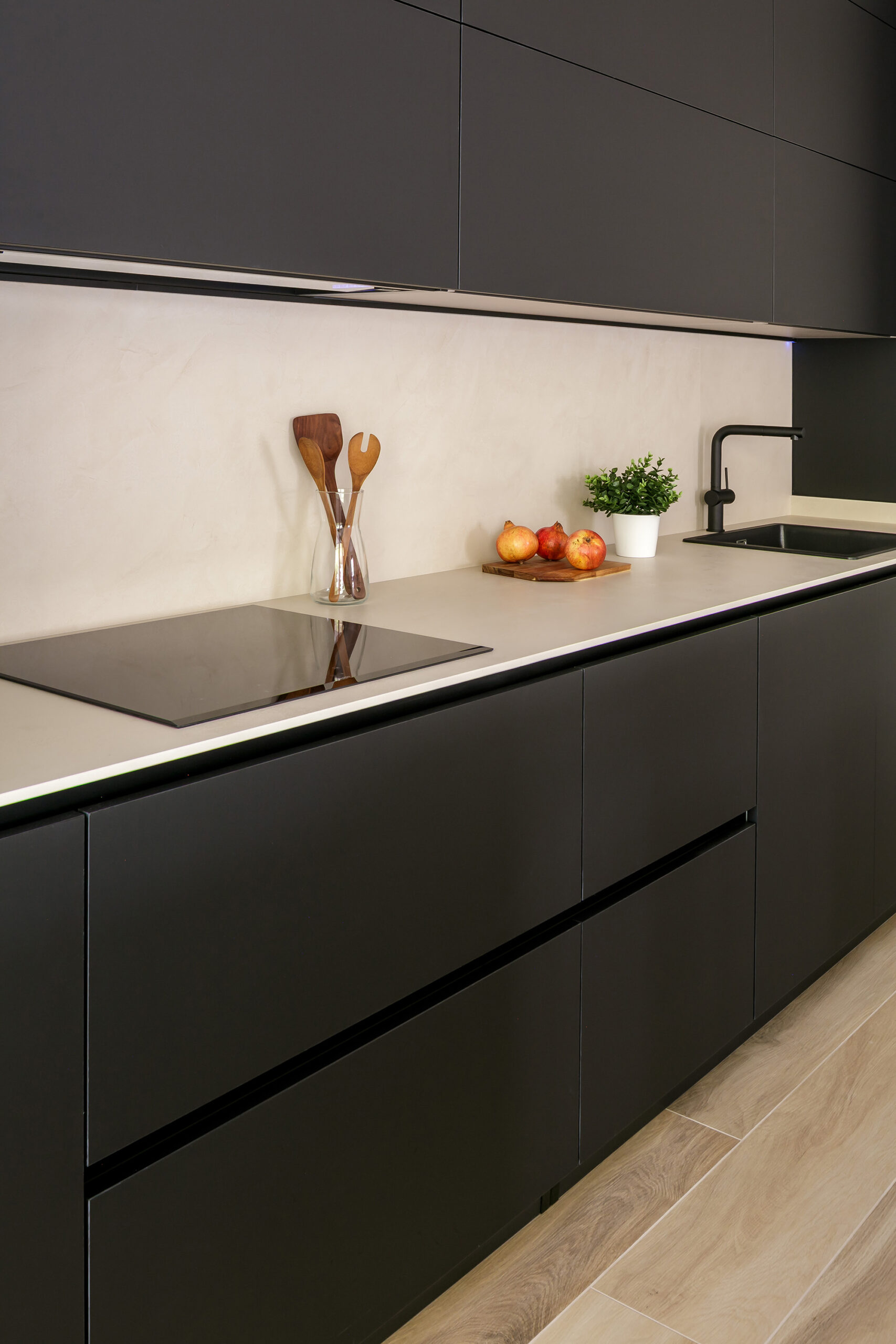 En Cabezón de la Sal (Cantabria), esta cocina abierta al salón se organiza en una distribución en paralelo que potencia la claridad y la funcionalidad del espacio. El mobiliario se resuelve con frentes modelo SMART en acabado negro mate de INKO, aportando sobriedad y una lectura continua desde la zona de día. En la pared principal, la columna con horno y microondas se combina con las de frigorífico y congelador integrados, manteniendo una estética limpia en un ambiente compartido con el salón. Entre estos volúmenes se desarrolla la superficie de trabajo principal, que reúne la zona de cocción con campana integrada en los muebles altos horizontales y la zona de aguas, ambas ejecutadas sobre encimera y trasera en Dekton Nacre.