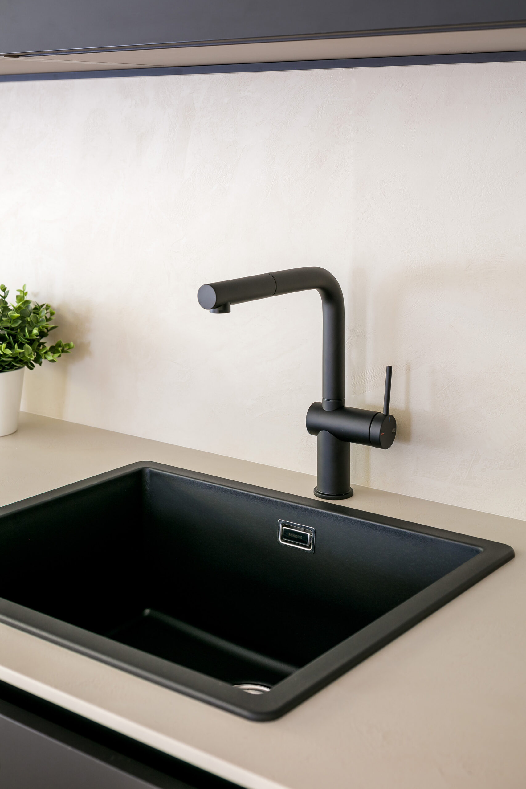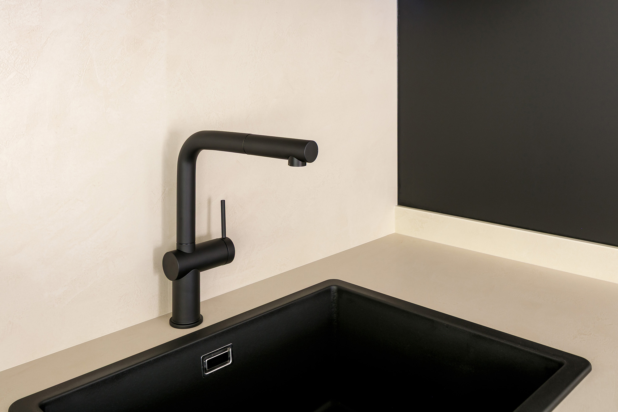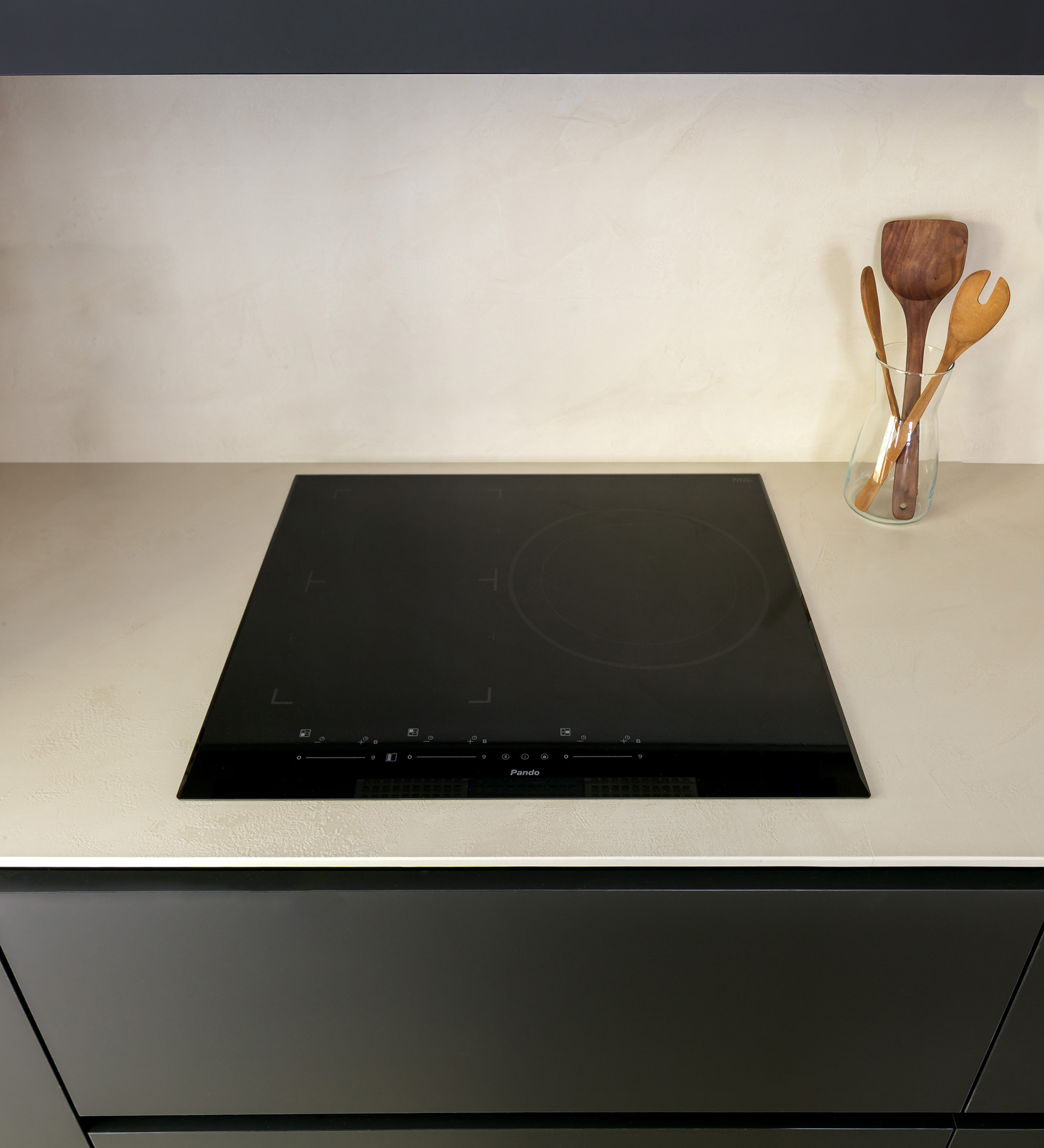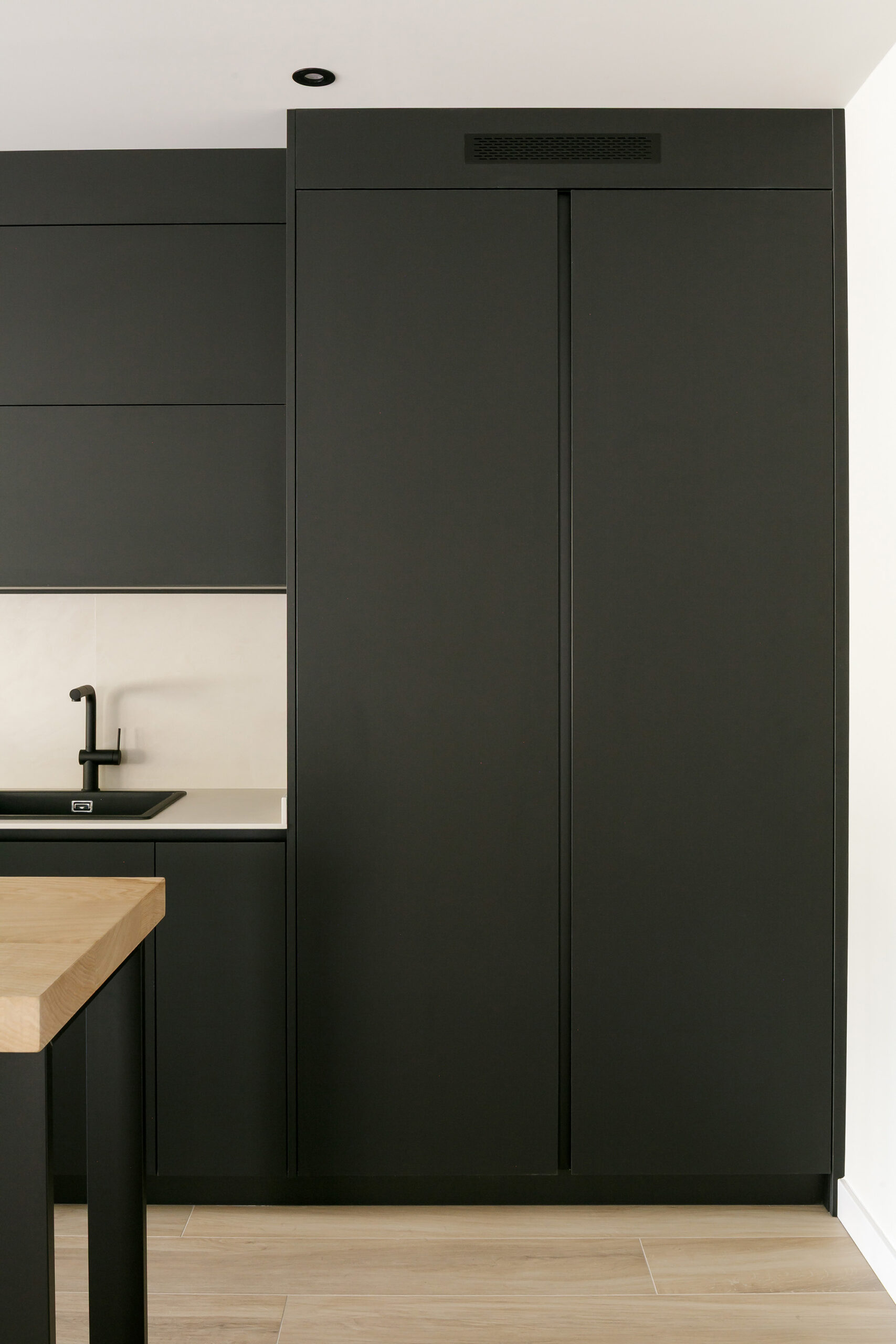 En Cabezón de la Sal (Cantabria), esta cocina abierta al salón se organiza en una distribución en paralelo que potencia la claridad y la funcionalidad del espacio. El mobiliario se resuelve con frentes modelo SMART en acabado negro mate de INKO, aportando sobriedad y una lectura continua desde la zona de día. En la pared principal, la columna con horno y microondas se combina con las de frigorífico y congelador integrados, manteniendo una estética limpia en un ambiente compartido con el salón. Entre estos volúmenes se desarrolla la superficie de trabajo principal, que reúne la zona de cocción con campana integrada en los muebles altos horizontales y la zona de aguas, ambas ejecutadas sobre encimera y trasera en Dekton Nacre.