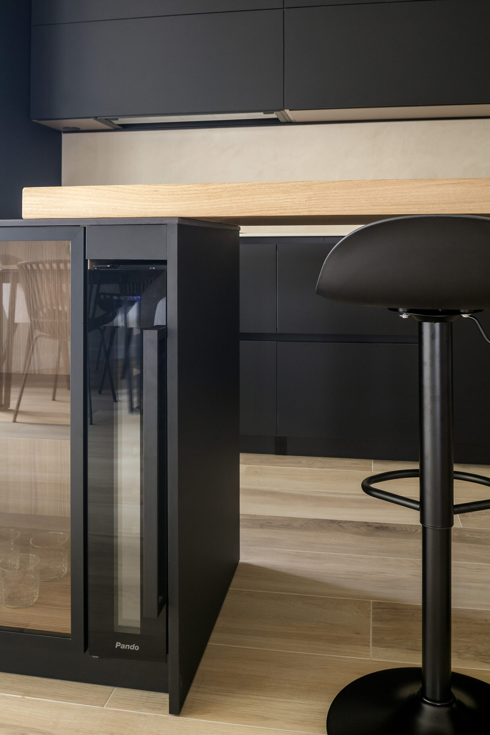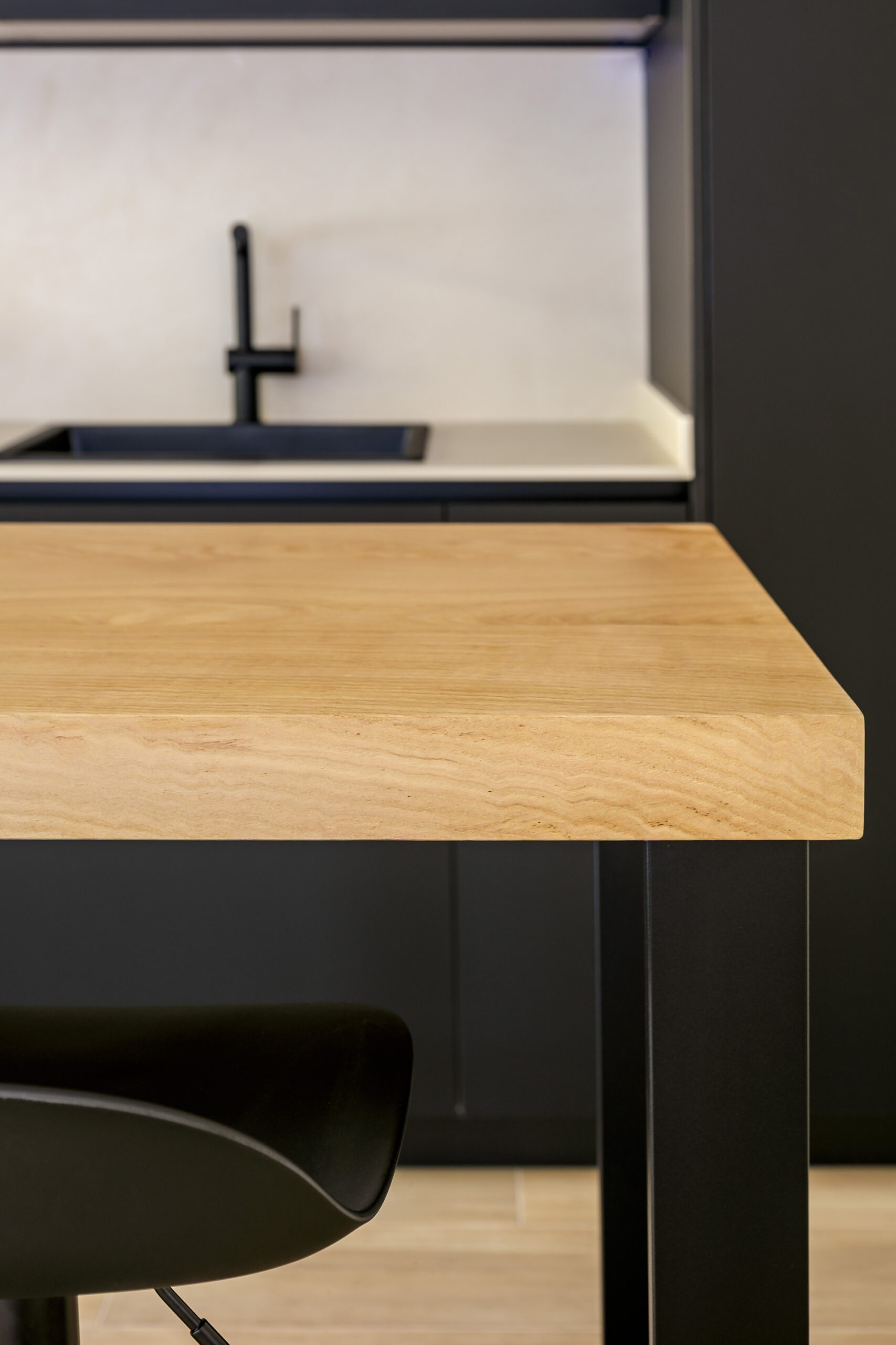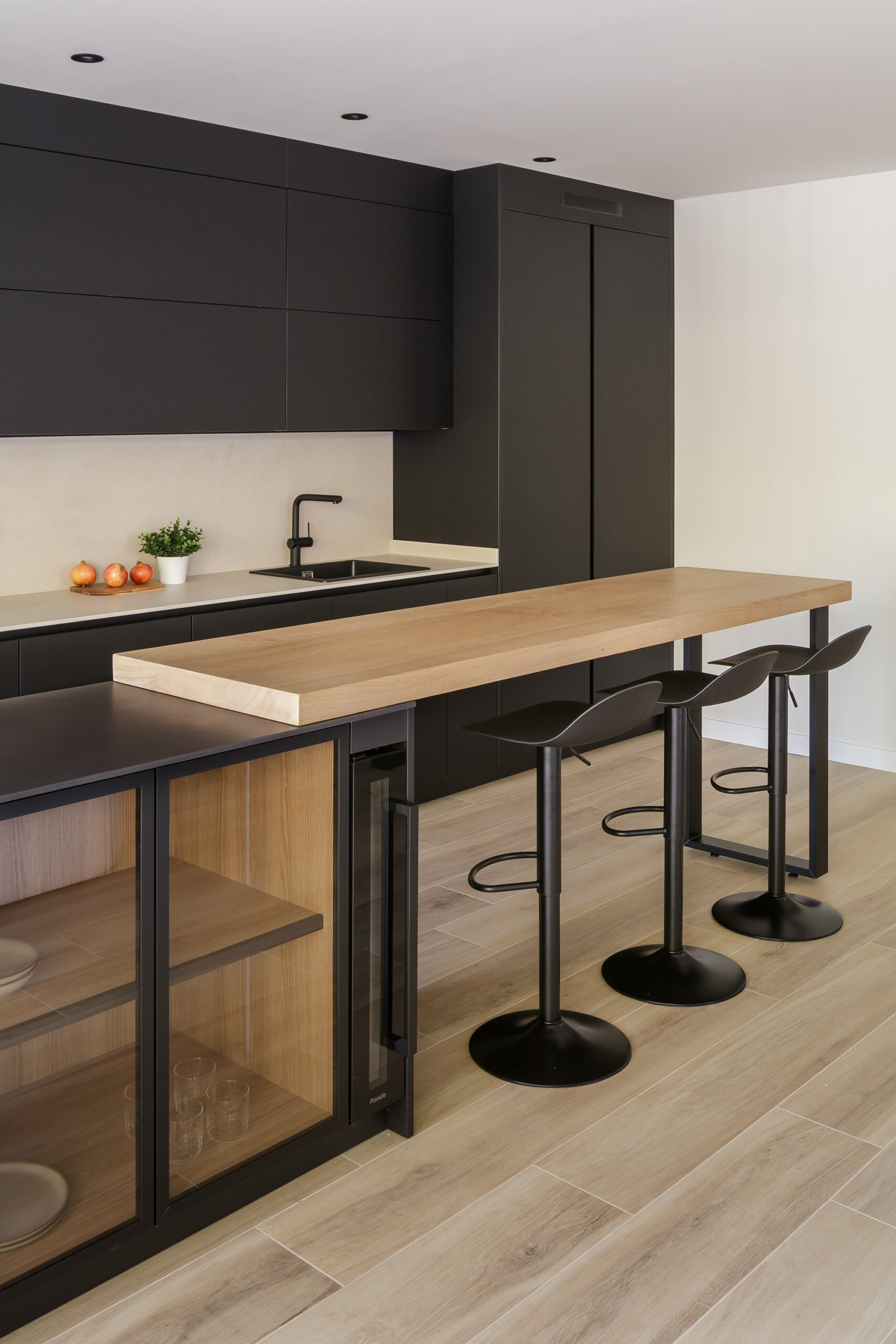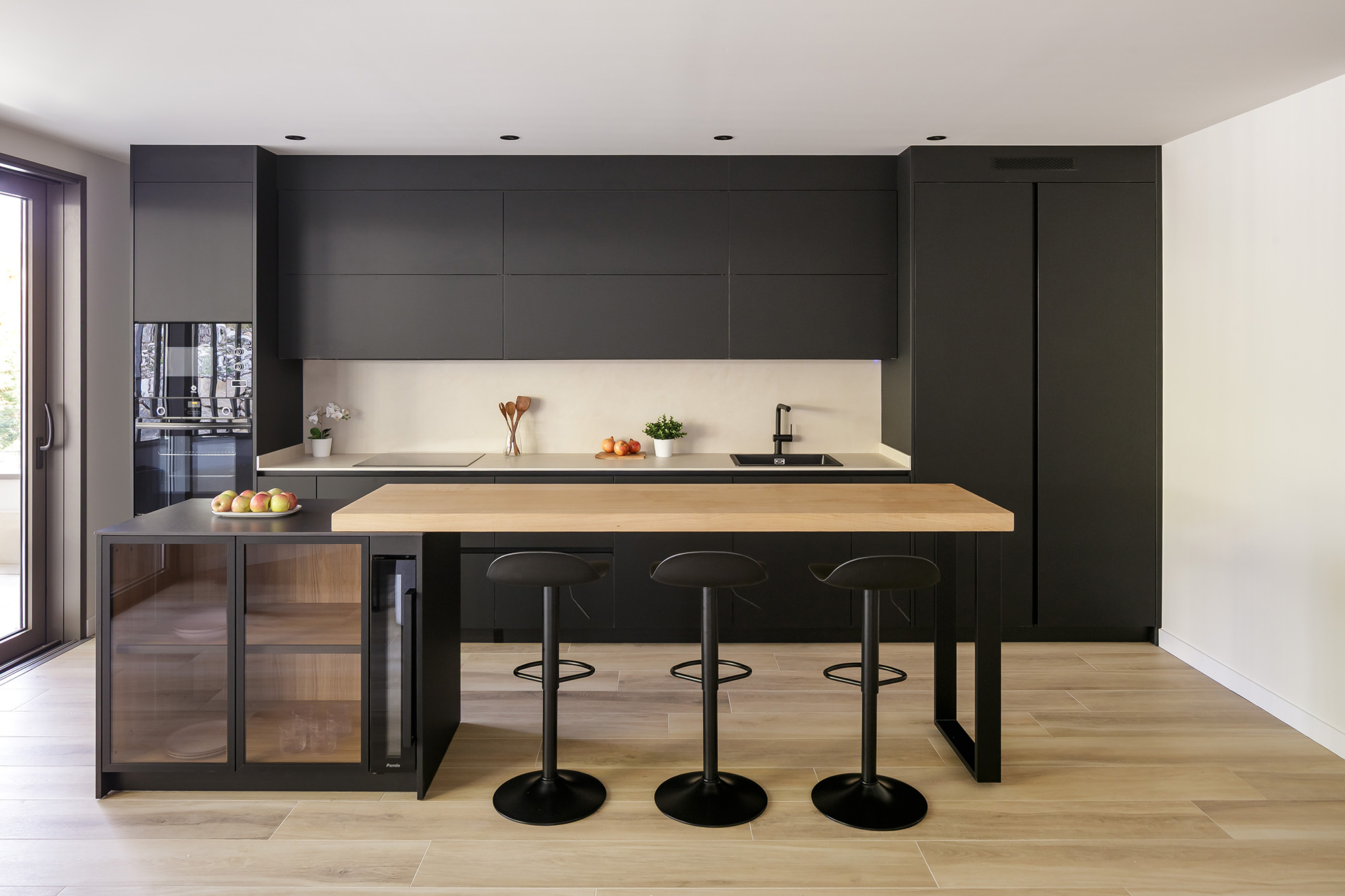 El proyecto culmina con una isla central que articula la transición hacia la zona de estar. En su cara exterior incorpora una vitrina decorativa con interior en madera y una vinoteca, aportando calidez y un punto de interés visual. Sobre ella descansa una barra de castaño natural de 60 mm en acabado mate, apoyada en una estructura metálica en forma de U y acompañada de taburetes negros. La superficie de la isla en Dekton Domoos completa un conjunto equilibrado, preciso y coherente con el diseño contemporáneo del proyecto.