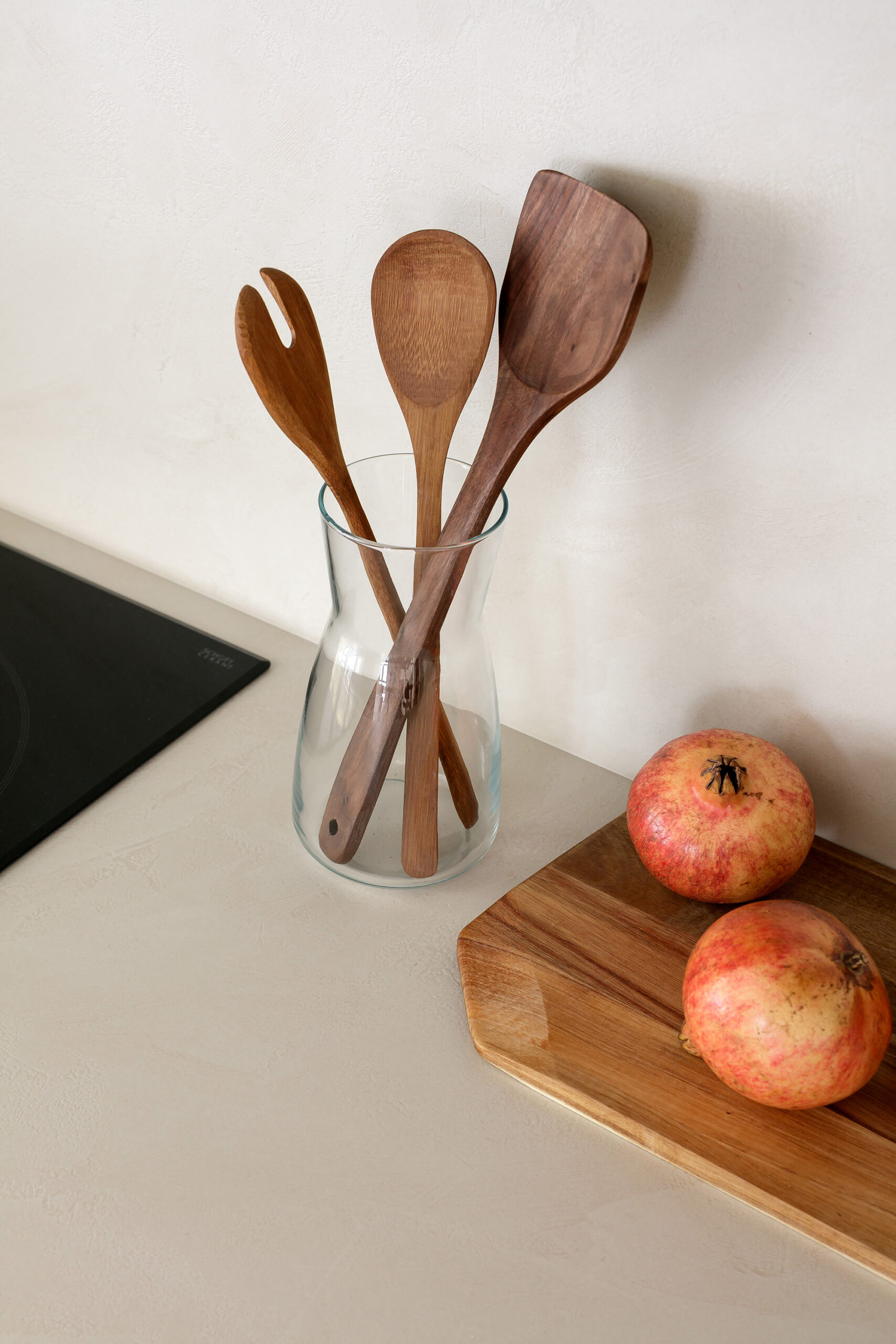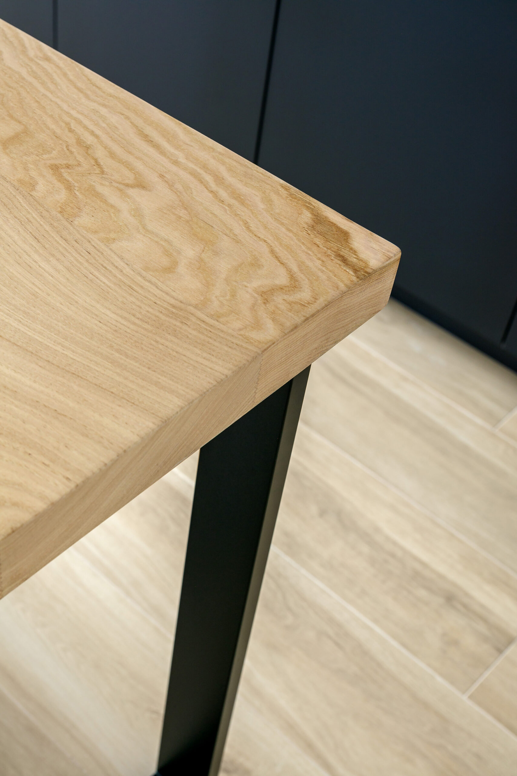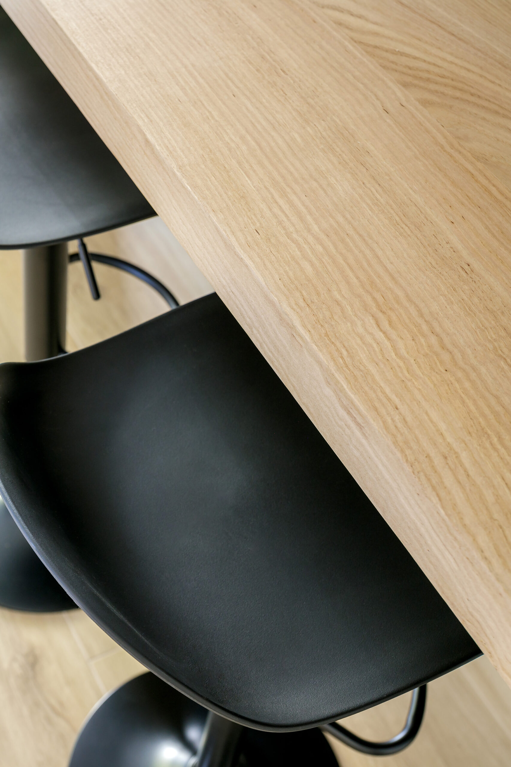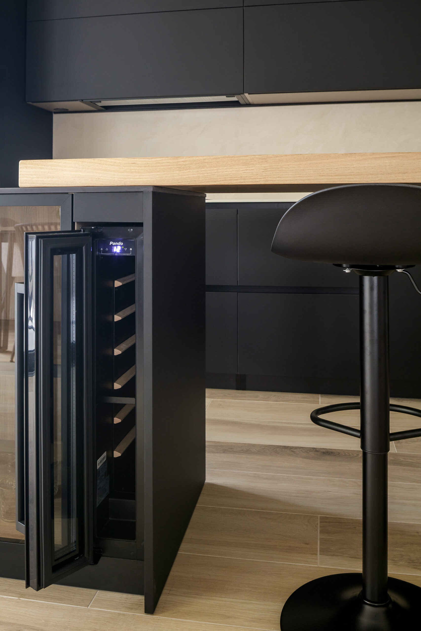 El proyecto culmina con una isla central que articula la transición hacia la zona de estar. En su cara exterior incorpora una vitrina decorativa con interior en madera y una vinoteca, aportando calidez y un punto de interés visual. Sobre ella descansa una barra de castaño natural de 60 mm en acabado mate, apoyada en una estructura metálica en forma de U y acompañada de taburetes negros. La superficie de la isla en Dekton Domoos completa un conjunto equilibrado, preciso y coherente con el diseño contemporáneo del proyecto.