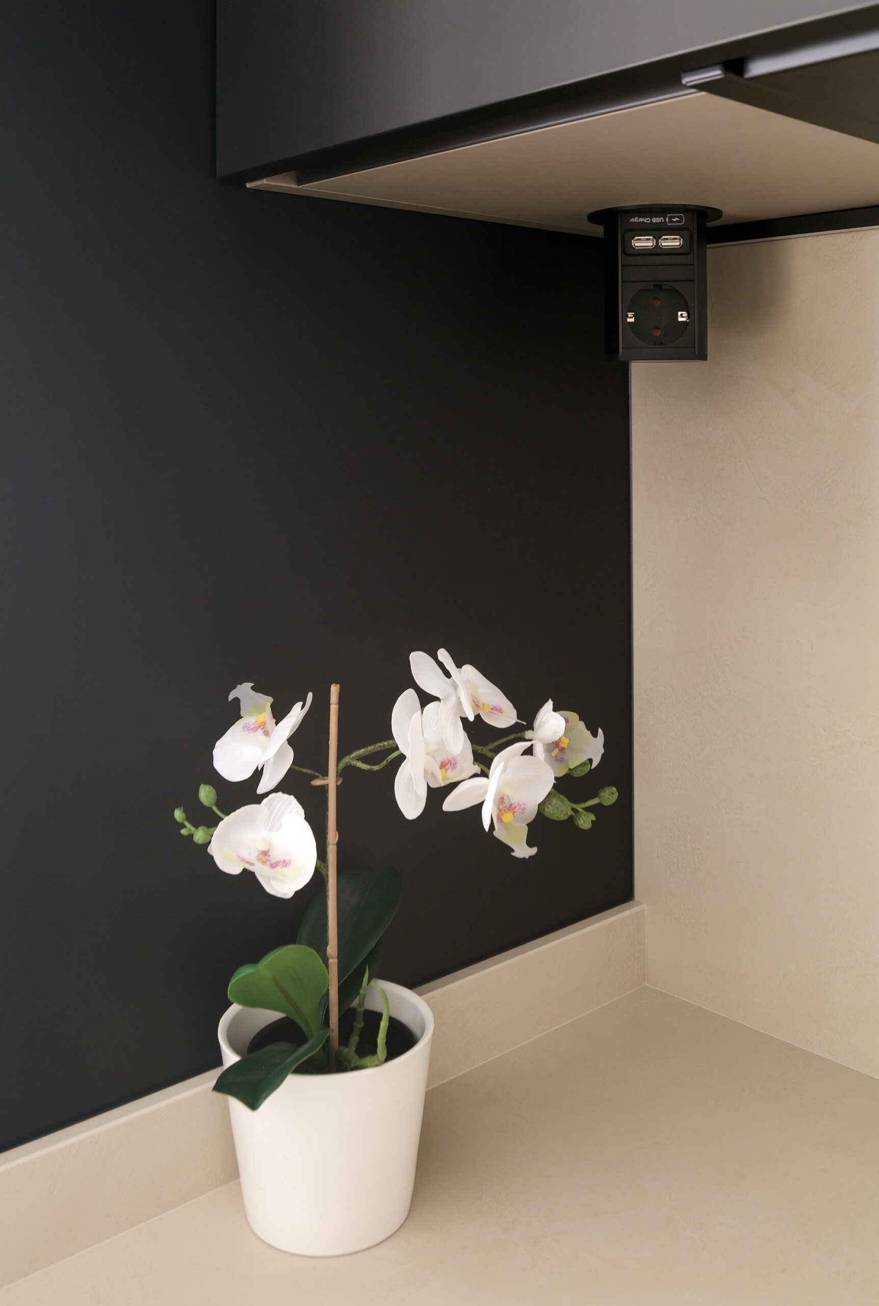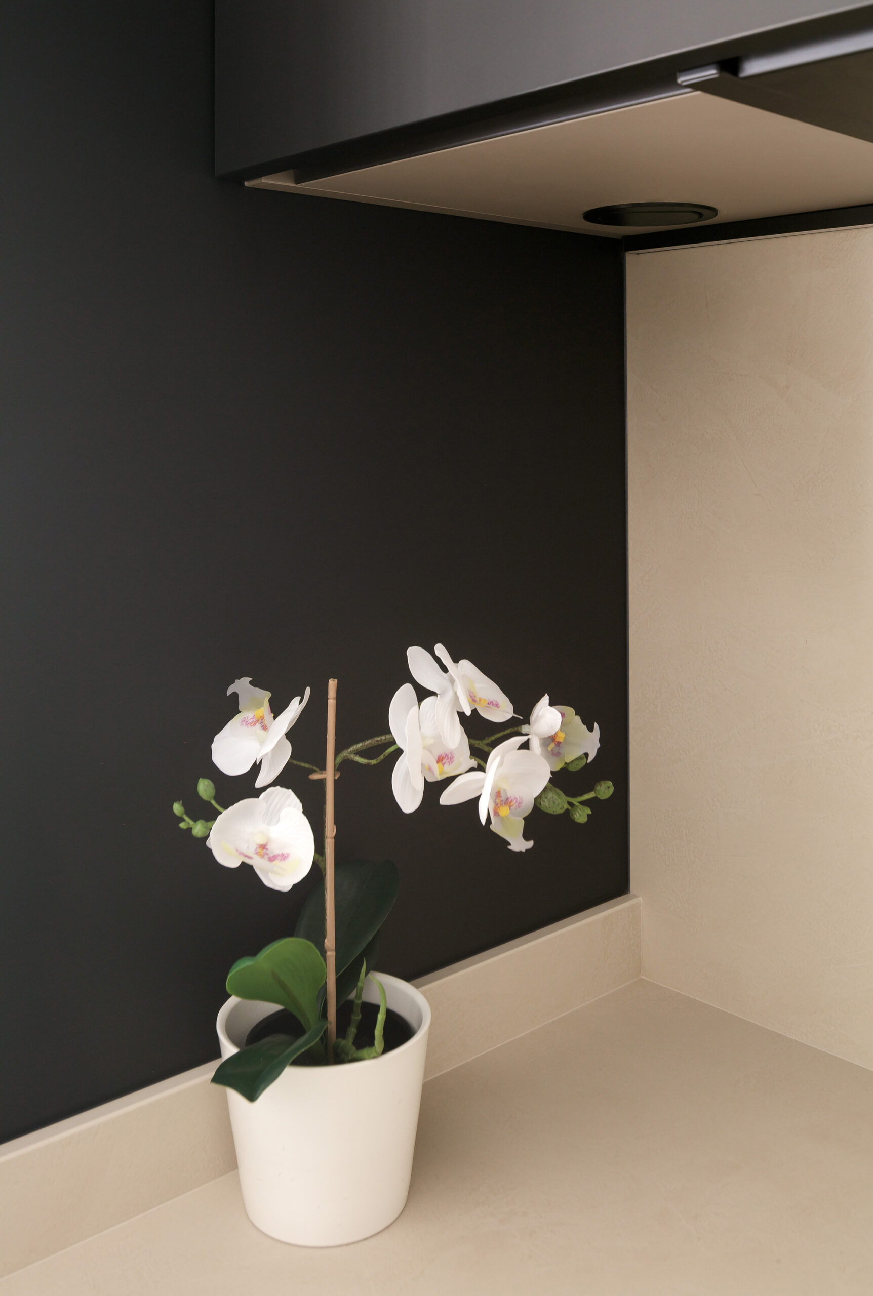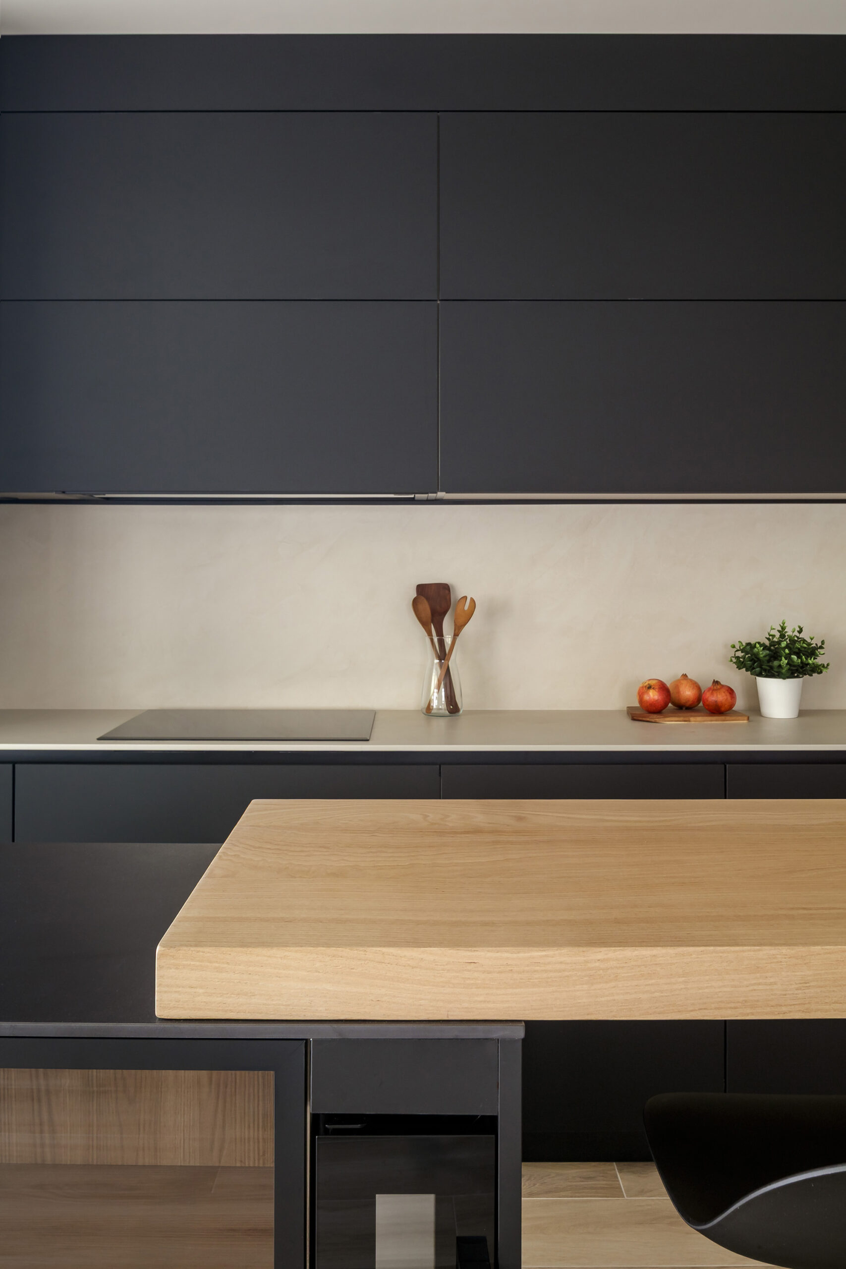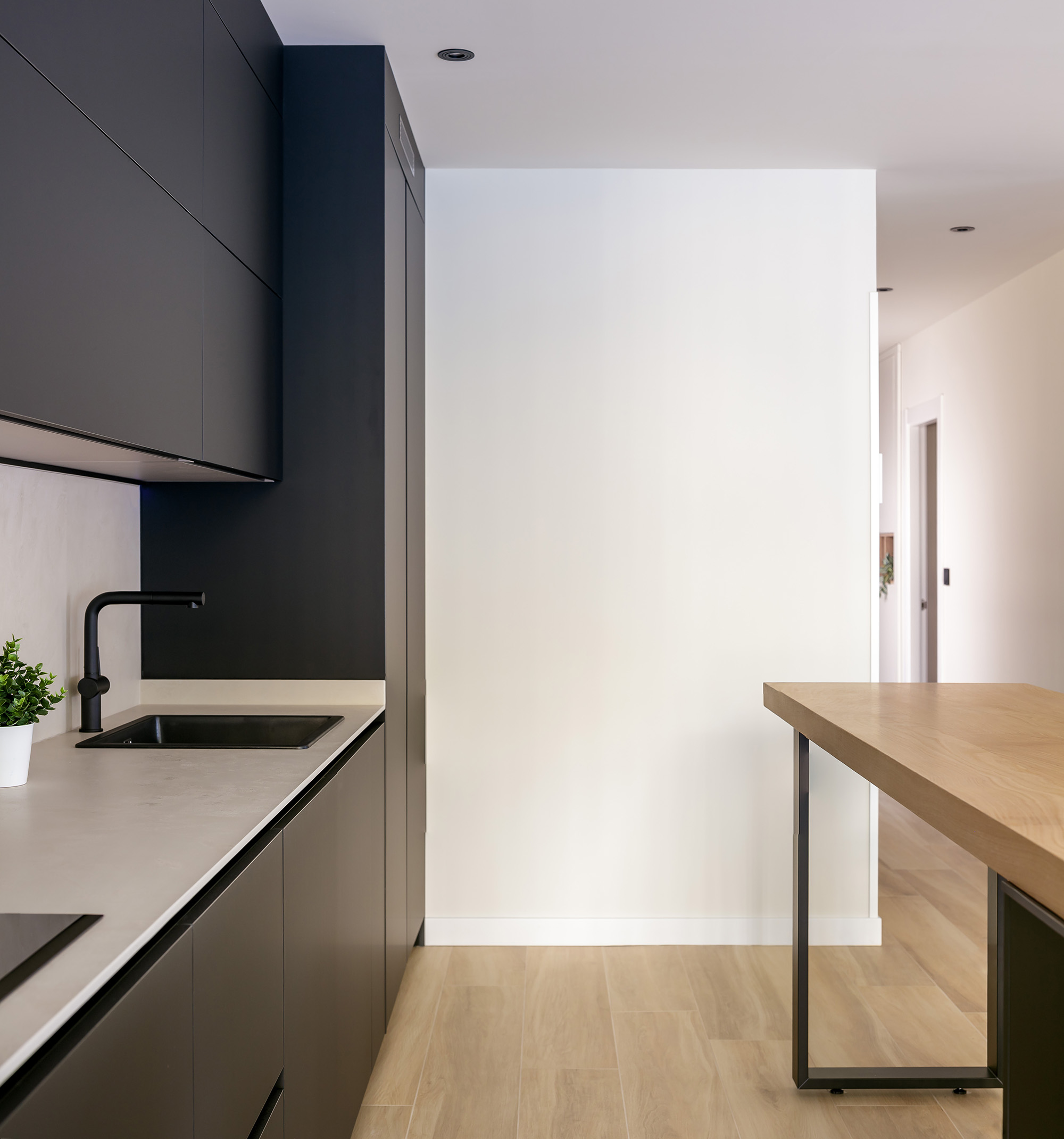 La linealidad del diseño se refuerza con la continuidad de los muebles altos, que aportan proporción y capacidad de almacenaje sin alterar la serenidad visual del conjunto. La textura mate del mobiliario contrasta sutilmente con el tono claro de la encimera, generando un equilibrio que favorece la integración con el salón. La disposición paralela garantiza recorridos cómodos y una lectura arquitectónica clara, adaptada al uso diario y al carácter abierto del espacio.