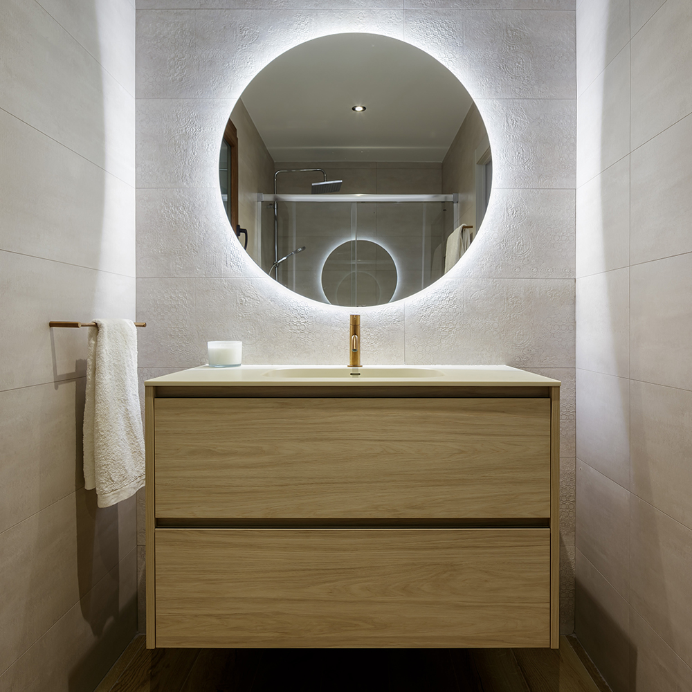 Los armarios, en laminado crudo con interior en roble Amazona, y las puertas de paso Kandisky lacadas en Argila, mantienen la coherencia cromática del conjunto. En los baños, los muebles Kyrya con encimeras Solid Decor y grifería en cobre mate de ASM Taps completan un interior equilibrado, luminoso y lleno de matices, donde cada detalle ha sido pensado para crear una vivienda funcional, acogedora y coherente en su conjunto.